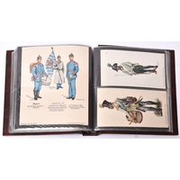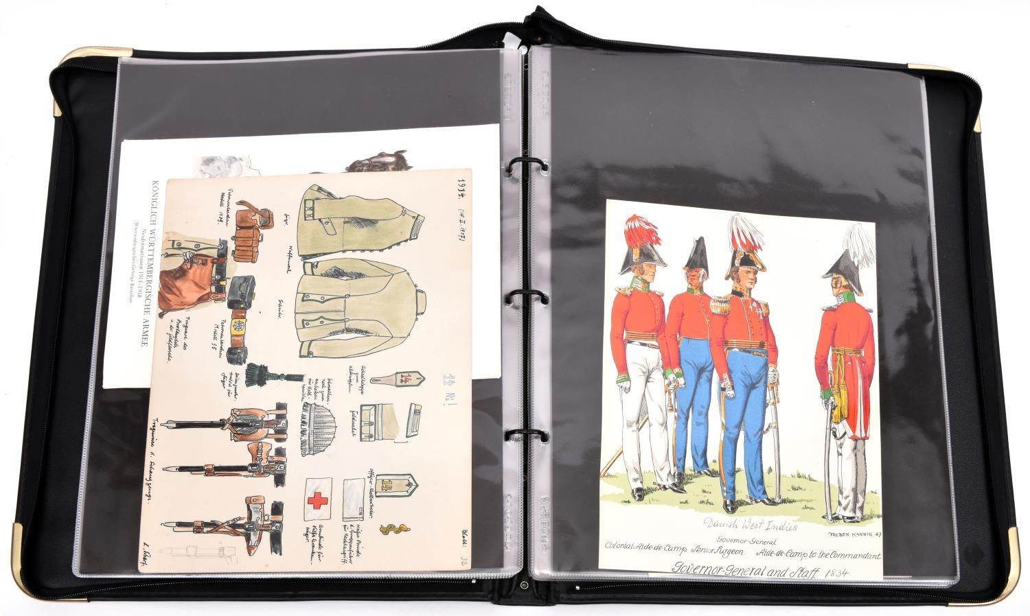 26 sheets of well executed watercolour drawings of pre 1918 German military uniforms, insignia, weapons and equipment, each 12½” x 9½”, signed L. Scharf (?), with detailed descriptions in German. GC, contained in a modern loose leaf plastic sleeve album. £50-80