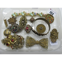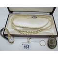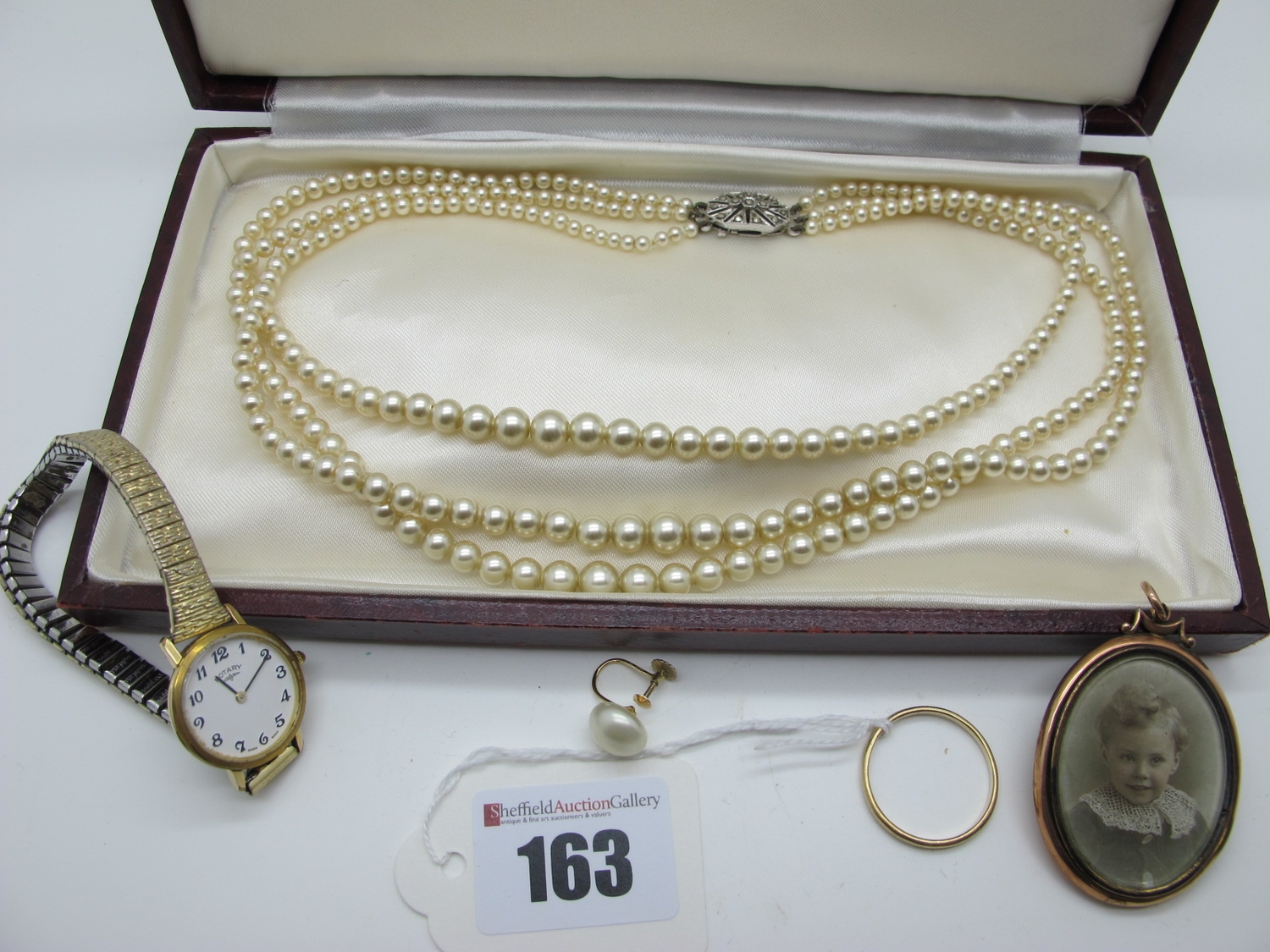 A 9ct Gold Plain Wedding Band, (finger size V); together with an imitation pearl seed necklace, an earring (odd); and an oval locket panel pendant, with glazed front and verso; a ladies Rotary wristwatch.