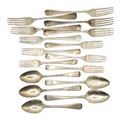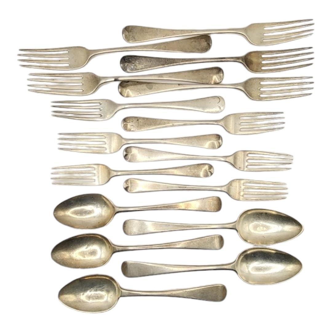 Comprising a silver spoon, hallmarked Richard Crossley, London, 1799, silver spoon, hallmarked Solomon Hougham, London, 1816, silver spoon, hallmarked William Chawner II, London, 1816, silver spoon, hallmarked William Eley I, William Fearn & William Chawner, London, 1807, silver spoon, hallmarked Christopher & Thomas Wilkes Barker, London, 1802, a pair of silver forks, hallmarked Charles Eley, London, 1825, a pair of silver forks, hallmarked William Eley I, William Fearn & William Chawner, London, 1810, silver fork, hallmarked William Eley I & William Fearn, London, 1821, silver fork, hallmarked Thomas Wilkes Barker, London, 1811, silver fork, hallmarked Paul Storr, London, 1821. silver fork, hallmarked London, 1806 and silver fork, hallmarked James Dixon & Sons Ltd, Sheffield, 1961.