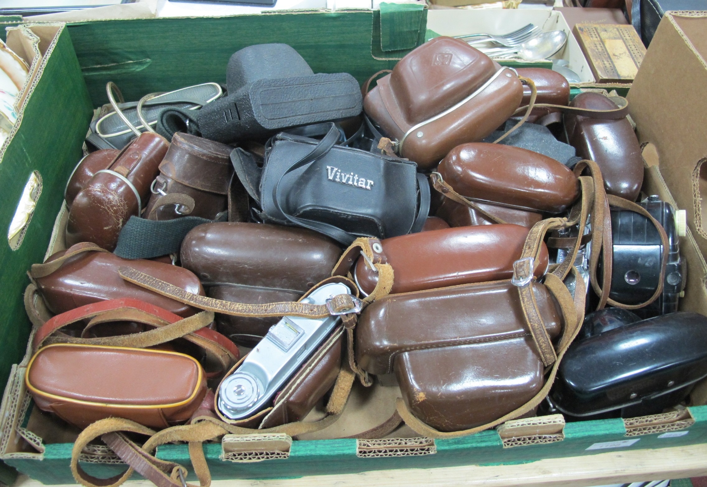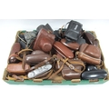 A large collection of vintage 35mm SLR film cameras to include Minolta SR-1 with 55mm f/1.8 lens and Minolta SR Meter attached, others from Zeiss Ikon, Vivitar, Kodak etc. One Box [691051]