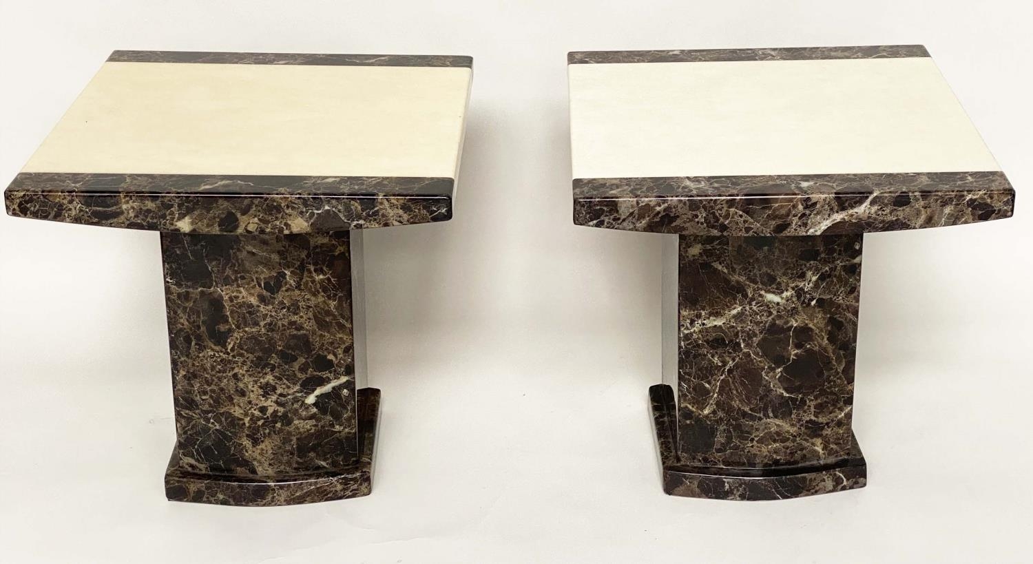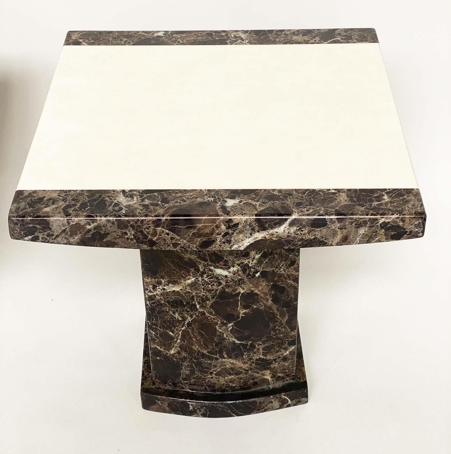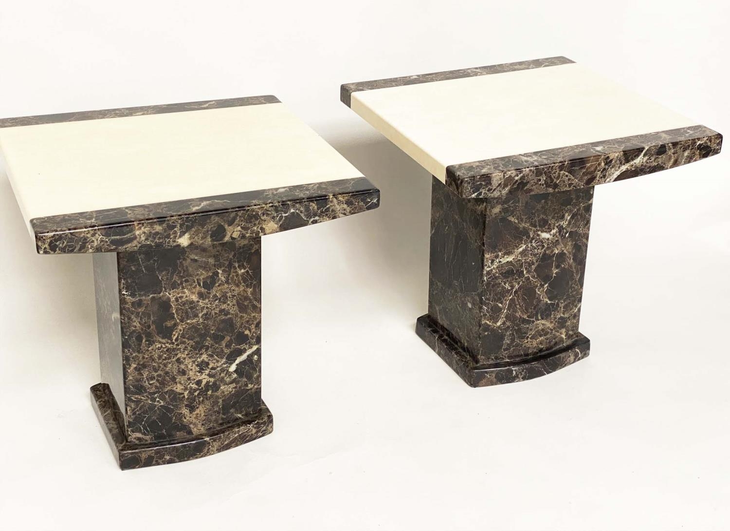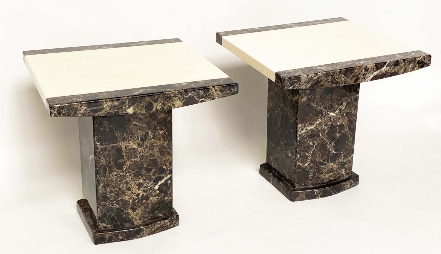 LAMP TABLES, a pair, variegated and cream polished marble each bicolour with plinth supports, 55cm x 55cm x 55cm H. (2)