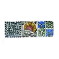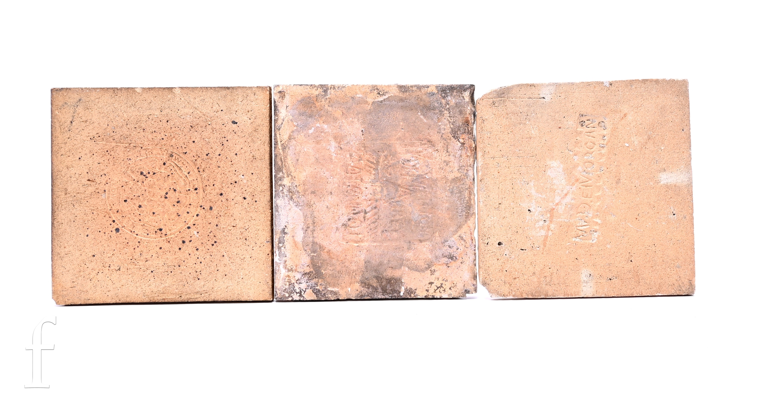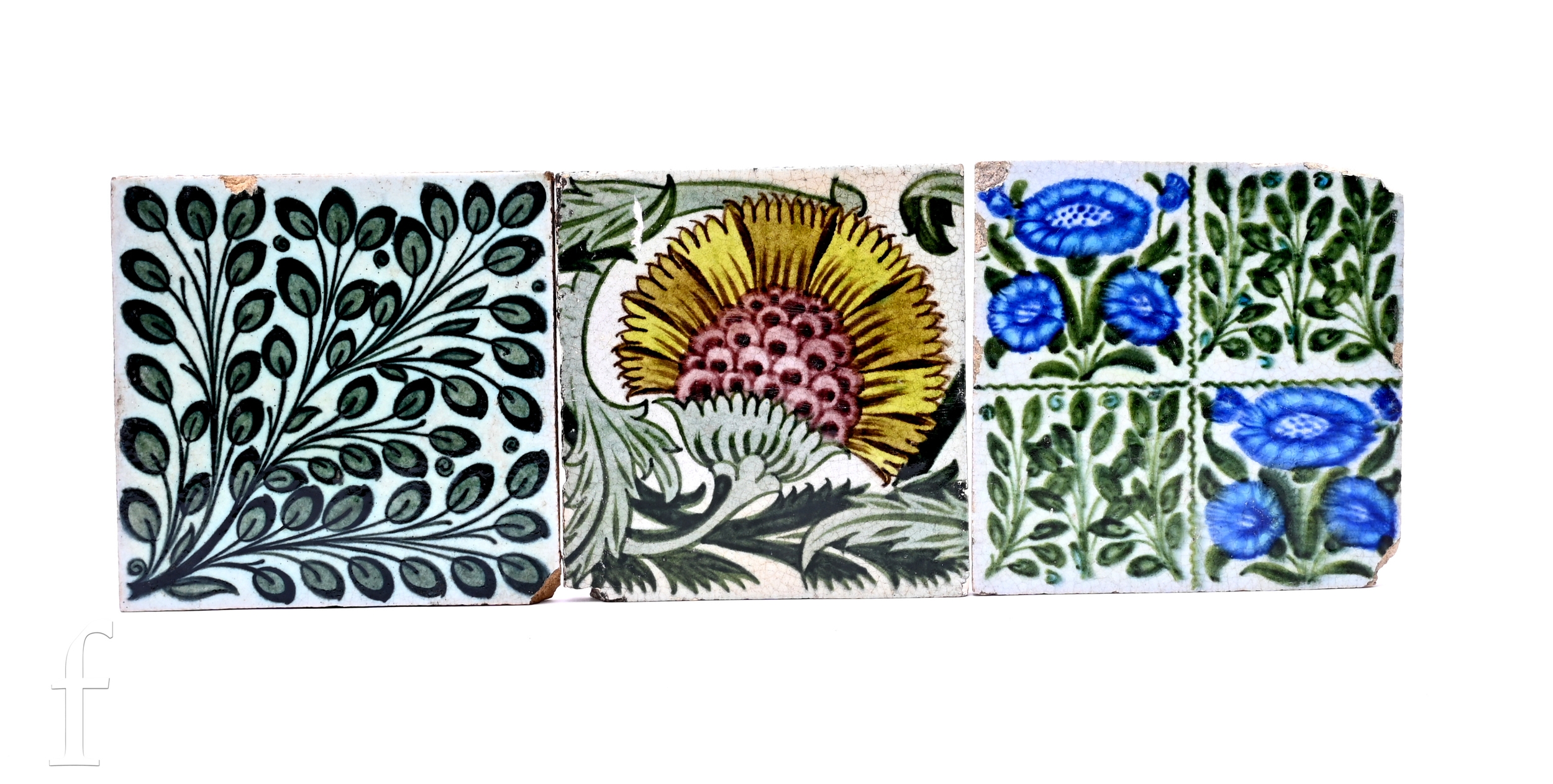 William De Morgan for Merton Abbey Pottery, an Arts and Crafts plastic clay BBB tile, stamped mark to reverse 15.5 x 14.5, together with a Chelsea Period William De Morgan 'Bedford Park Daisy' painted tile, quarter panels decorated with stemmed blue flower heads and leafy stems and an 'Oblique' tile, circa 1875, Sands End mark. (3)