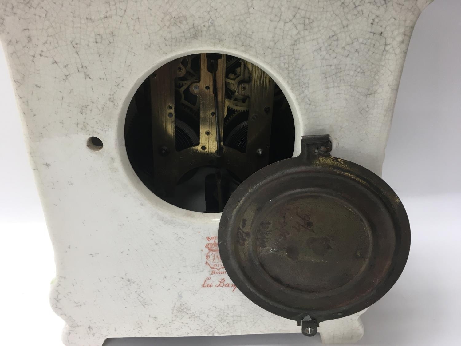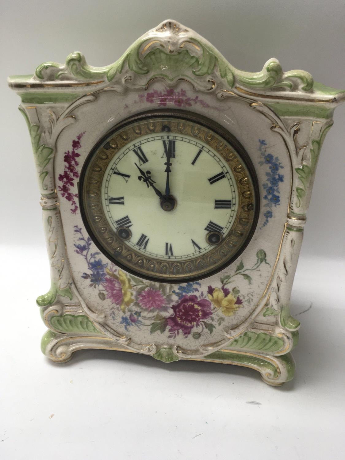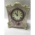 A Edwardian mantel clock with pottery floral case the circular dial with Roman numerals.