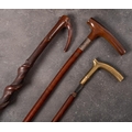 A silver mounted Plantation walking stick: (assay rubbed) together with a bras handled walking stick inscribed 'Col C M Hoskyn CBE DSO', the screw brass tip enclosing a steel ground spike and a natural stick of writhen form (3) *Note - Chandos Benedict Arden Hoskyns (1895-1940) served with the Rifle Brigade on the Western Front and Salonika during WWI. After serving in India and Malta between the wars, in WWII he was in command of a battalion during the siege of Calais ,1940 where he was mortally wounded.