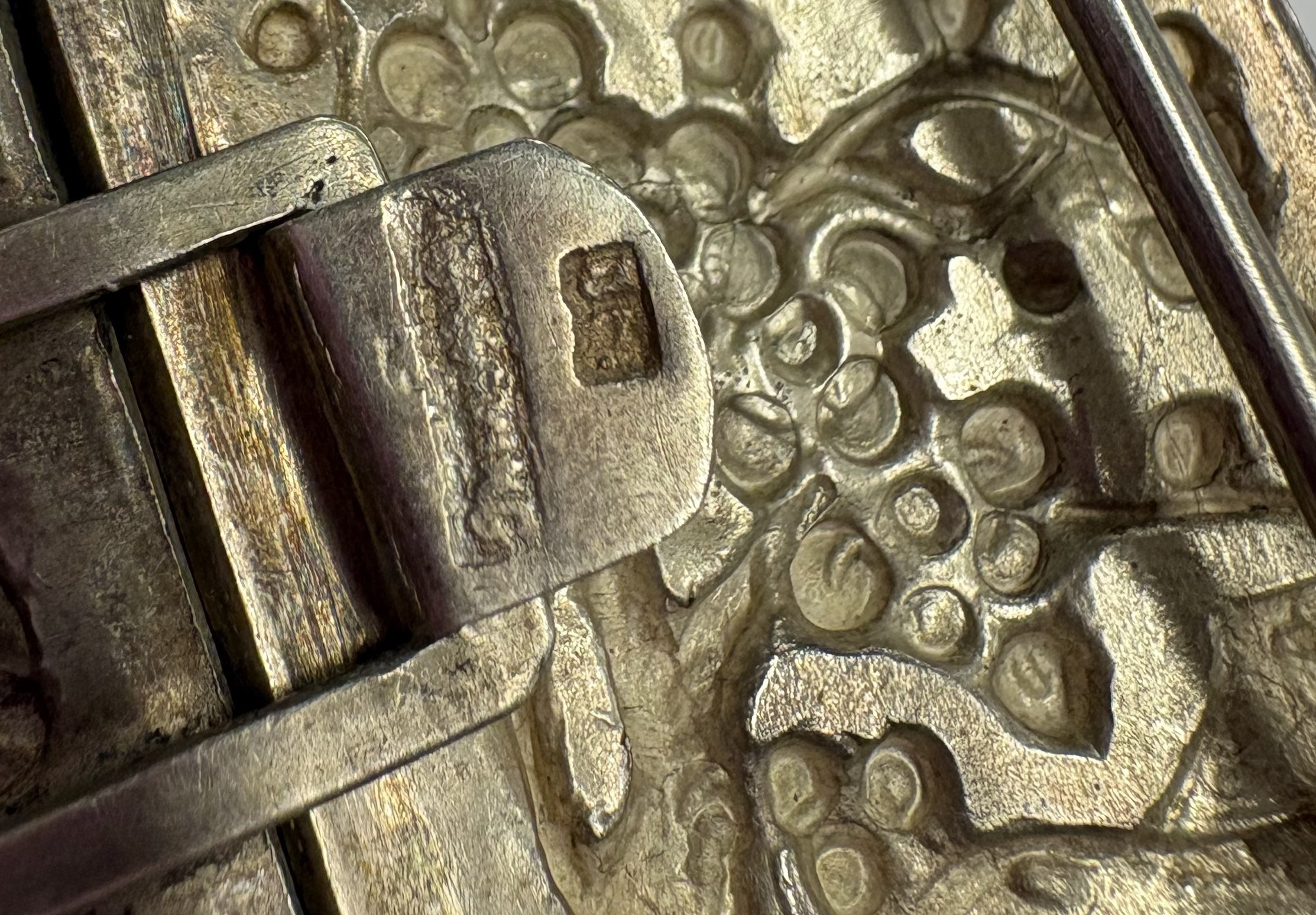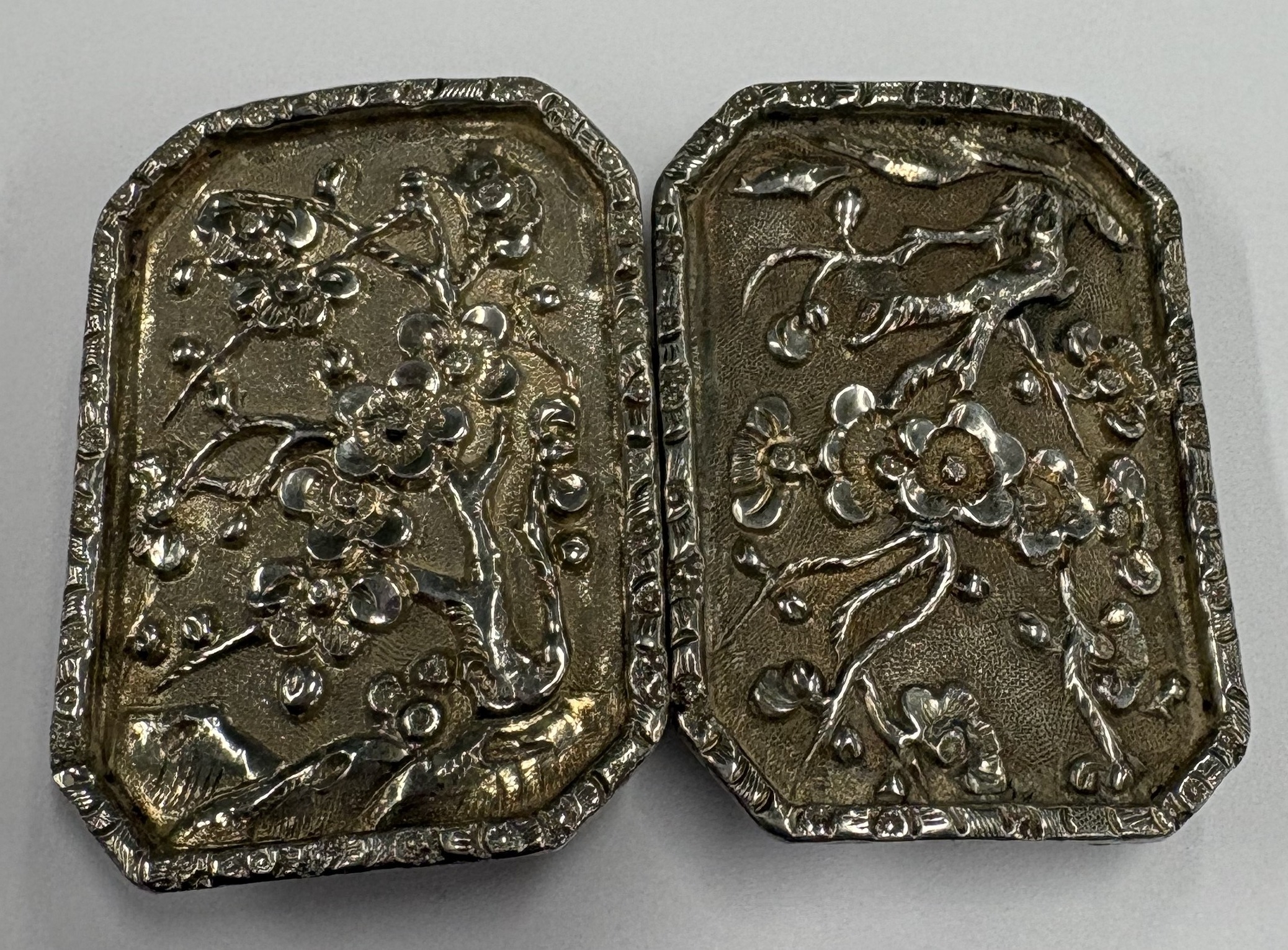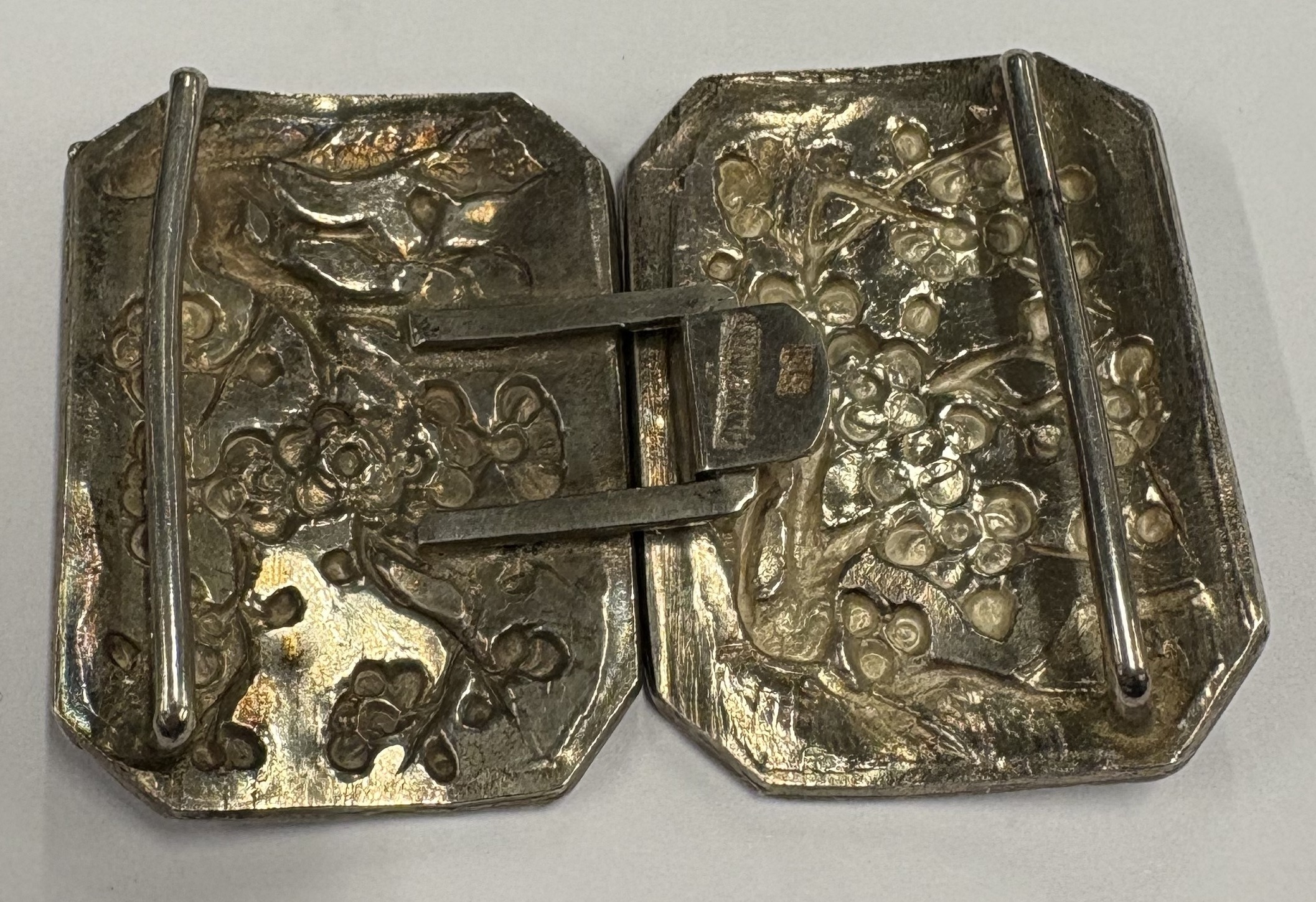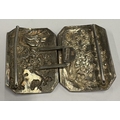 A 19th Century Chinese export silver buckle with chased repousse decoration. Approx. 22 grams. Est. £80 - £120.