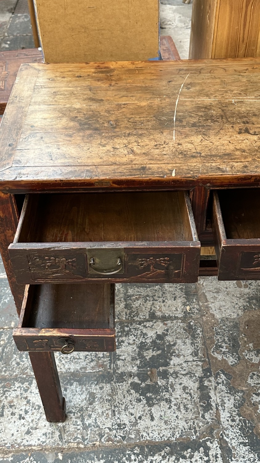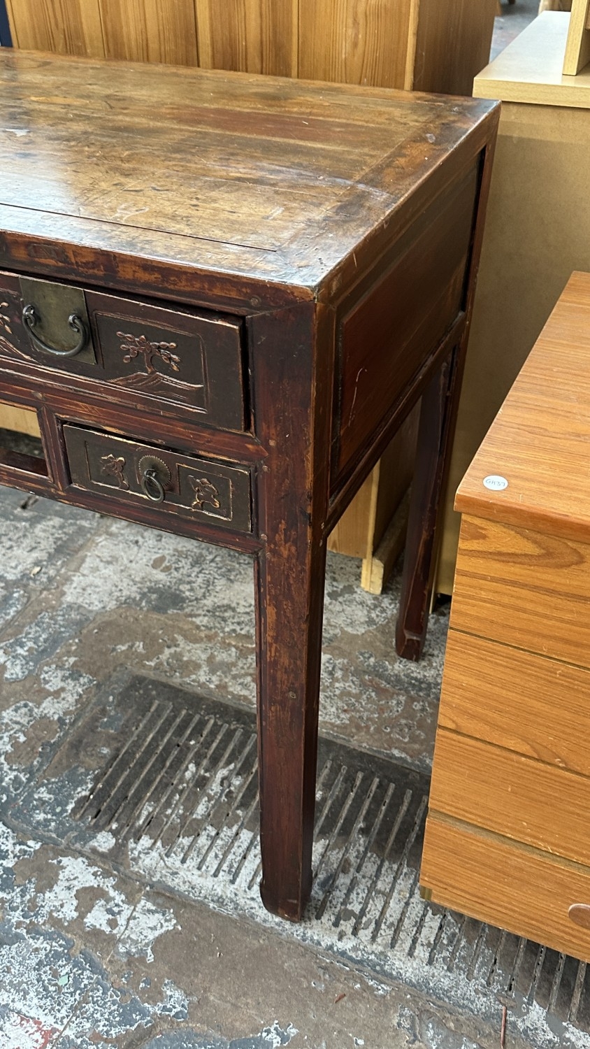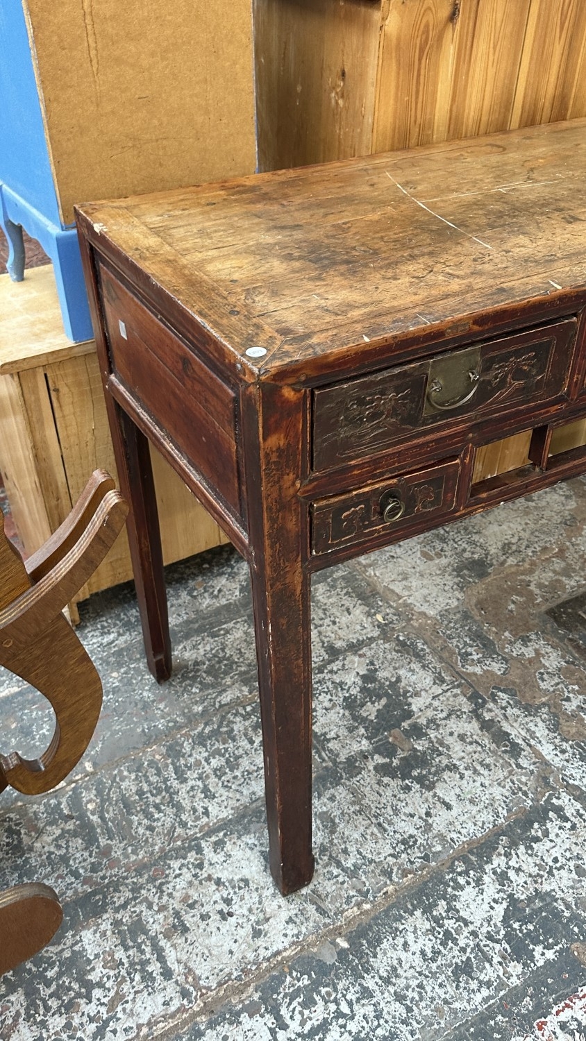 An antique Chinese lacquered carved hardwood console/altar table - approx. 88cm high x 120cm wide x 51cm deep