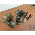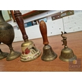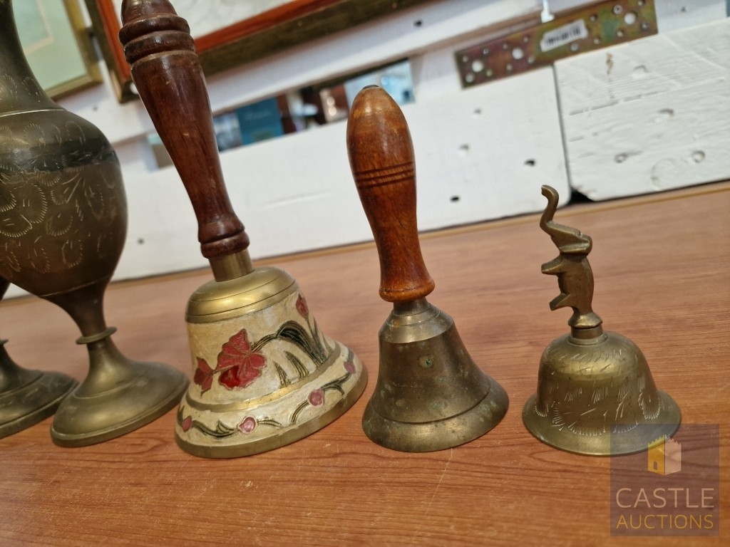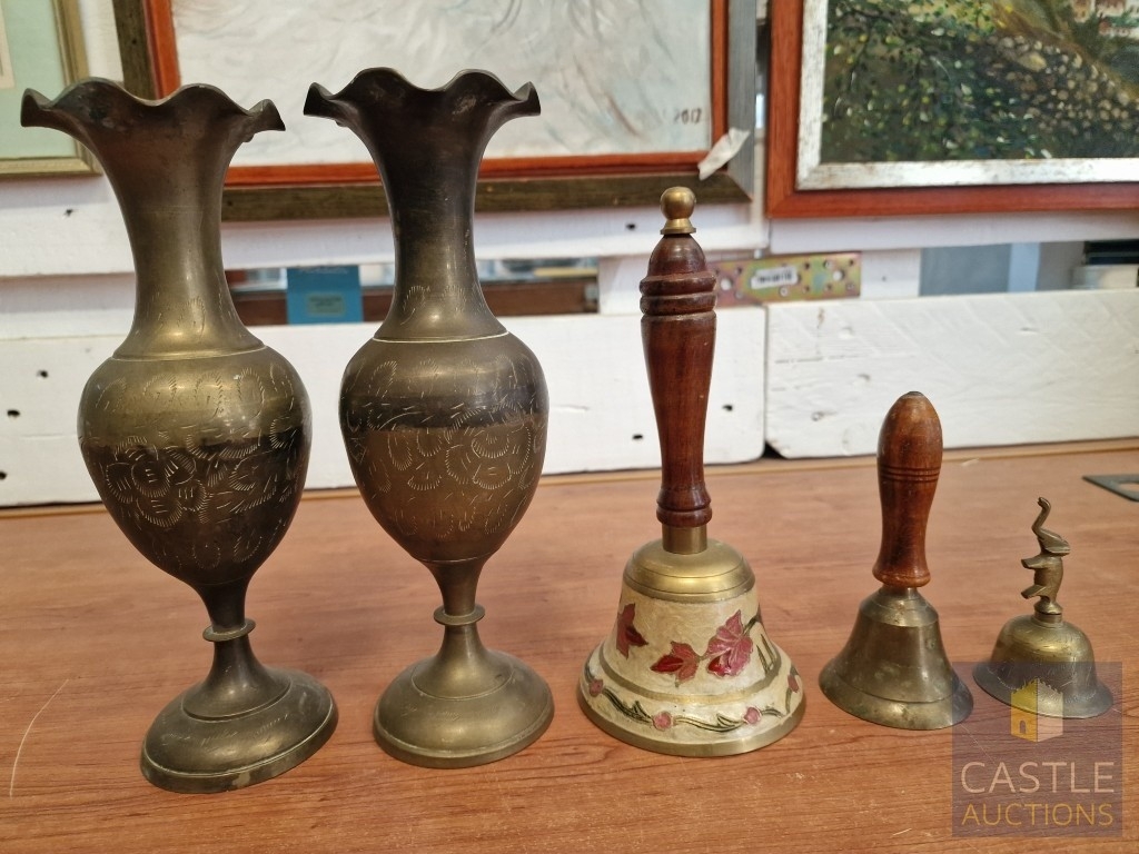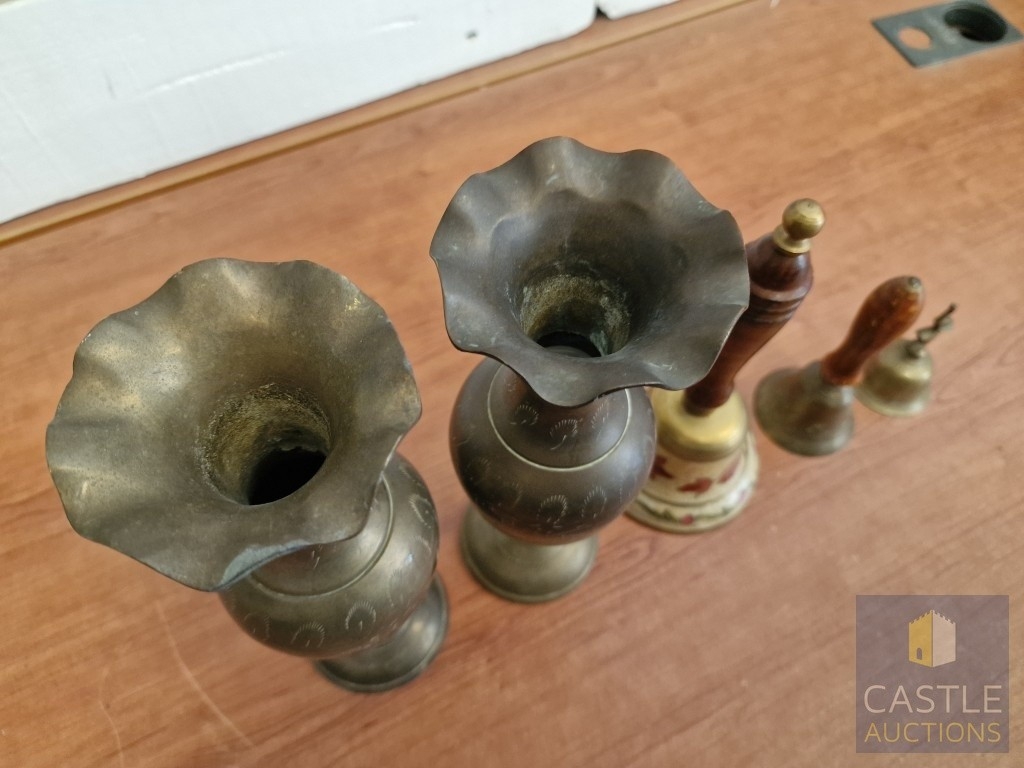 Pair of Brass Vases, Together with 3 x Hand Bells (2 with Turned Wooden Handles), (5)