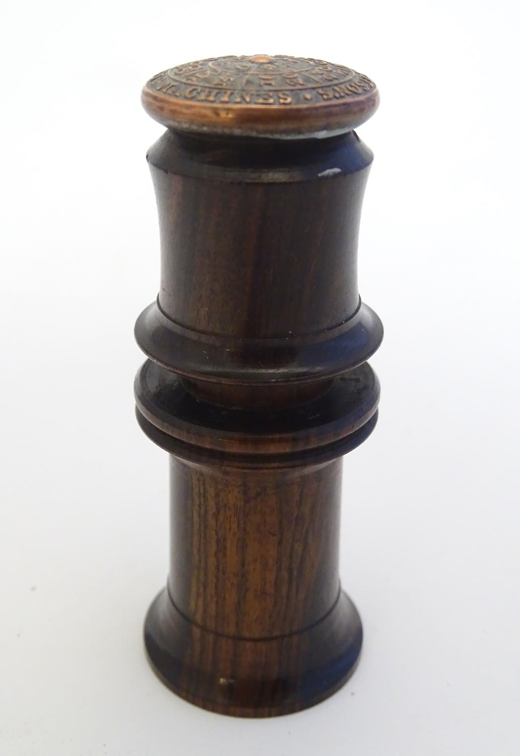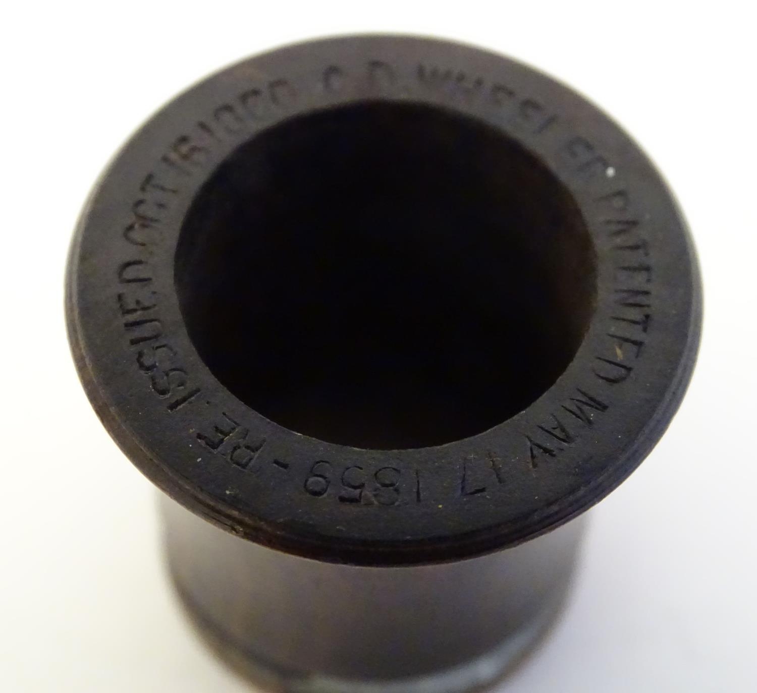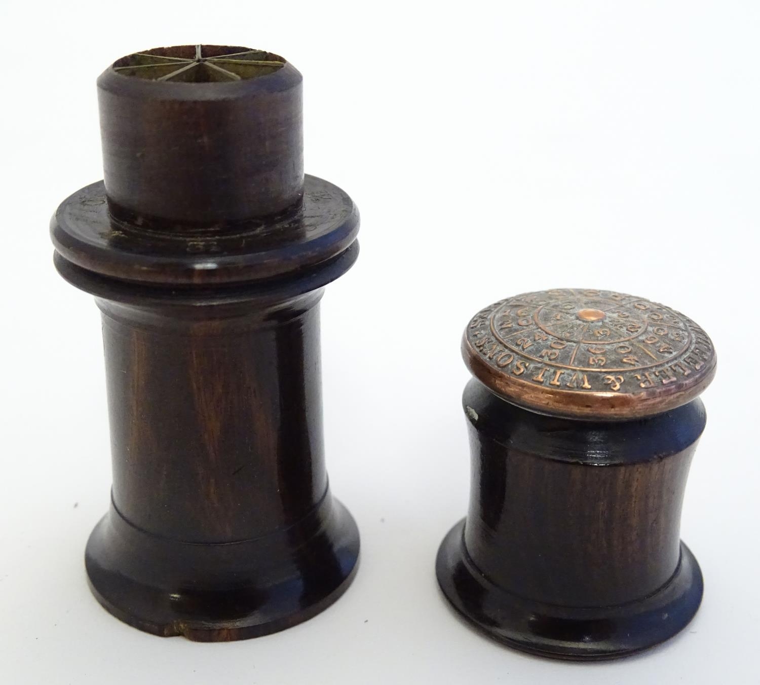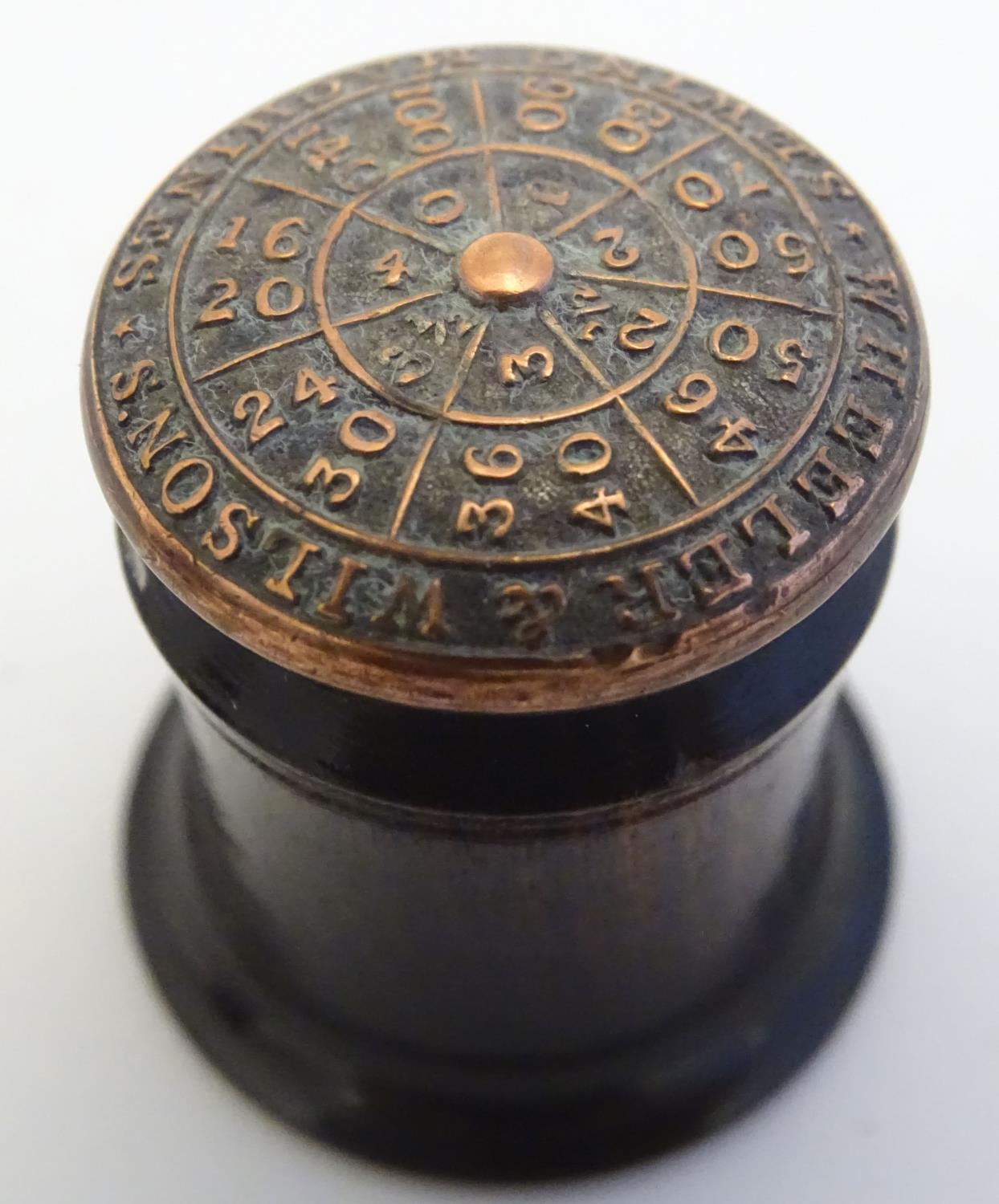 A Victorian Wheeler & Wilson treen sewing machine needle case with 7 divisions for varying sizes. The copper capped top embossed Wheeler & Wilson's Sewing Machines with sizes and divisions, the underside of lid incised C. D. Wheeler Patented May 17 1859 Re-issued Oct 16 1860. Approx. 2 3/4" high