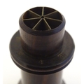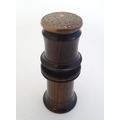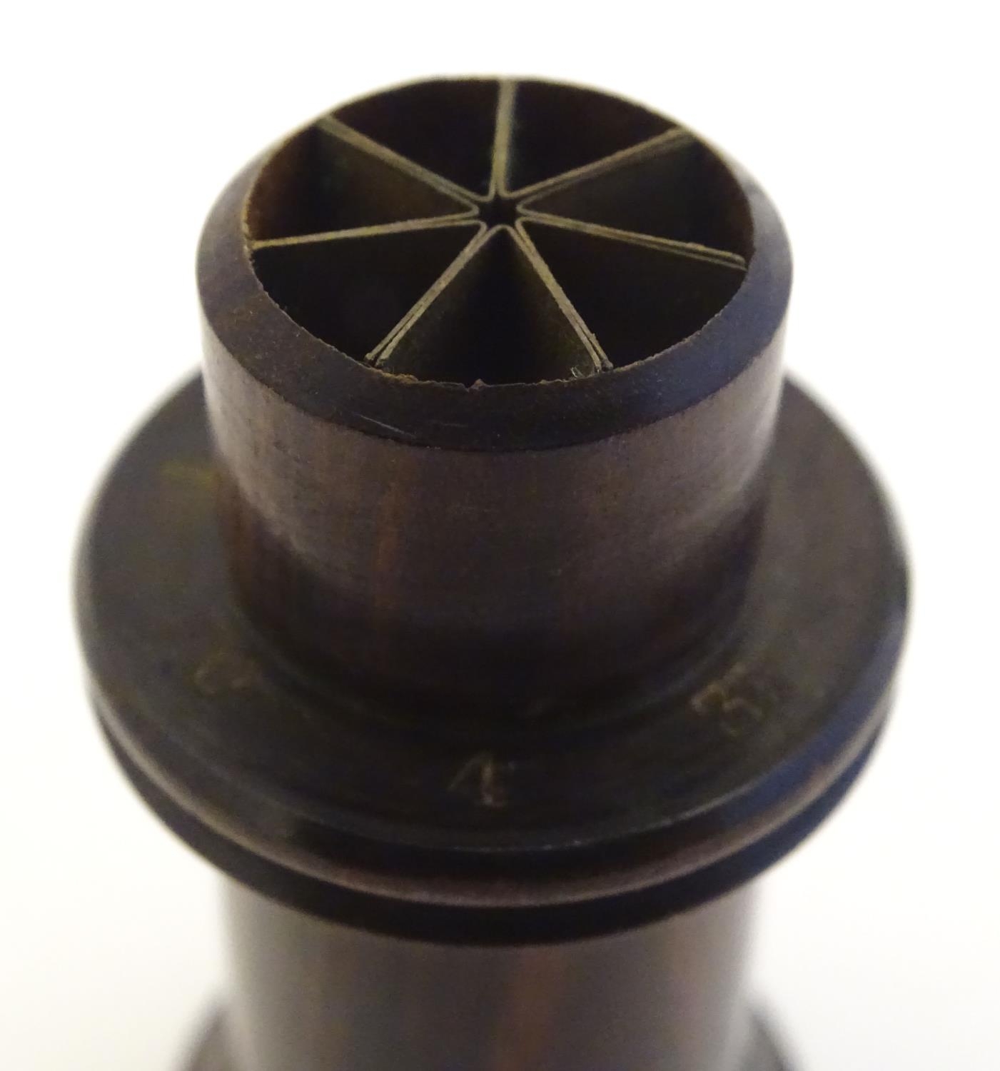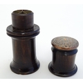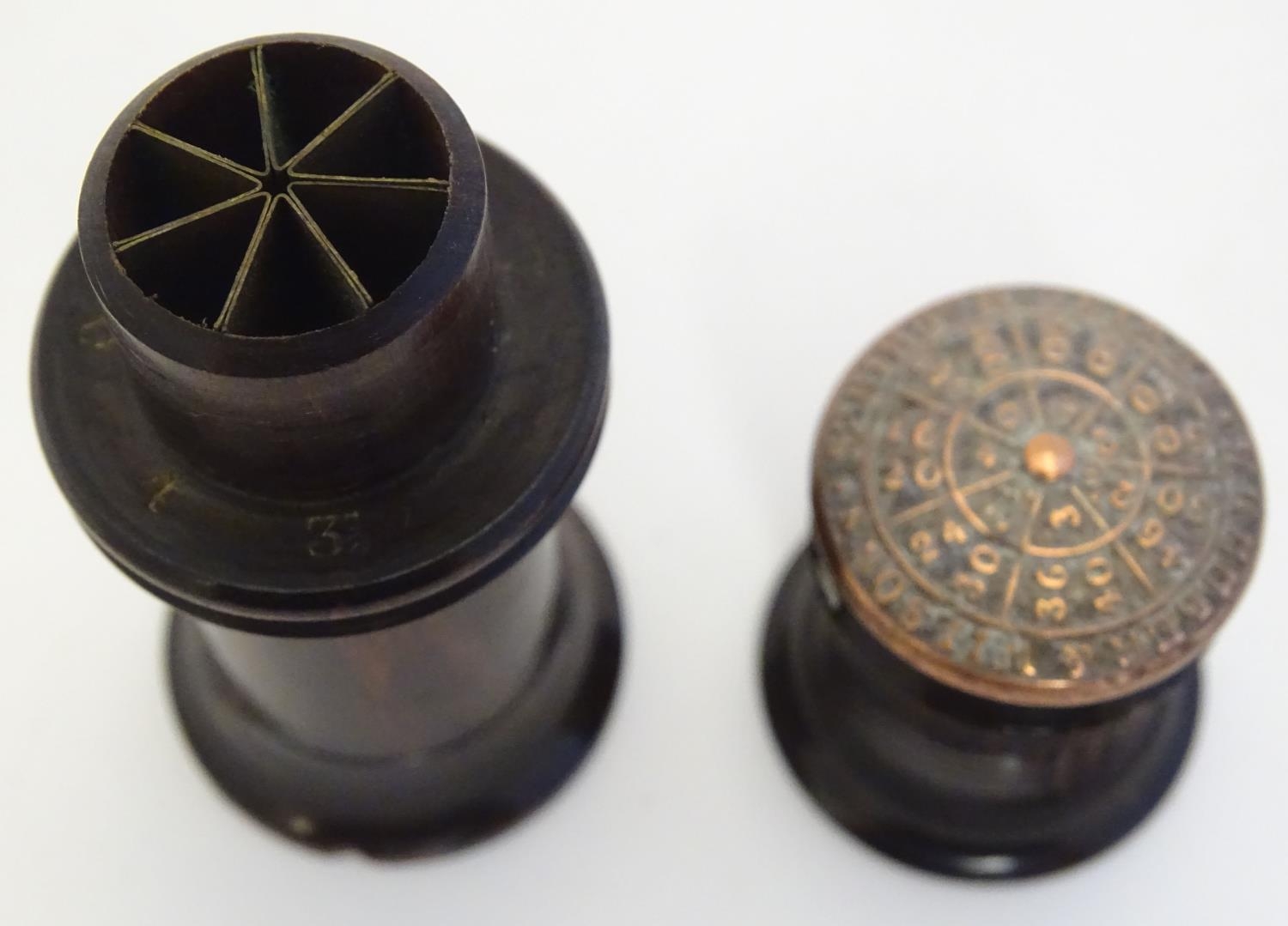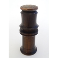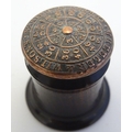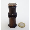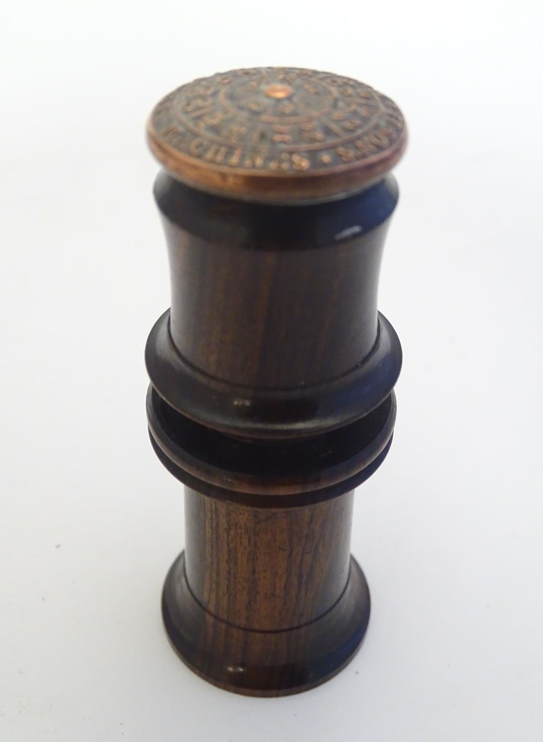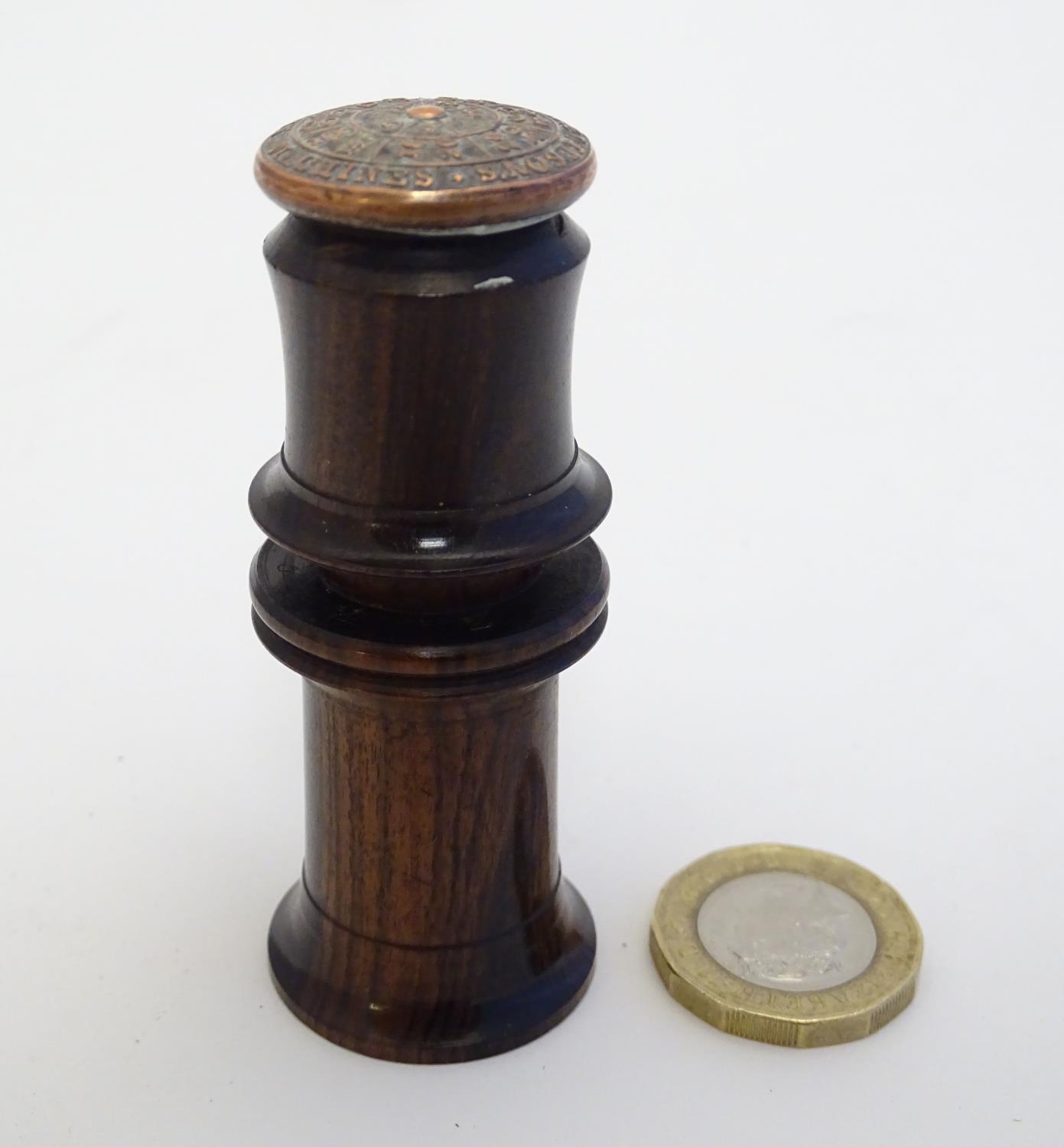 A Victorian Wheeler & Wilson treen sewing machine needle case with 7 divisions for varying sizes. The copper capped top embossed Wheeler & Wilson's Sewing Machines with sizes and divisions, the underside of lid incised C. D. Wheeler Patented May 17 1859 Re-issued Oct 16 1860. Approx. 2 3/4" high