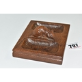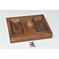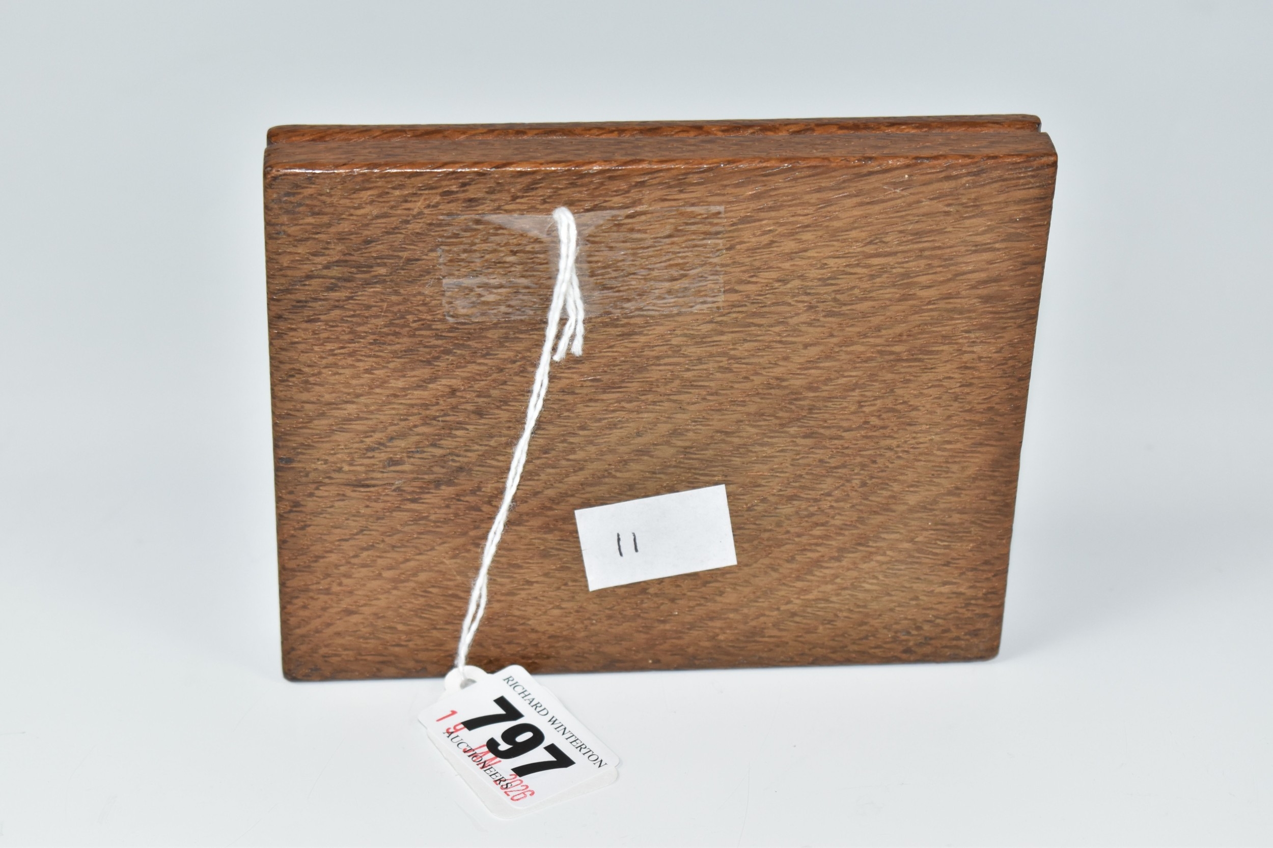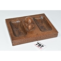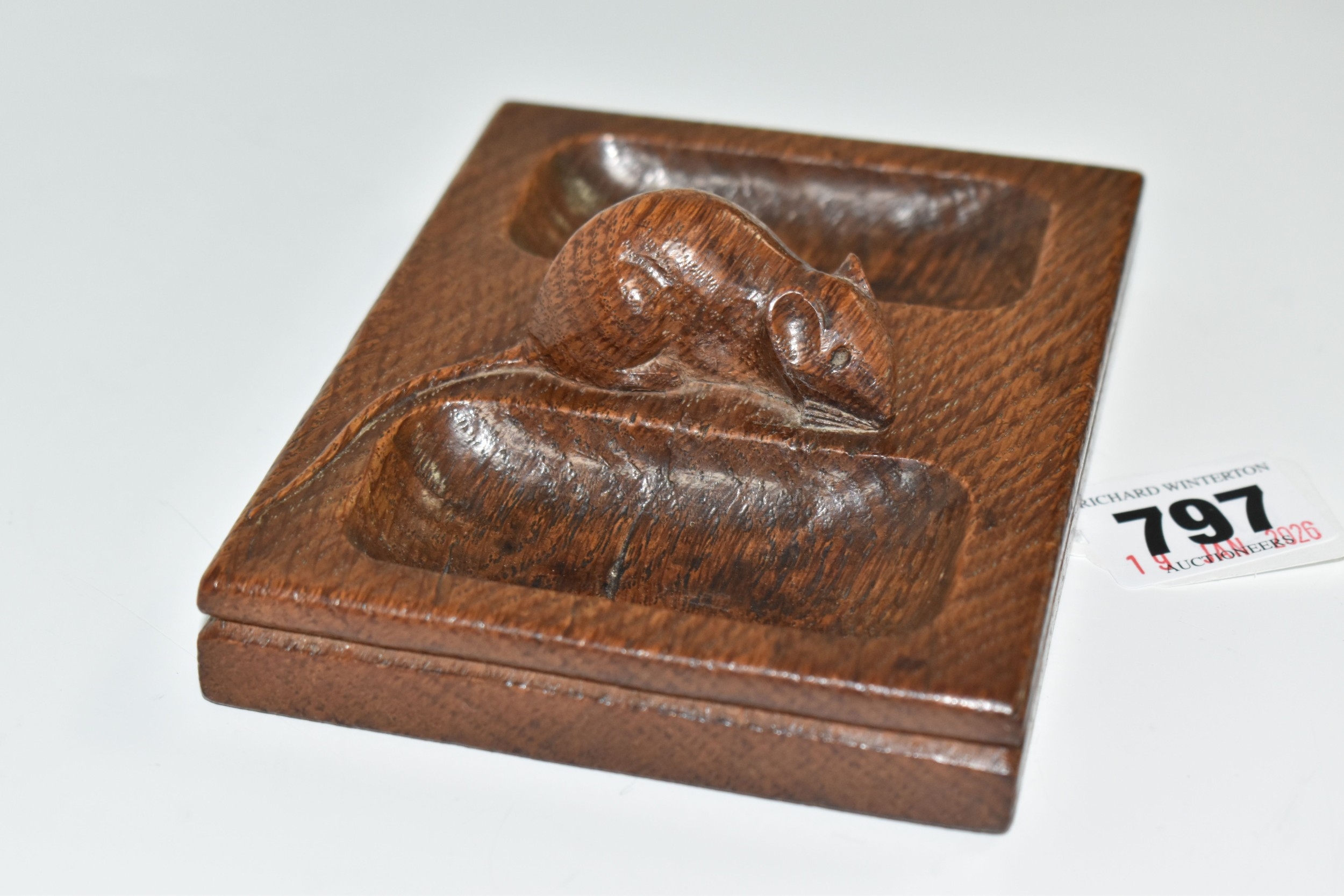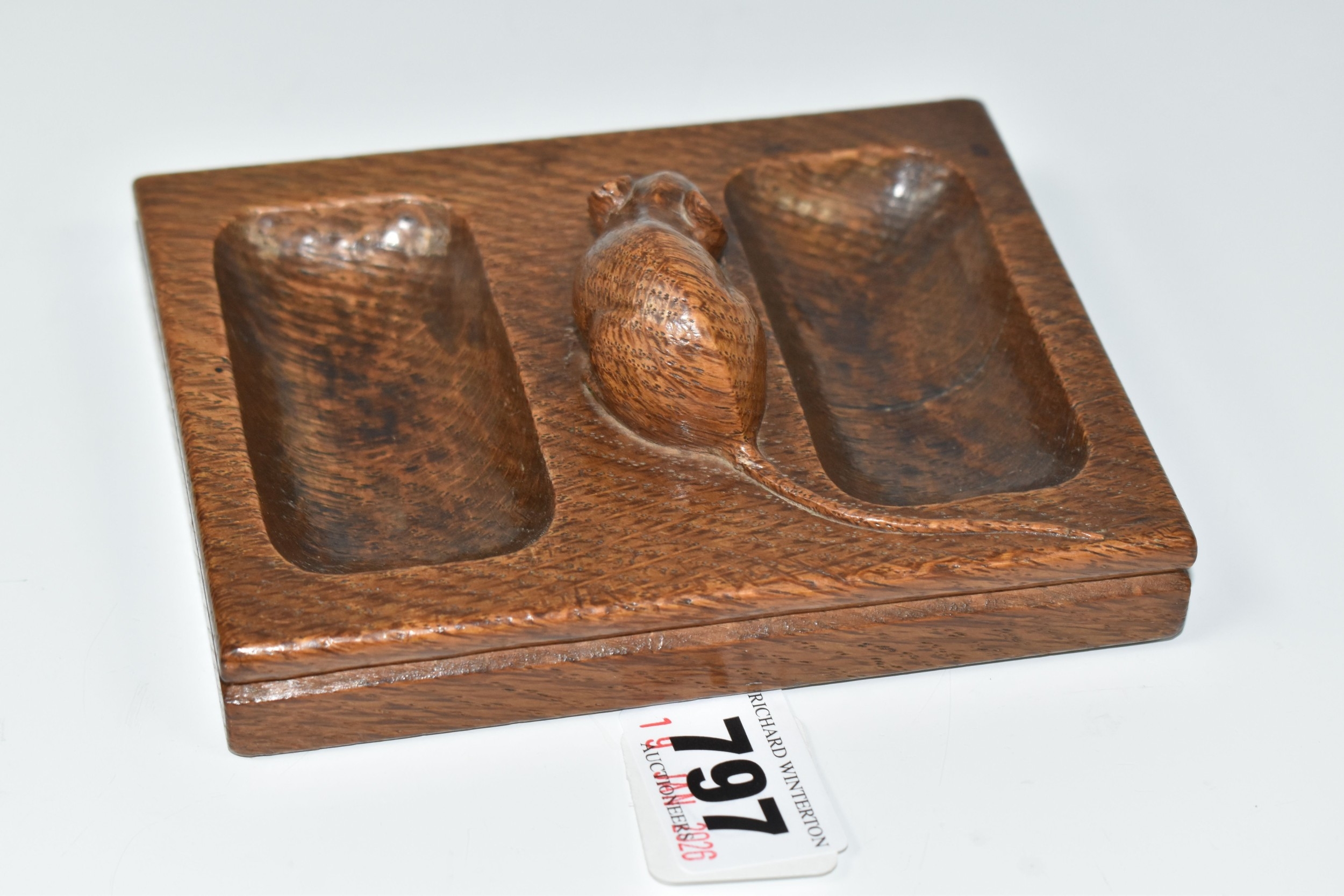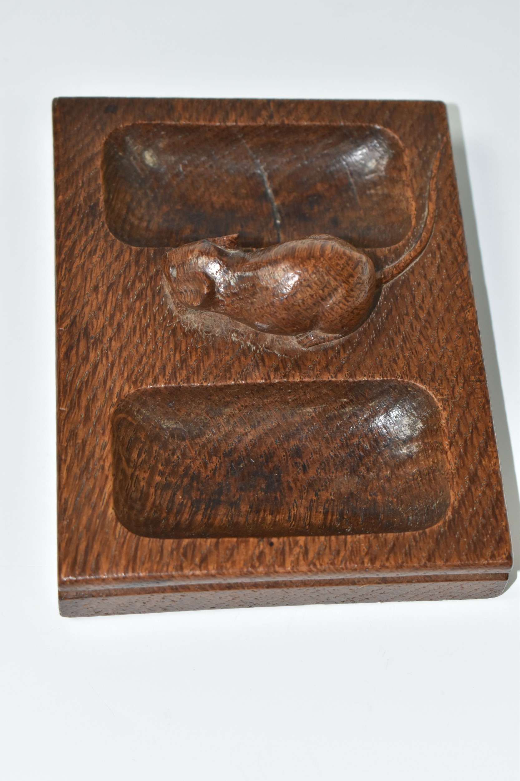 A ROBERT 'MOUSEMAN' THOMPSON OAK DOUBLE PIN TRAY, featuring carved mouse trademark, rectangular form, measuring 12.5cm by 9.5cm, (1), (Condition Report: has been varnished, slight surface scratches and knocks, there is a split to the wood on one side, overall ok)