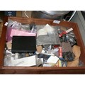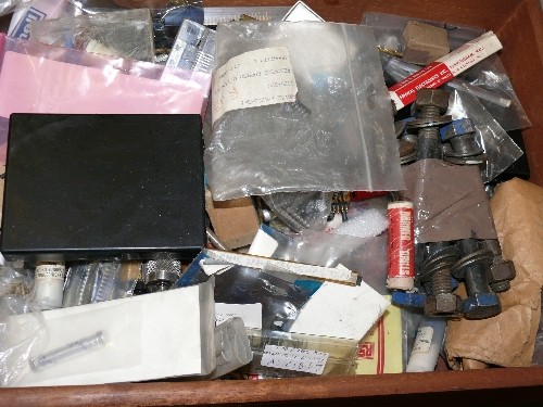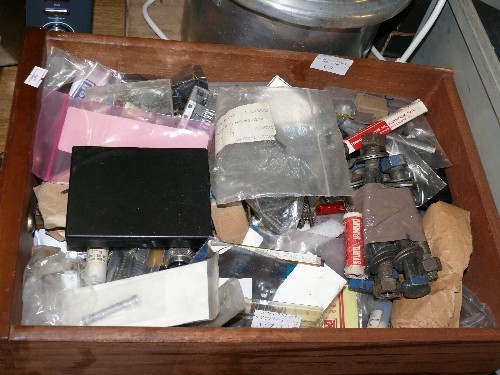 A WOODEN TRAY OF ELECTRONIC COMPONENTS AND HARDWARE.