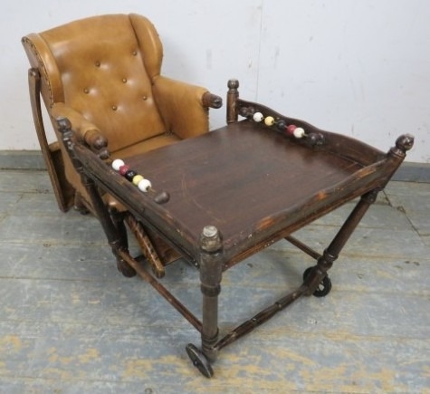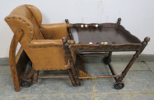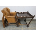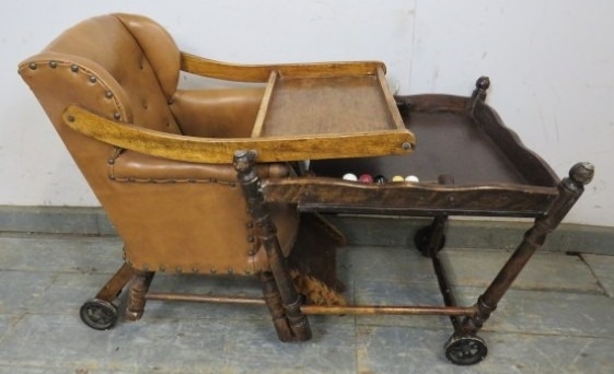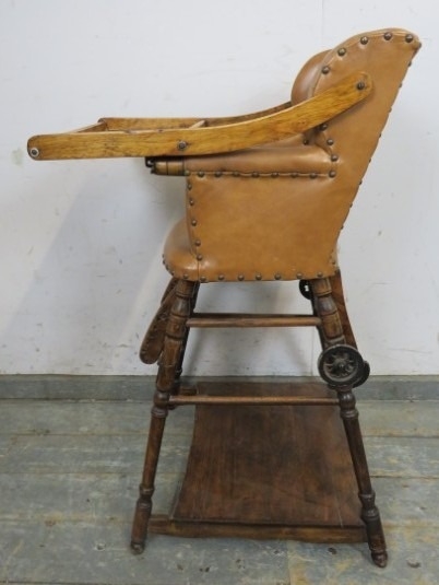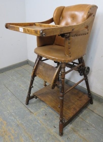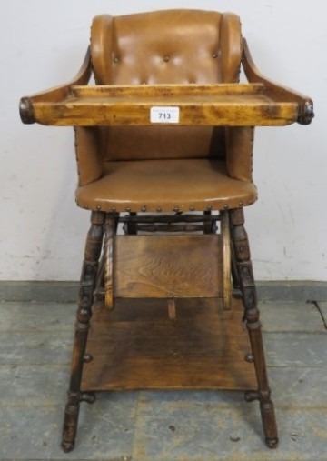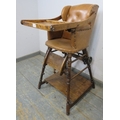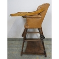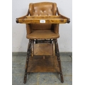 C1900 Child's metamorphic high chair with a tan leatherette upholstered seat over turned legs. H93cm x W50cm x D50cm approx.