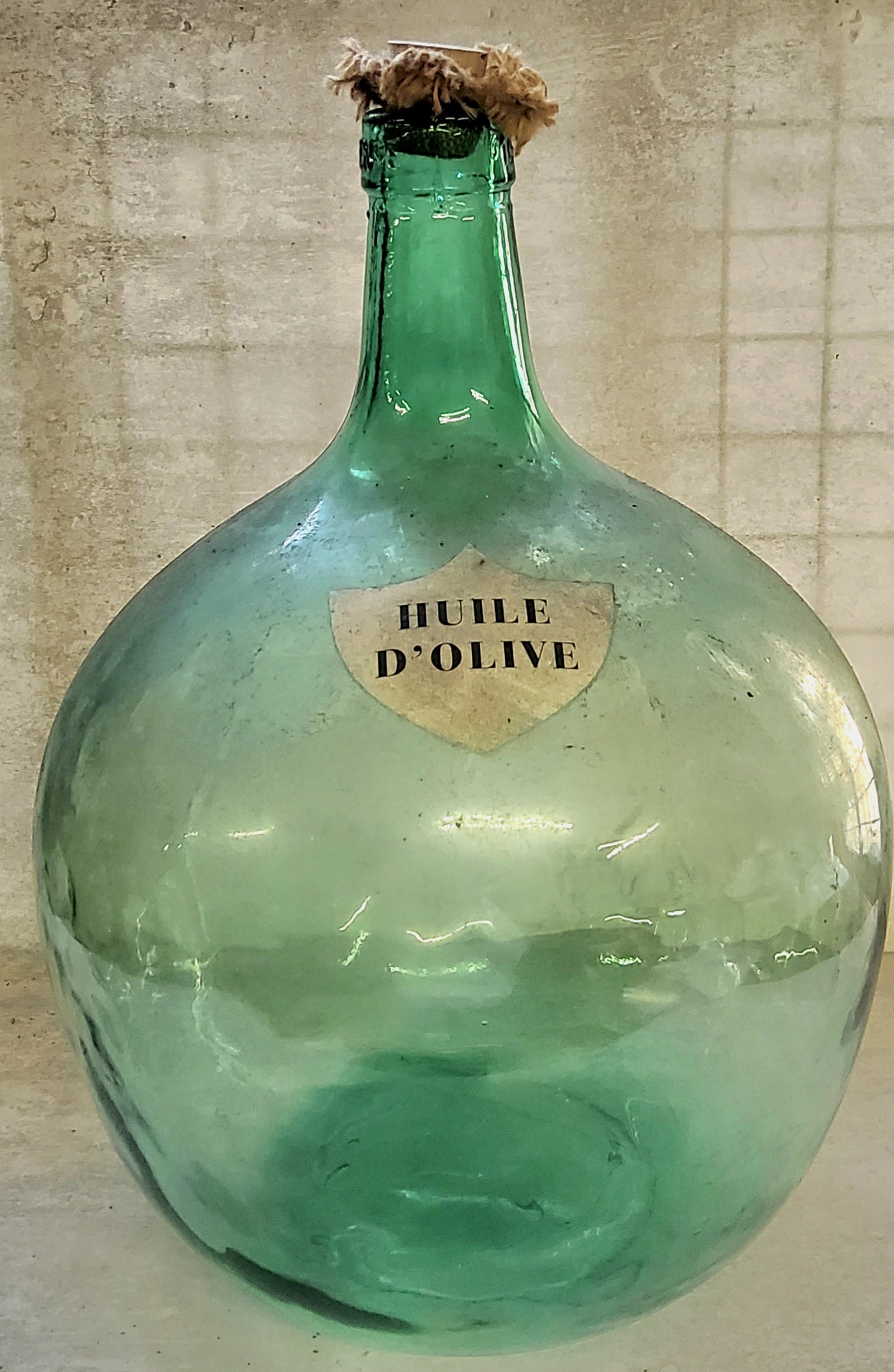 A substantial French carboy / demijohn with shield shaped label titled " Huile D'Olive ", cork stopper. Excellent condition.