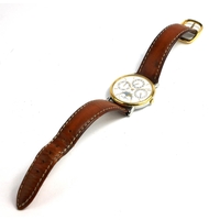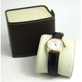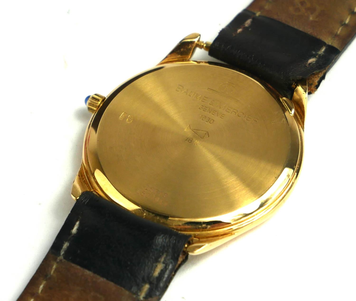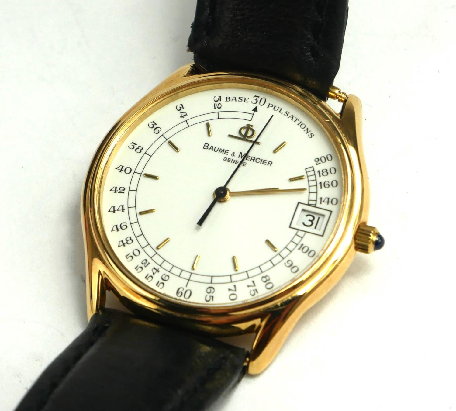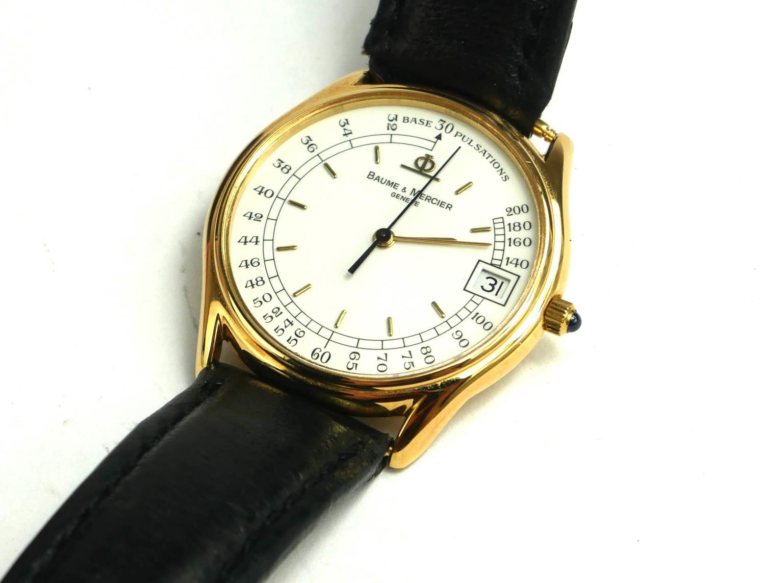 Circular white dial with calendar window and pulsations dial markings, having a sapphire winder, on a black leather strap, marker to case, number: 1830 153481507017, in a fitted brown Baume and Mercier box