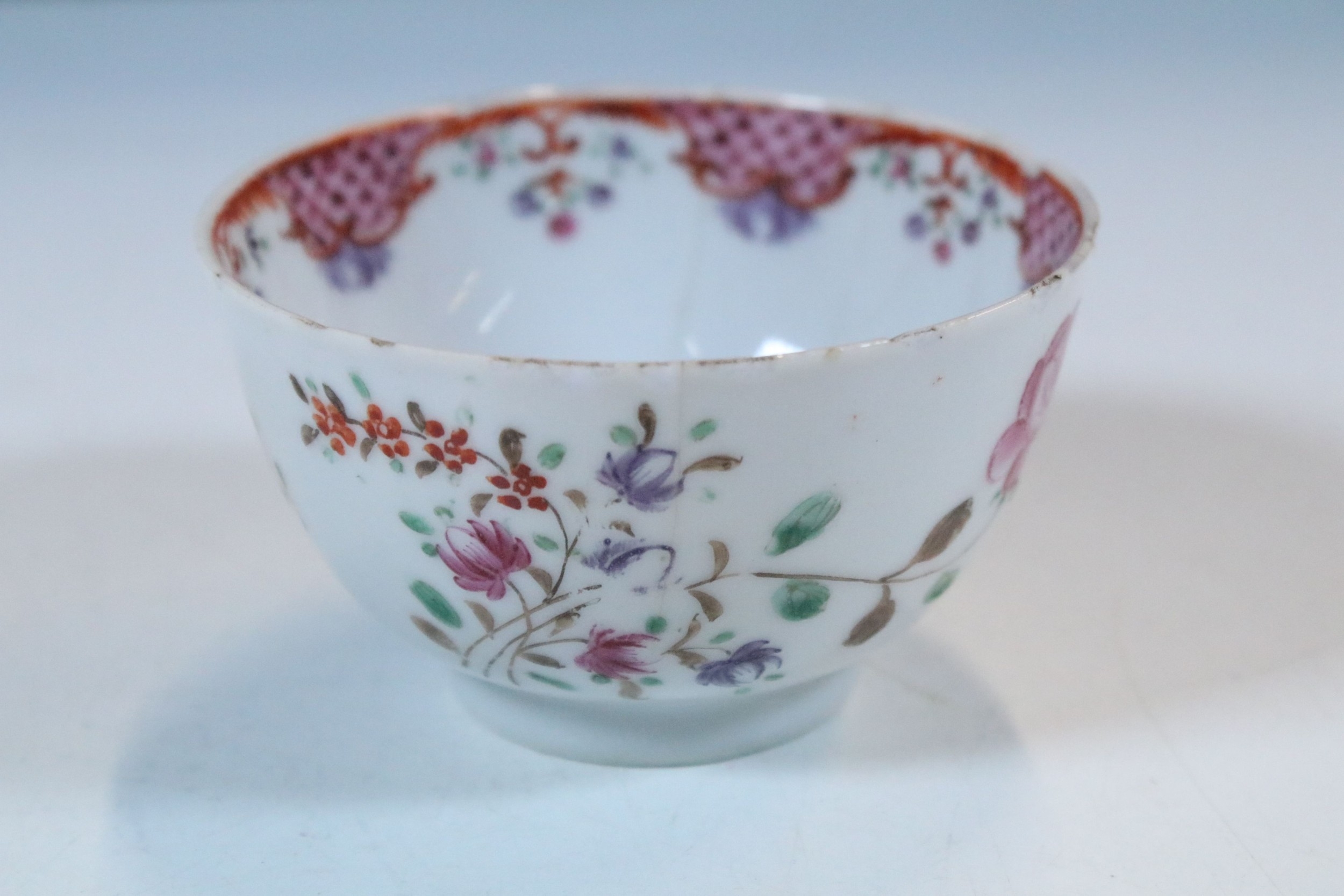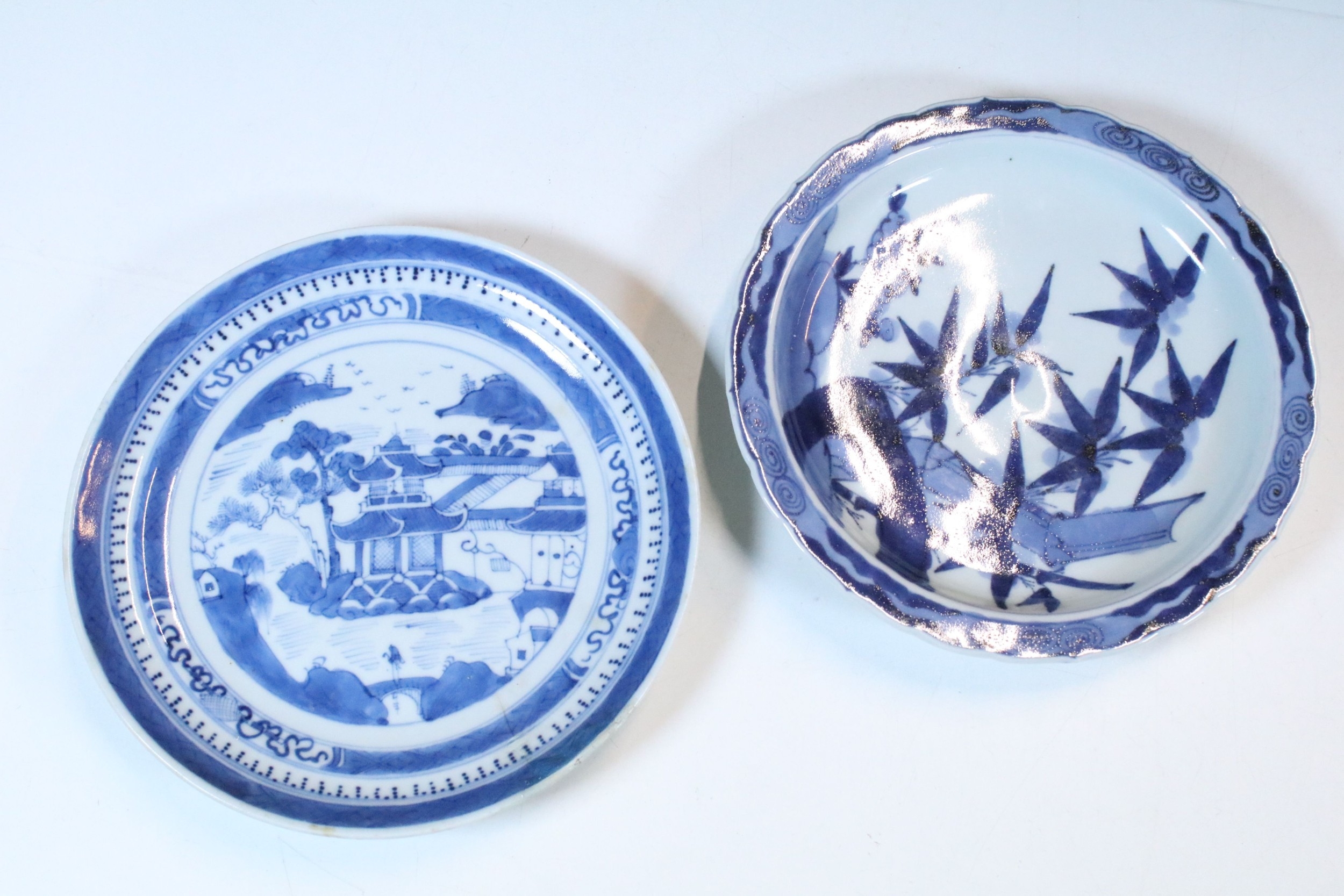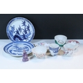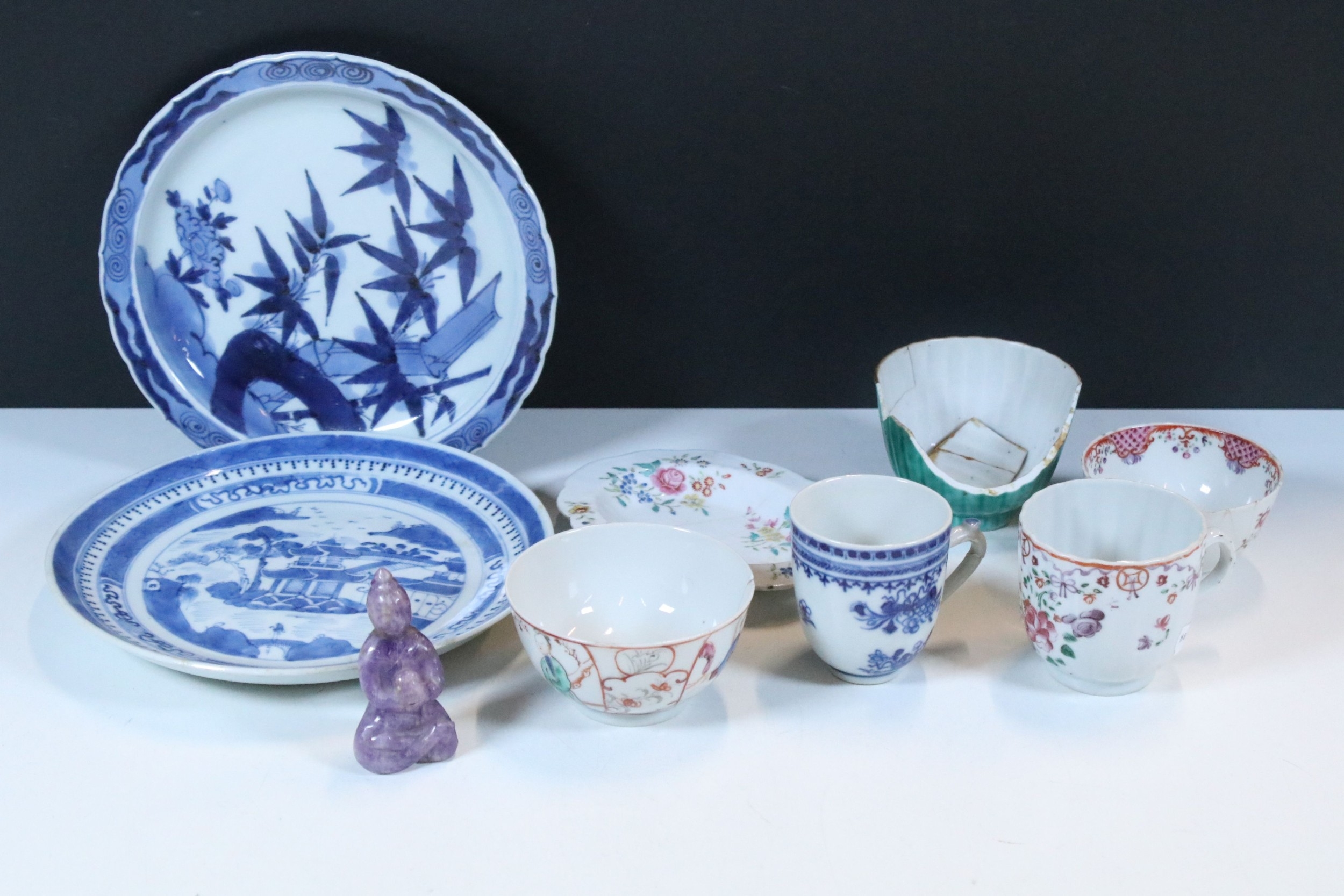 Collection of 18th century and later Chinese porcelain teawares, to comprise famille rose tea cup, two tea bowl, a Chinese blue and white tea cup, a lavender jade buddha, etc. together with two blue and white plates (8)