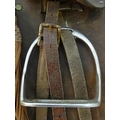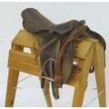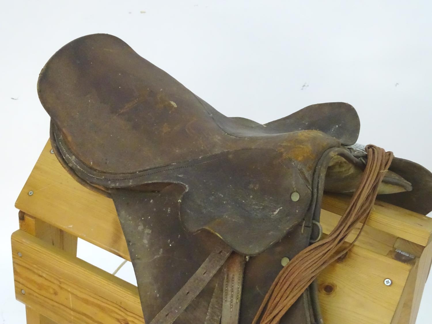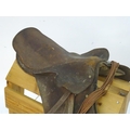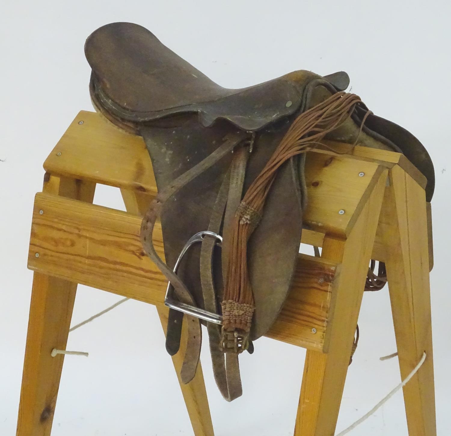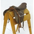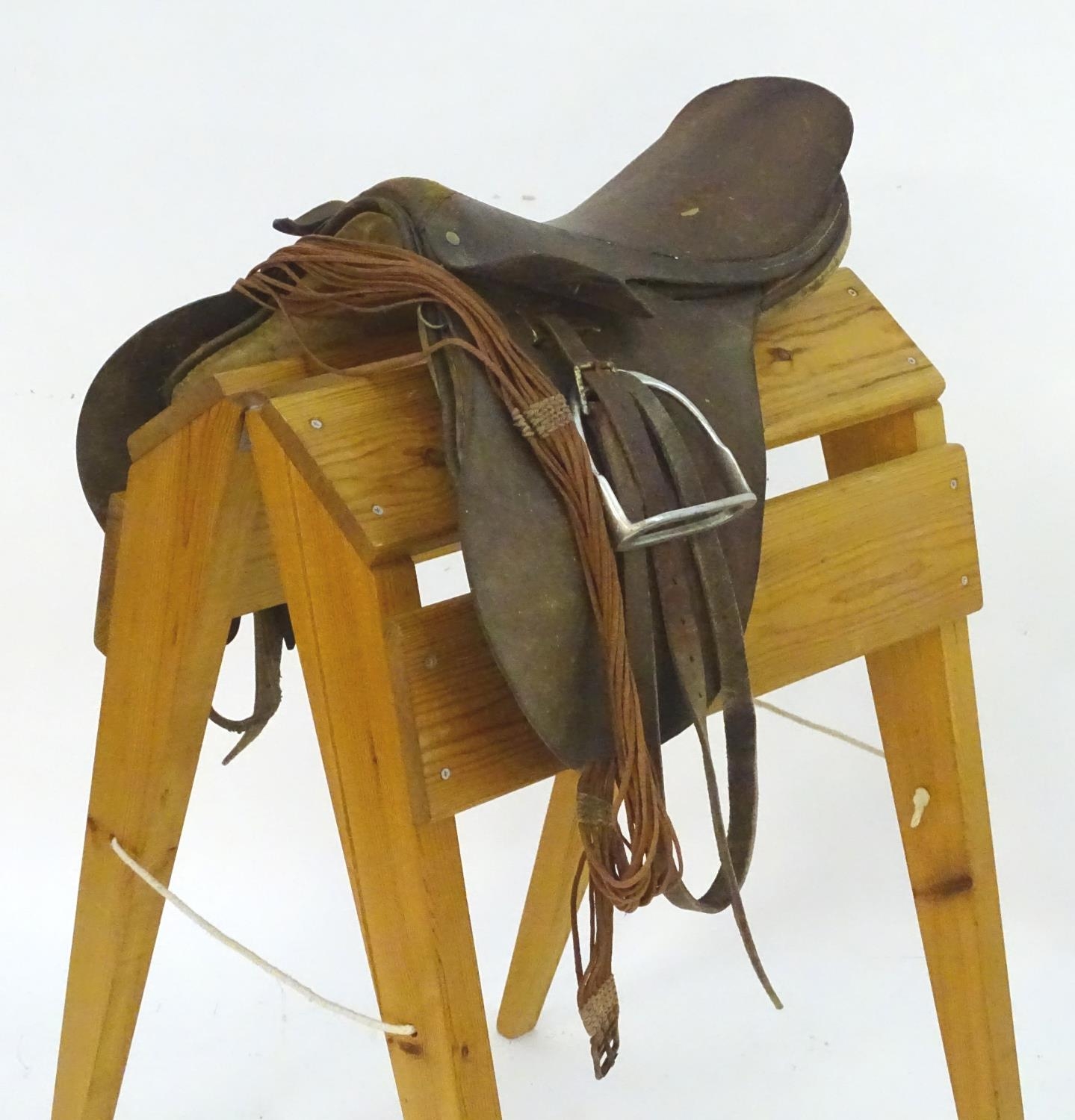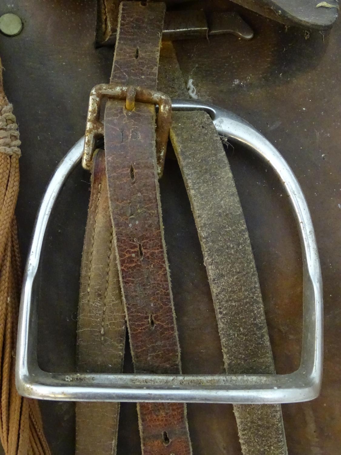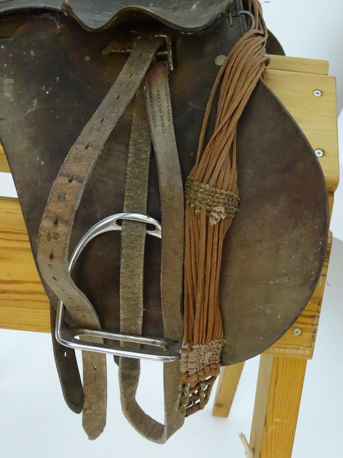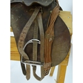 A brown leather horse riding / equestrian saddle with stirrups, Approx. 17 1/2"