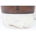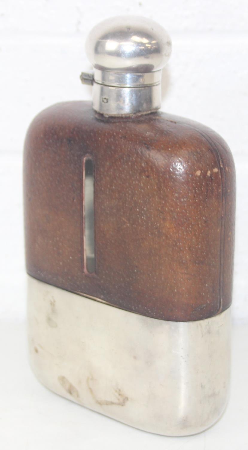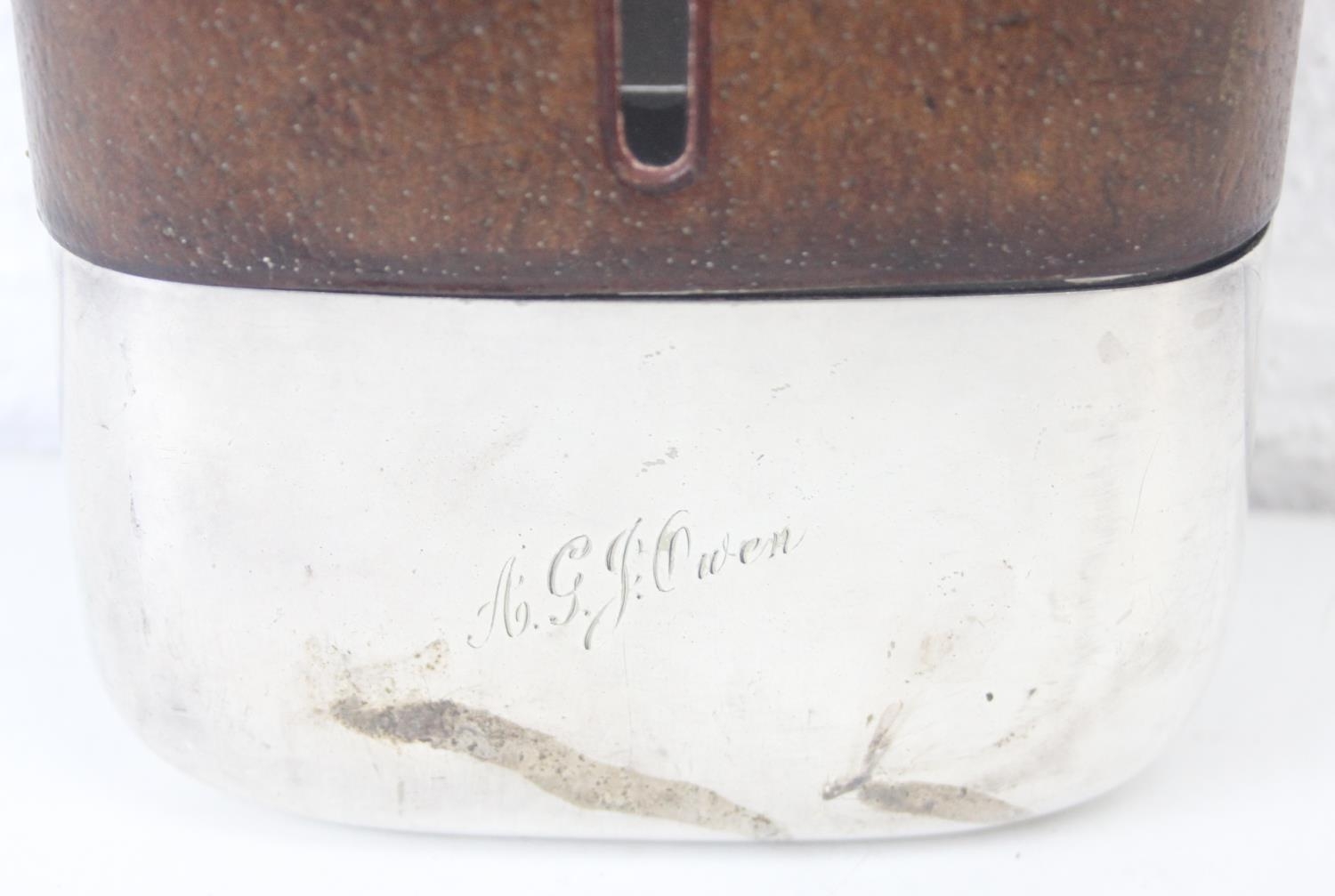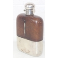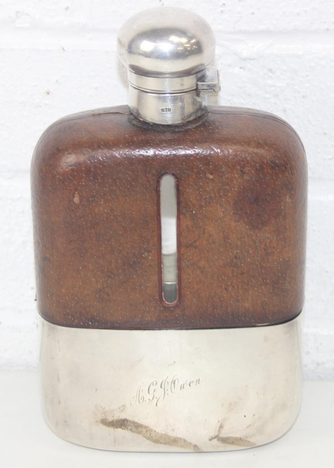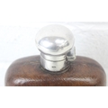 A very unusual oversized silver plate, glass and leather covered hip flask by James Dixon & Sons, early 20th century, 22cm tall
