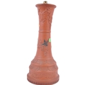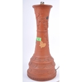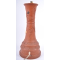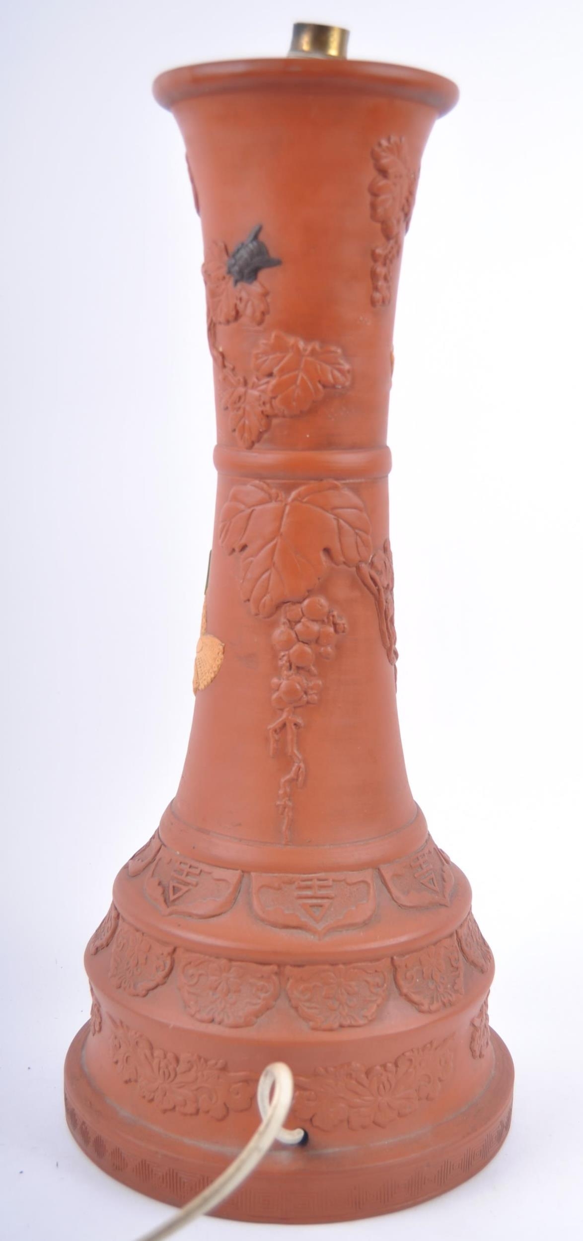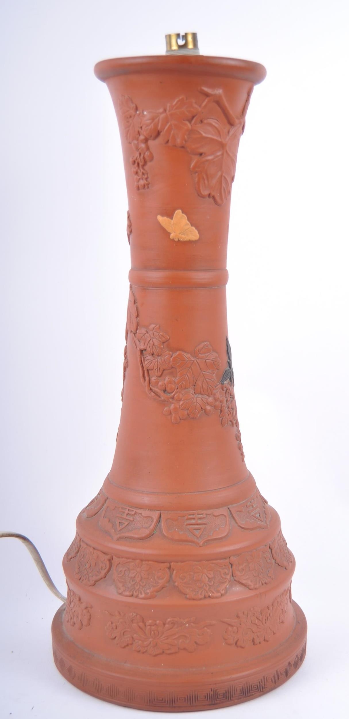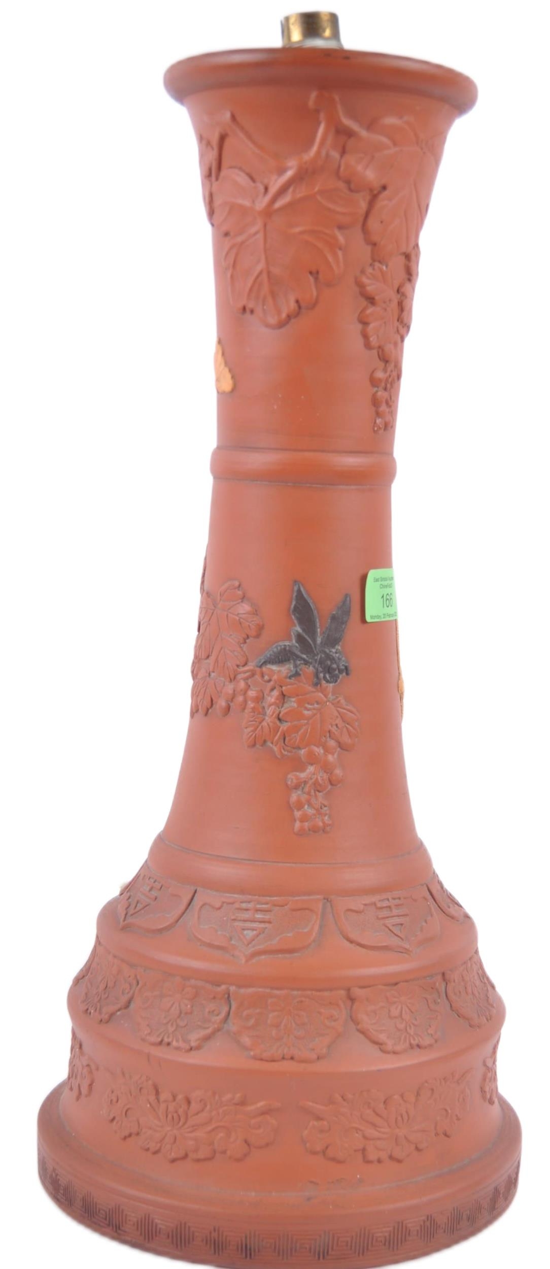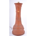 A large 19th Century Chinese Yixing pottery lamp base. Tall waisted form with relief decoration depicting flowers, blossoming grape vine and insects. The base decorated with repeating patterns and panels. Measures approx; 49cm tall.