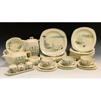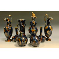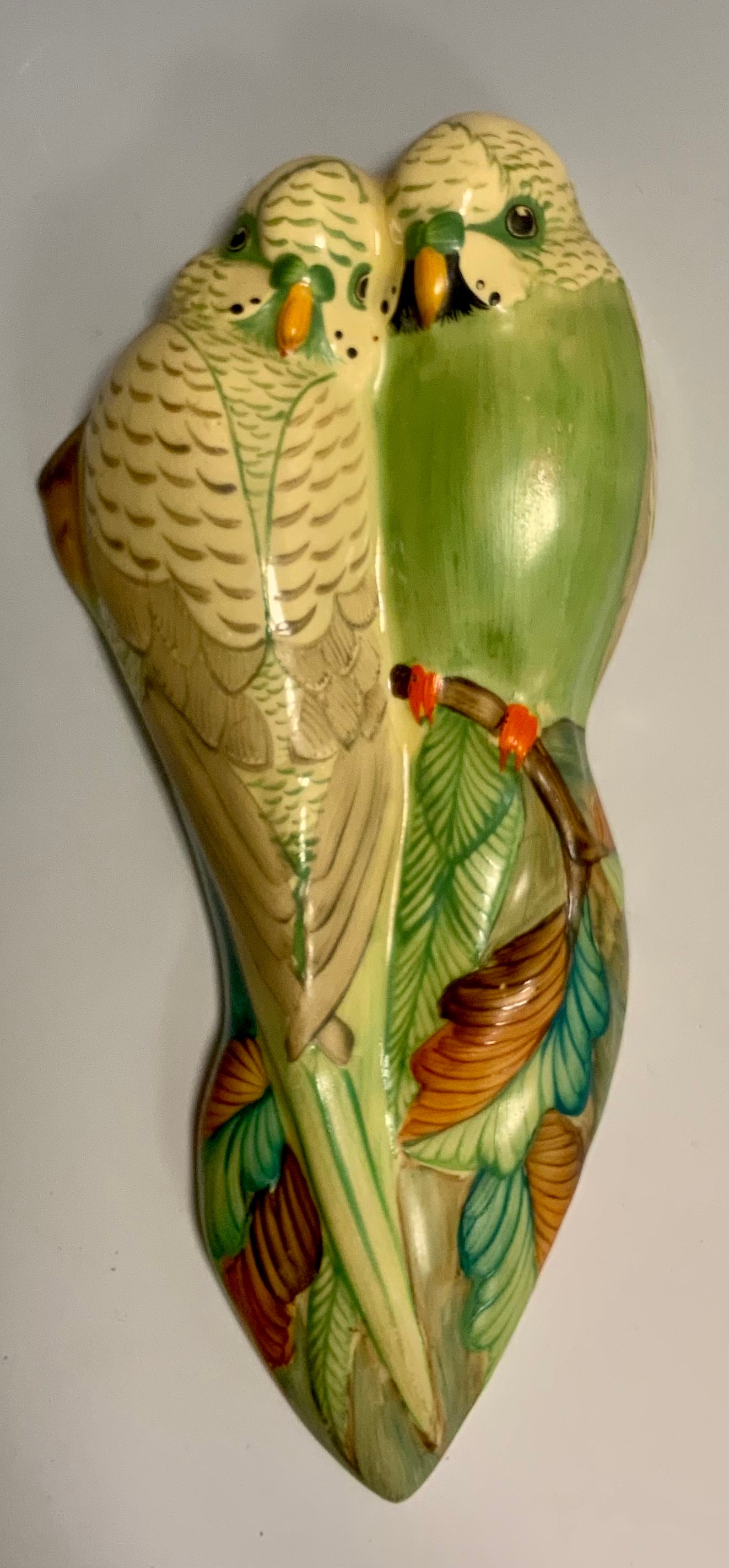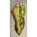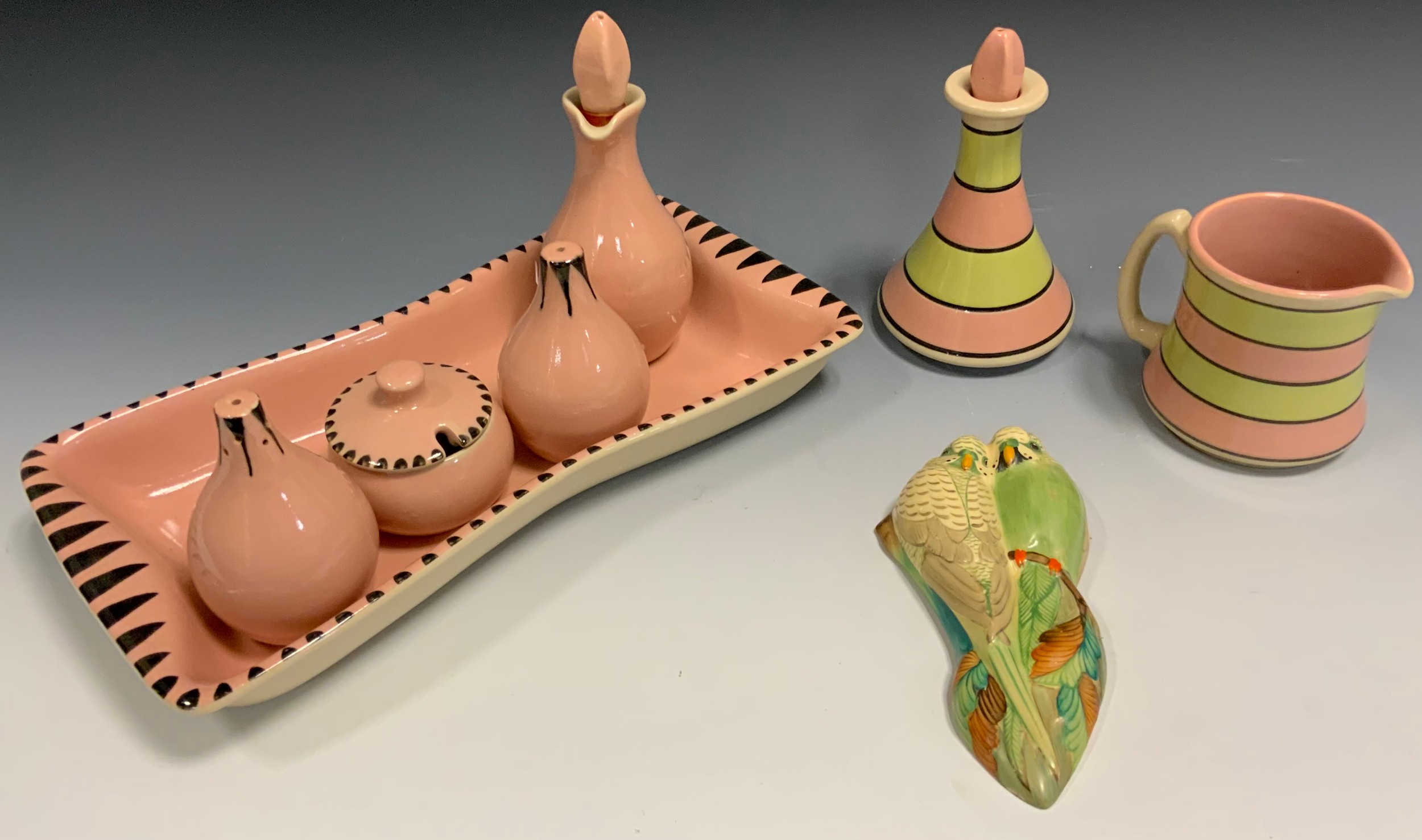 A Langley five-piece condiment set, in pink, black dash borders, printed marks; a similar banded vinegar bottle and jug; a Grey's wall plaque of two budgies, 18cm high