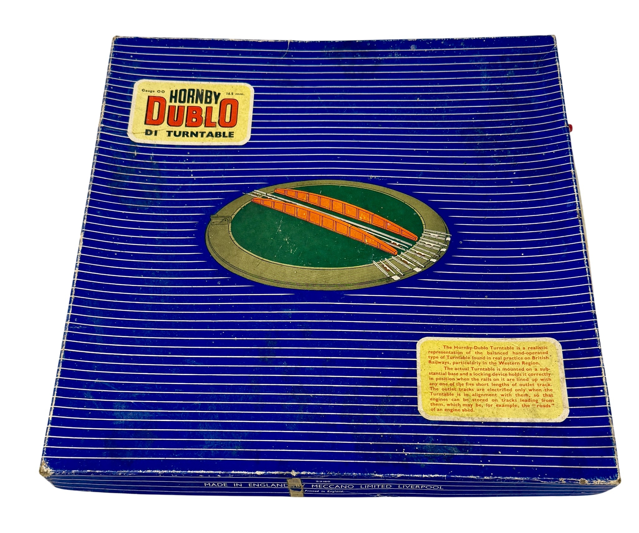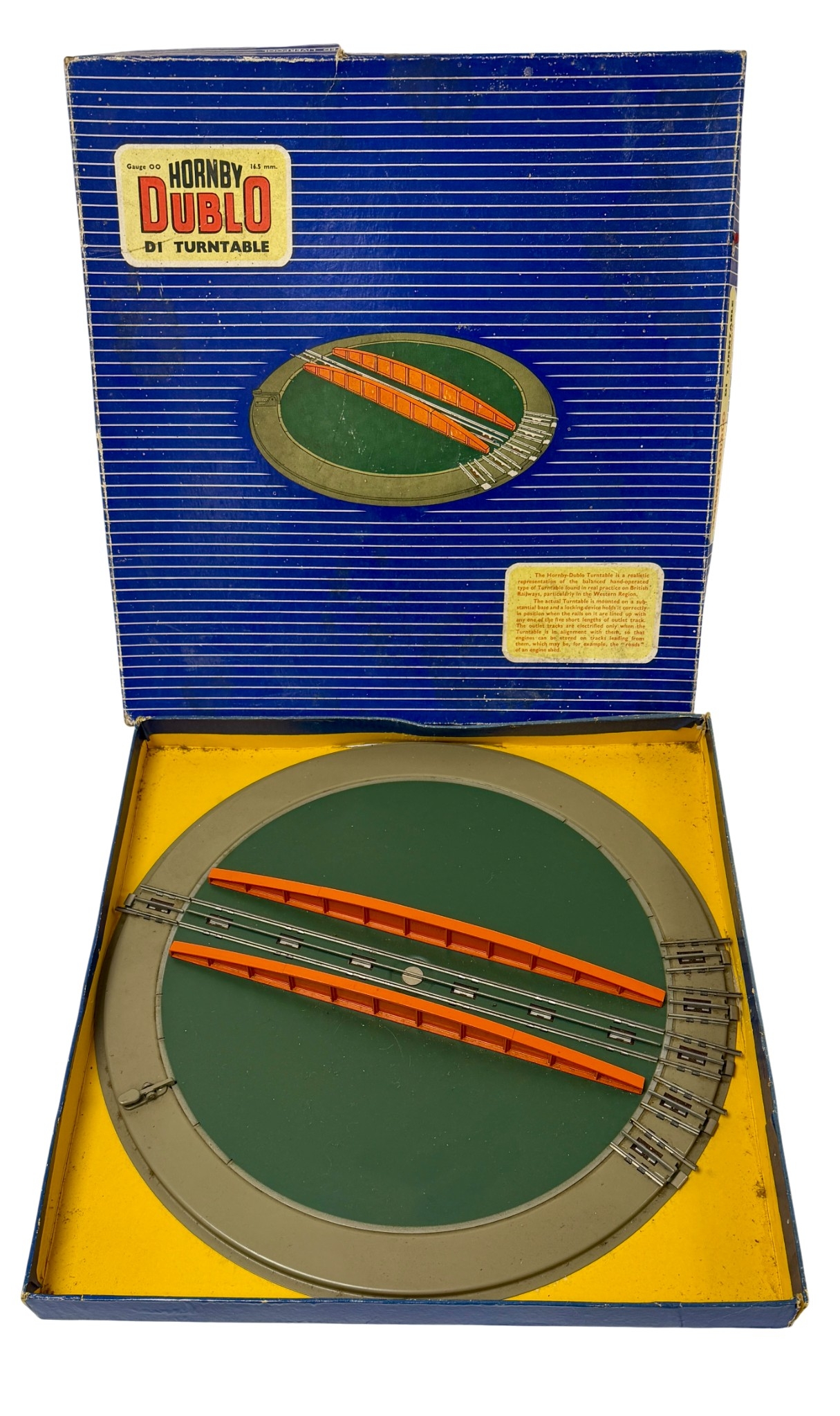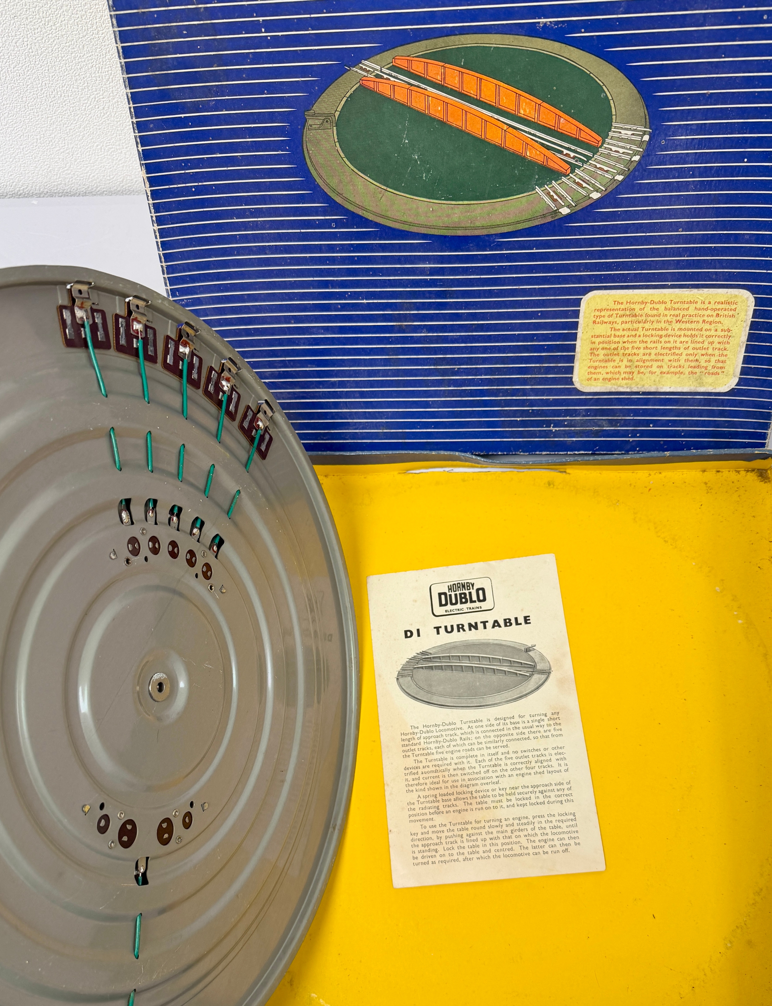 Complete with original instruction leaflet and original box.The turntable appears complete with rotating platform and track sections present. The box shows wear, the turntable itself shows signs of use and age related wear. (untested)