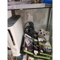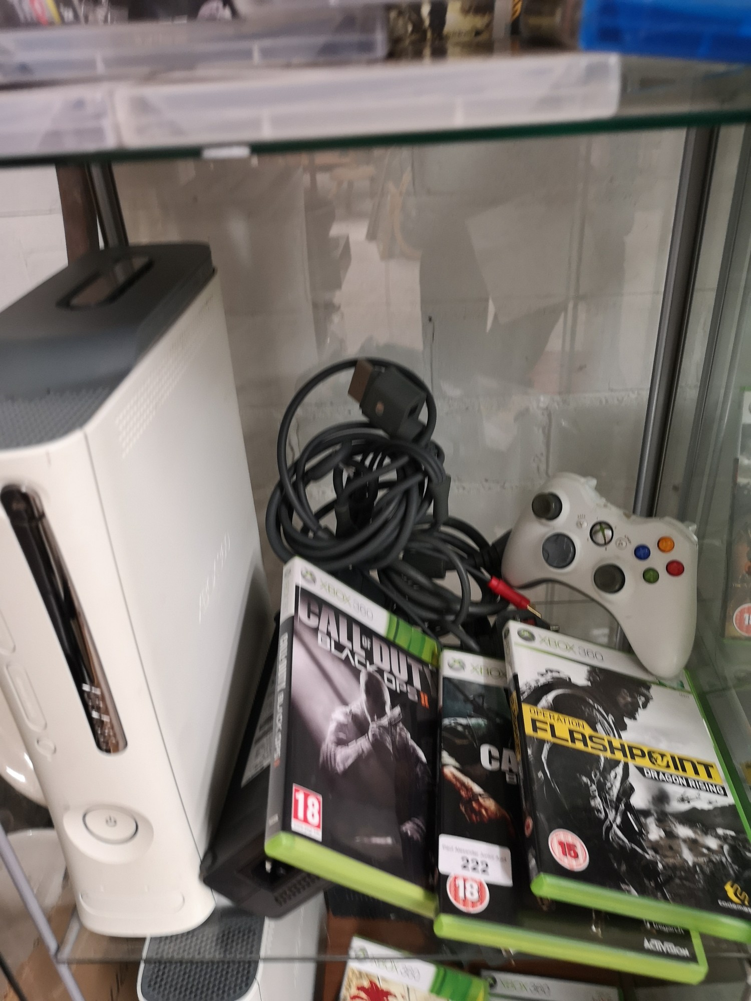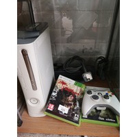 Xbox 360 console power suply together with games and controller.