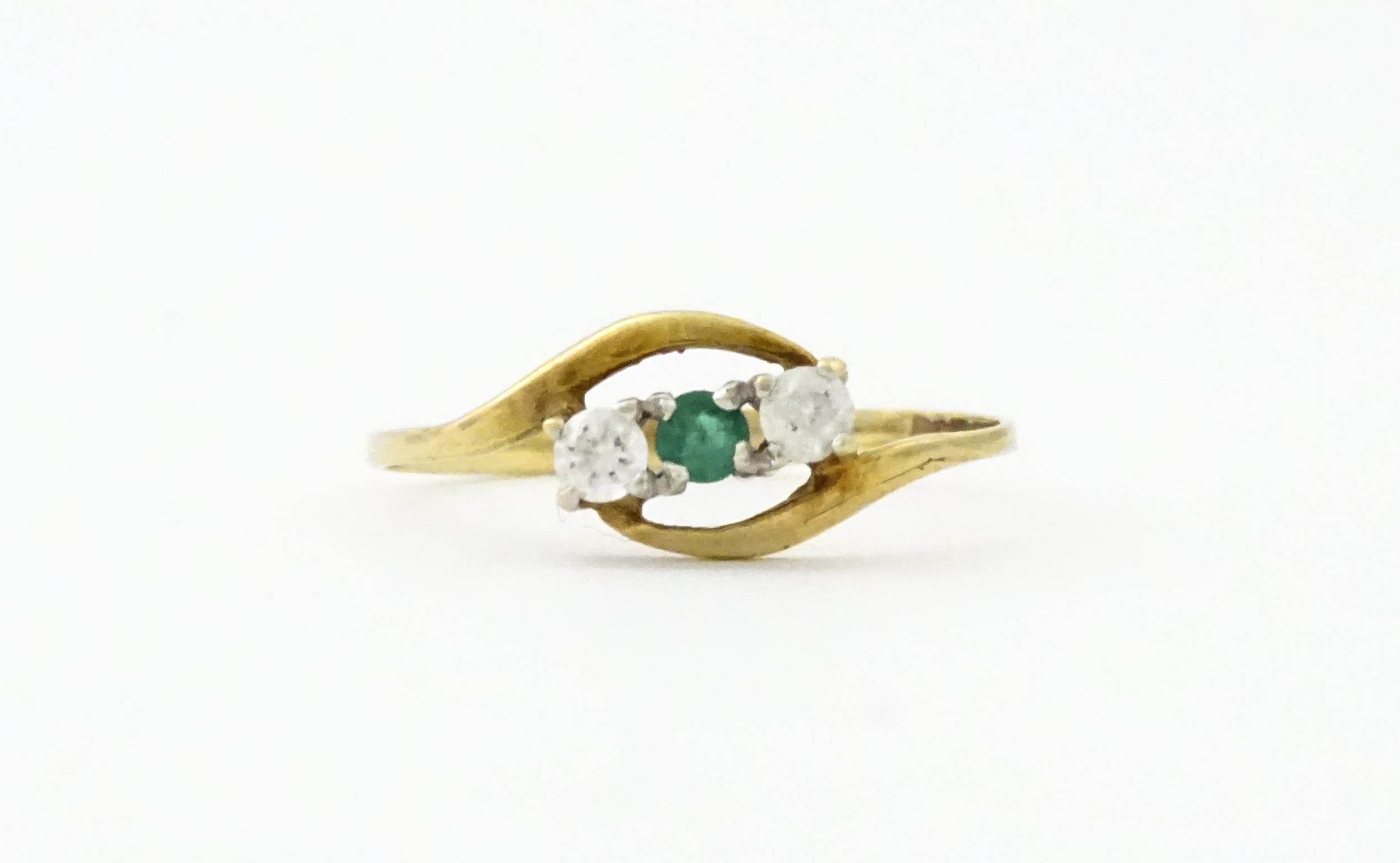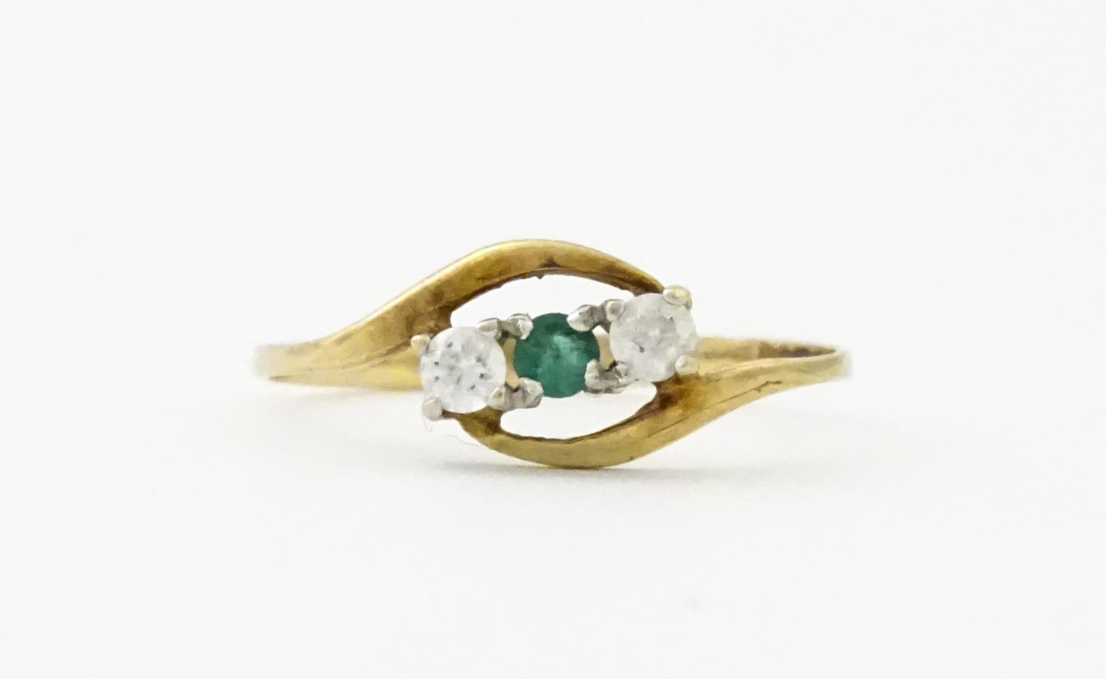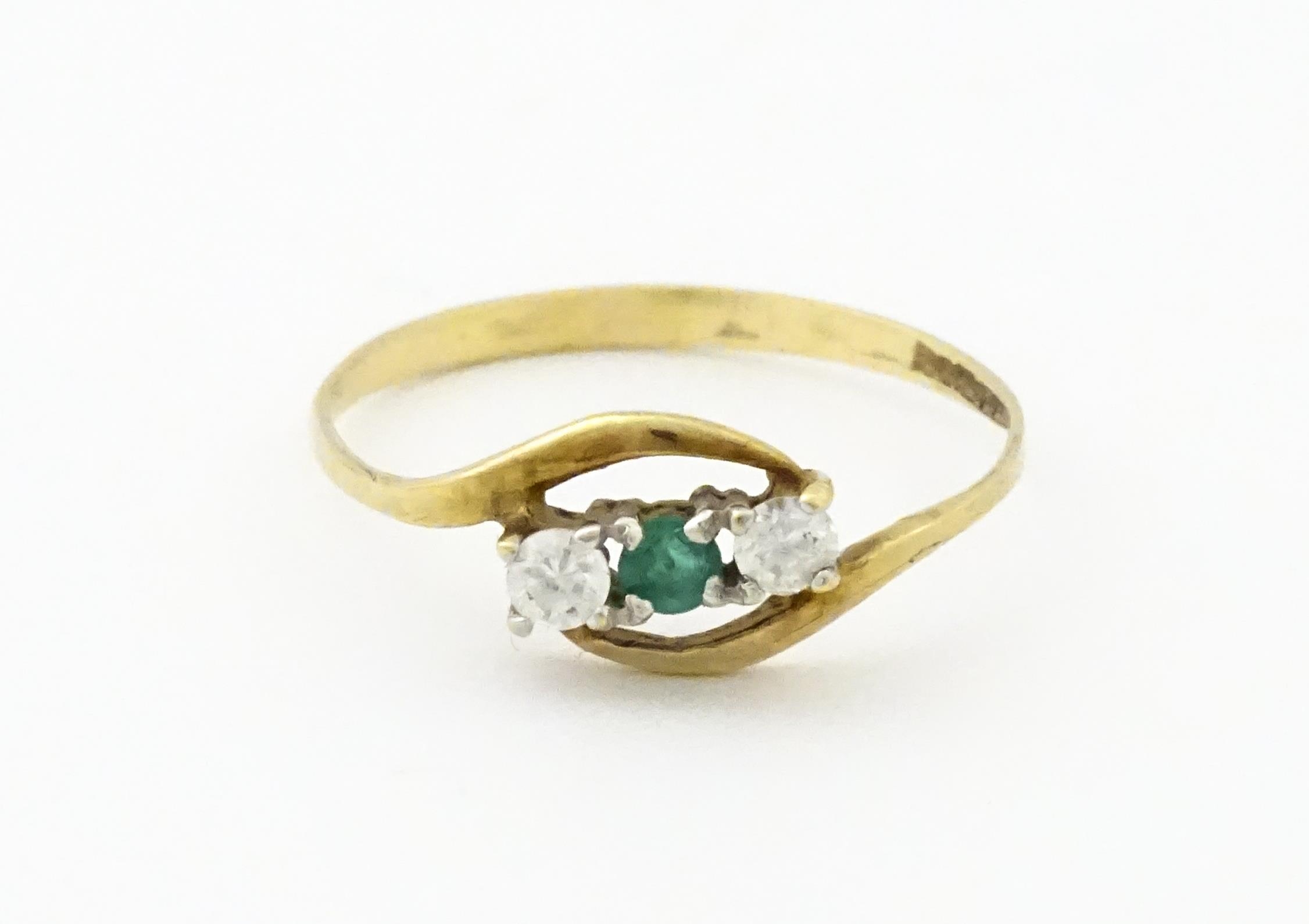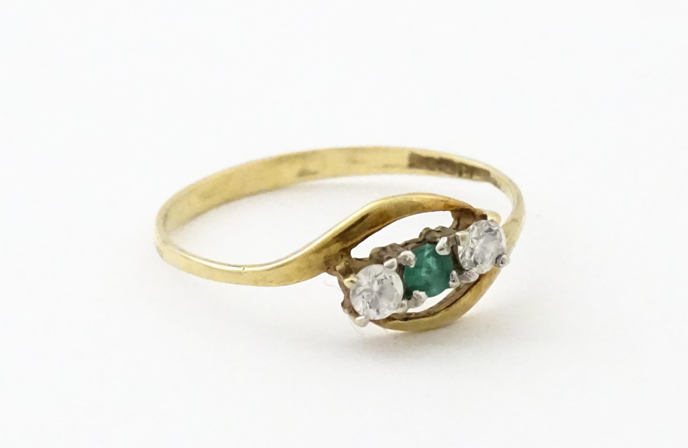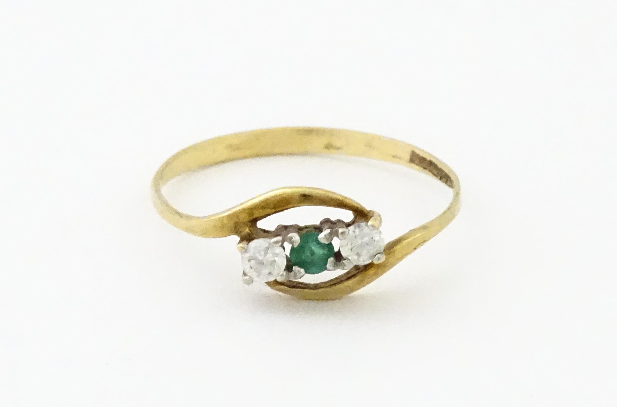 A 9ct gold ring set with central green stone flanked by white stones. Ring size approx. O 1/2