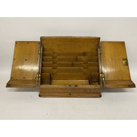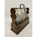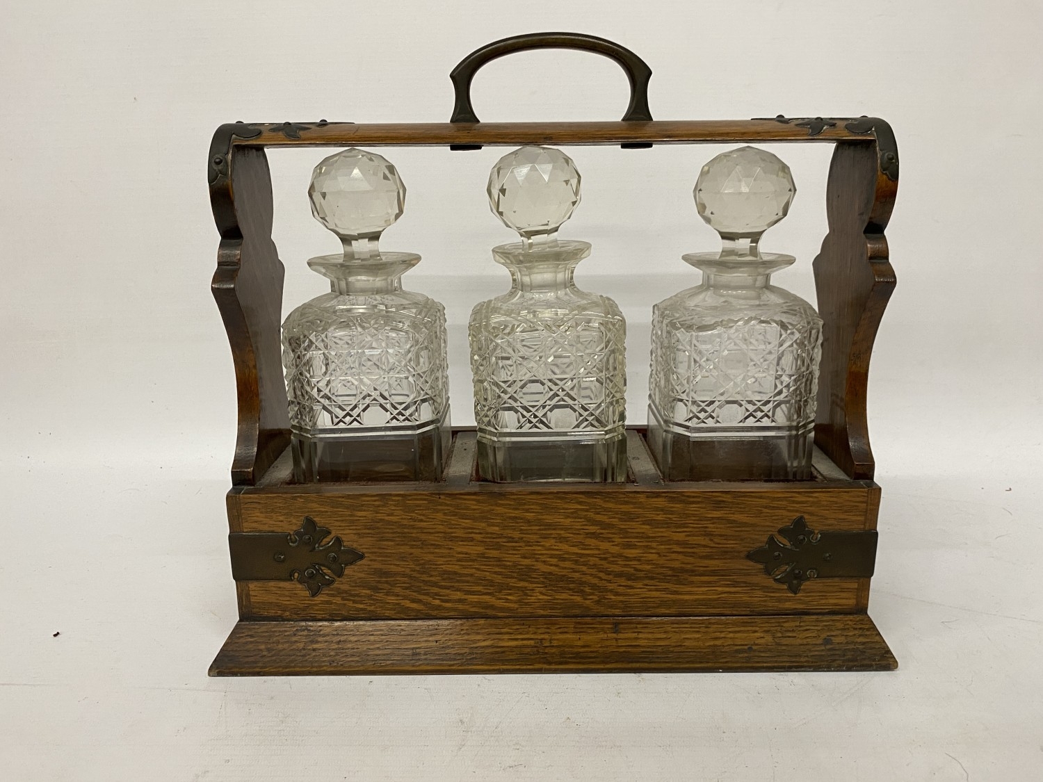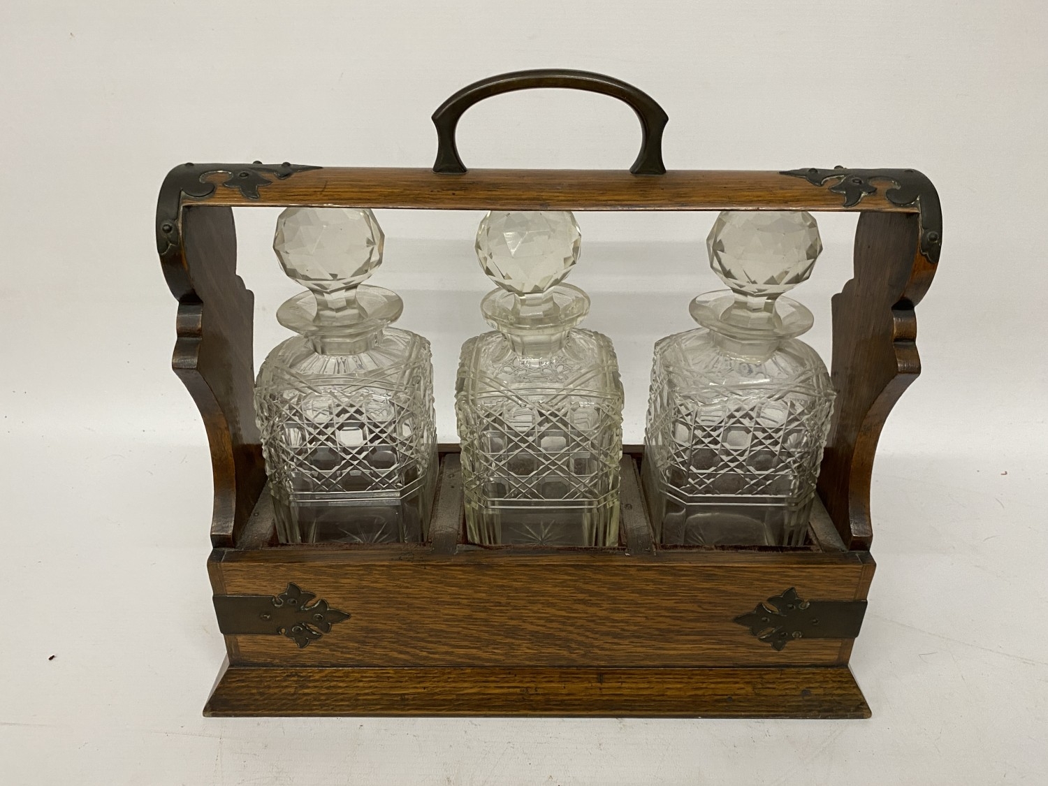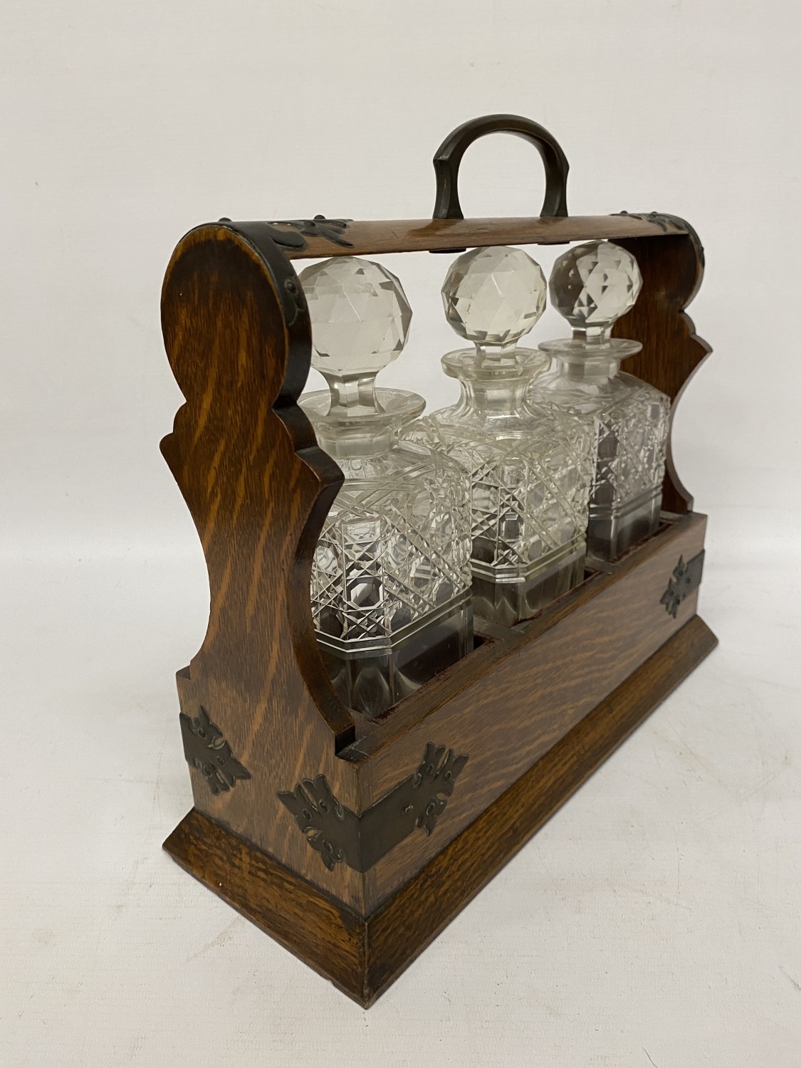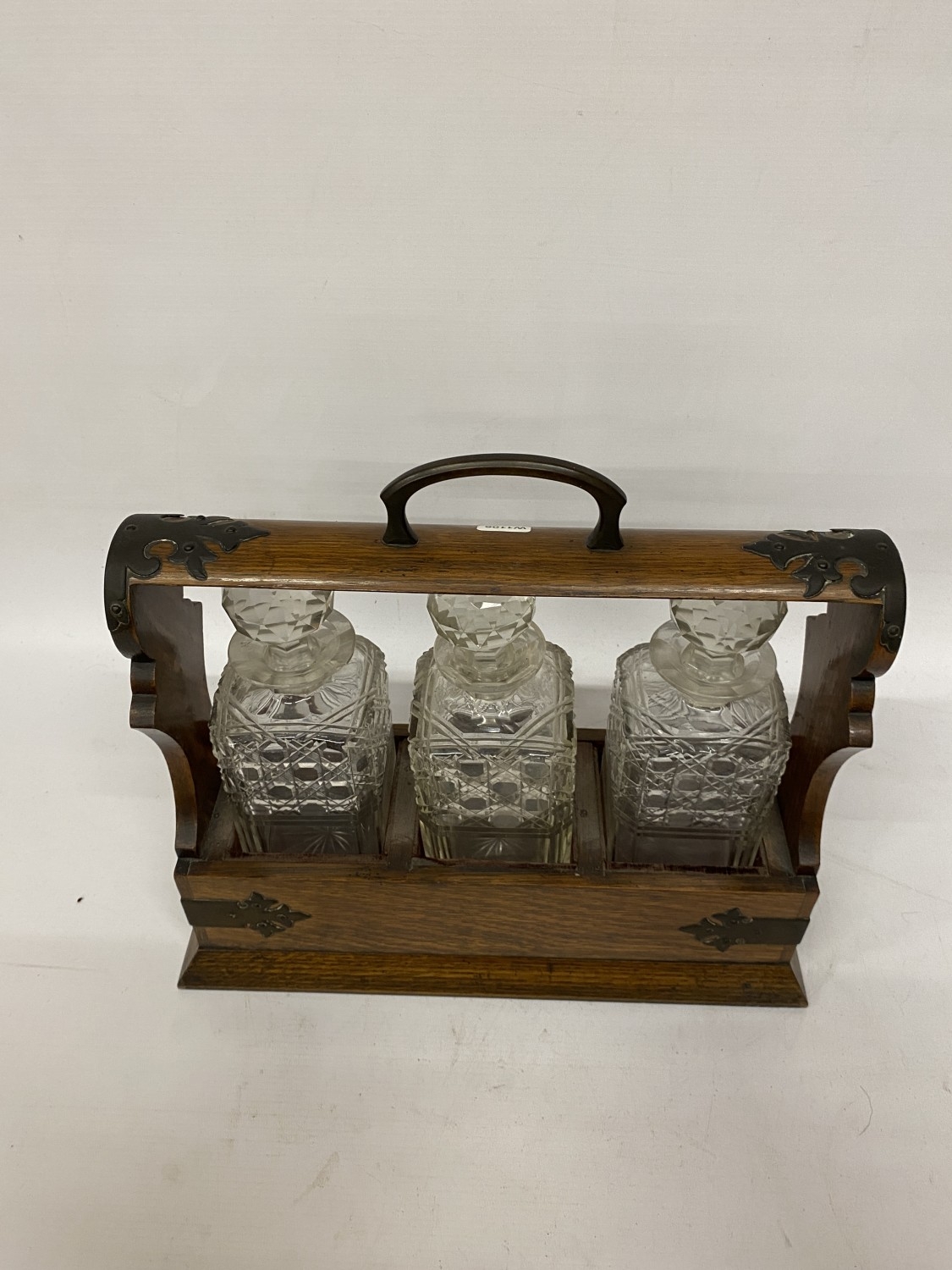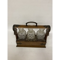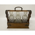 AN ANTIQUE OAK TANTALUS WITH THREE DECANTERS, METAL BANDING, LOCKING MECHANISM AND ORIGINAL KEY