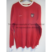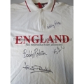 ENGLAND FOOTBALL AUTOGRAPHS A used England official zip-up white polo shirt signed in black marker by Nobby Stiles, Bobby Robson, Jack Charlton and Sven-Goran Eriksson. Generally good