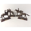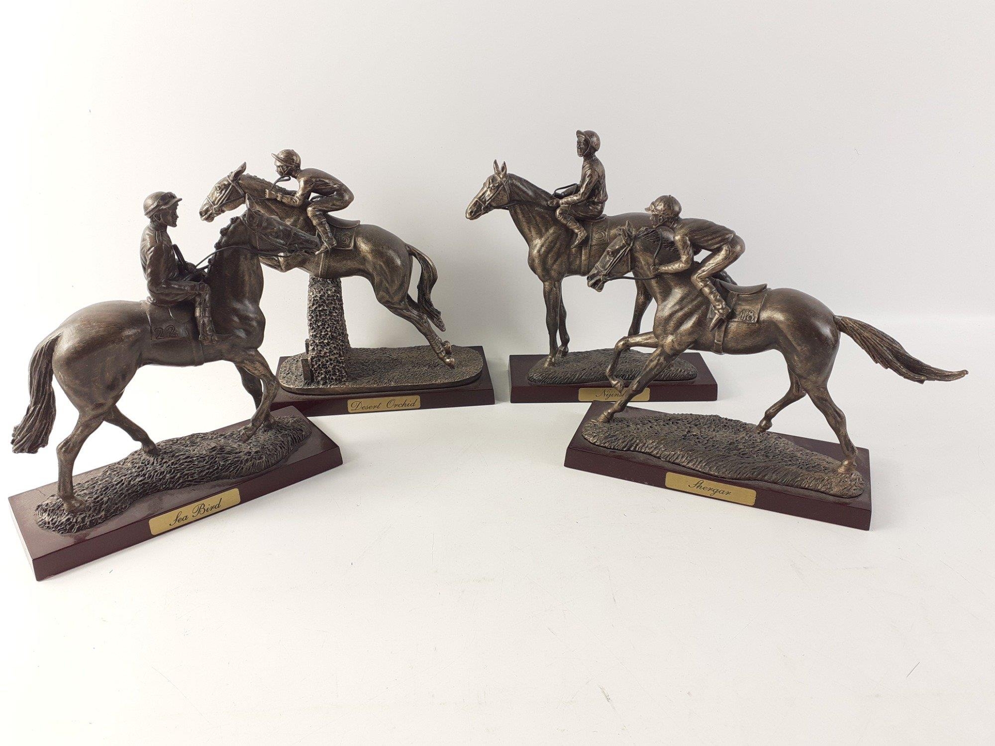 A collection of four bronze effect resin models of race horses on plinths with jockeys. Each stands approx 14cm high and all are in good order. Includes Shergar, Nijinsky, Desert Orchid, Sea Bird. Note Shergar has minor damage to one ear tip