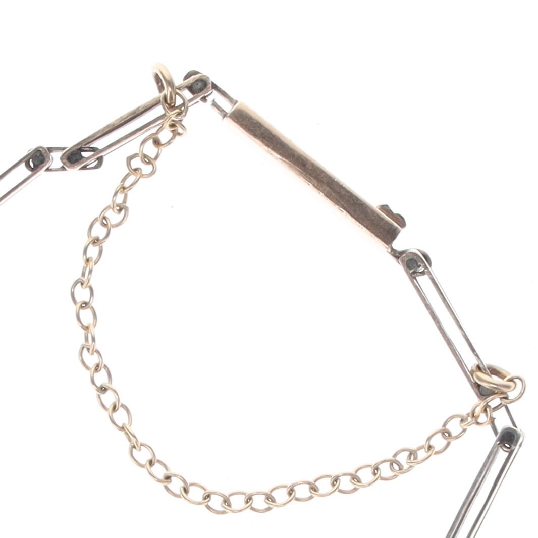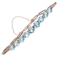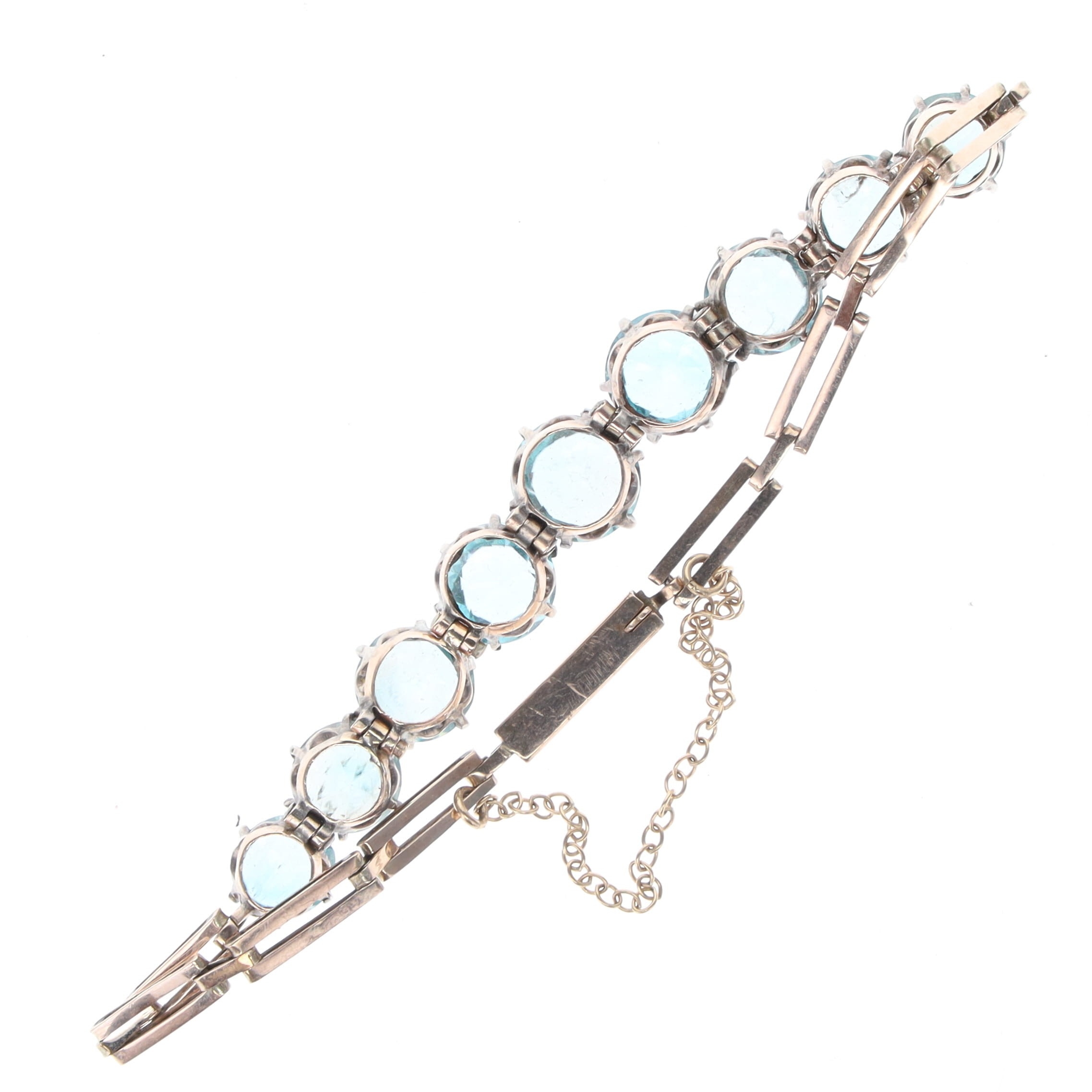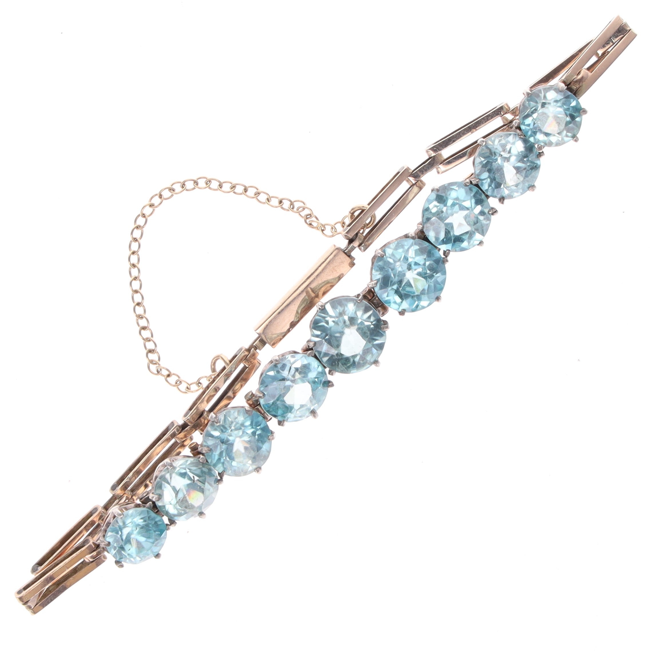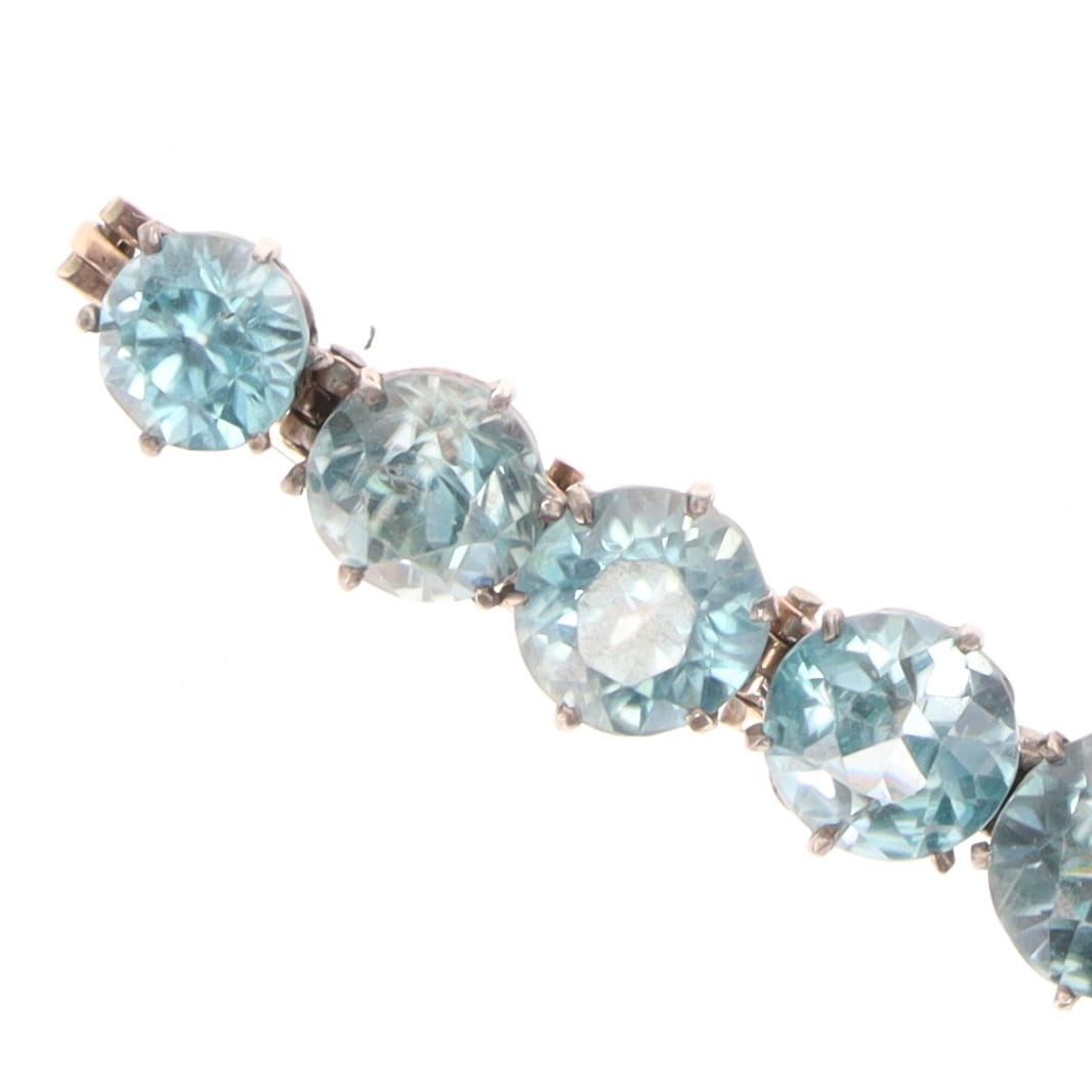 Blue Zircon Gold Panel Bracelet. This piece has been tested as 8ct gold. There is some light wear and scratches to the metal and stones, all secure. Some metal links are slightly misshapen. The chain and safety clasp are in working order. The bracelet measures approximately 18cm wearable length, weighs in total 8.6g.