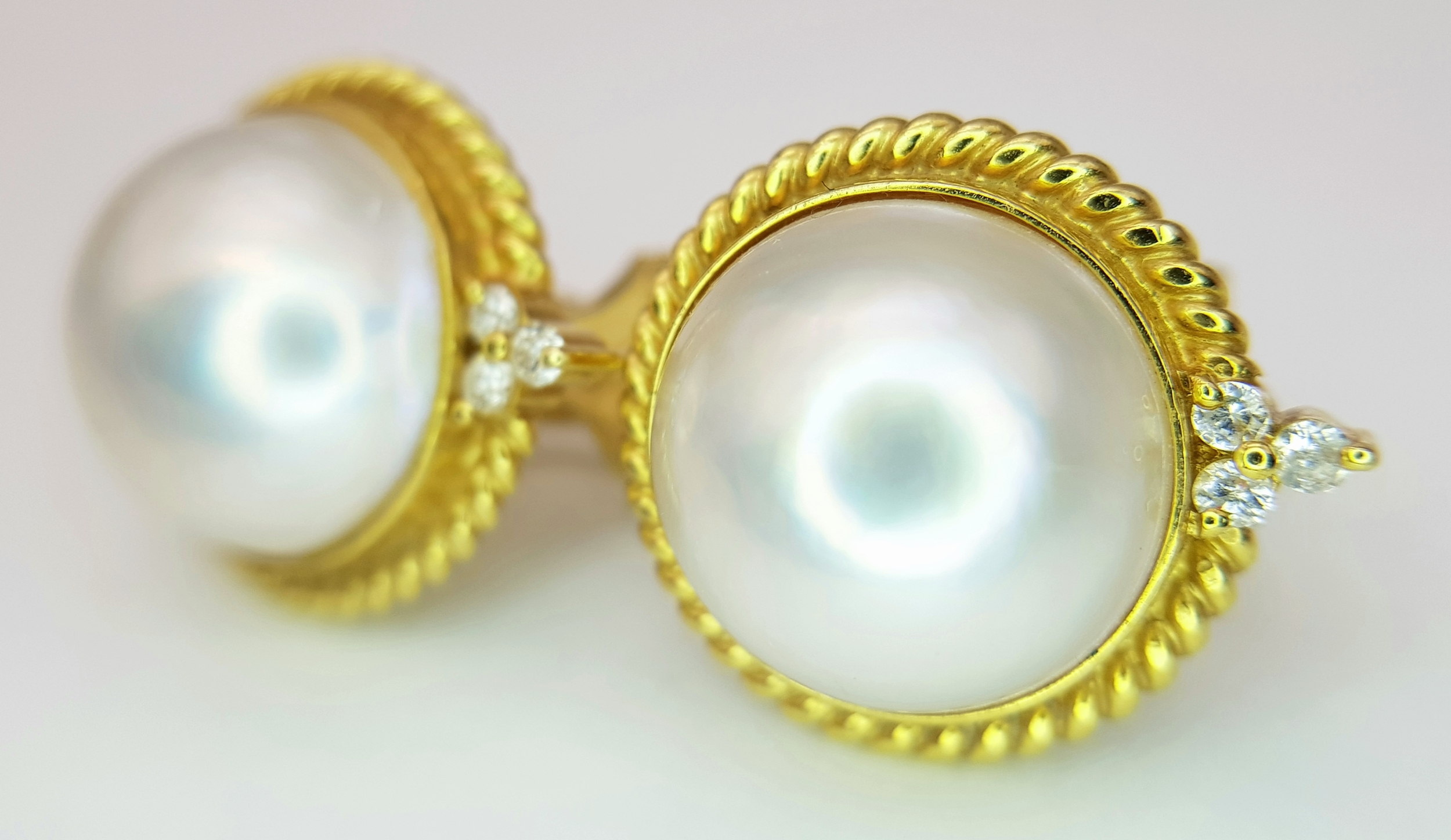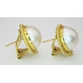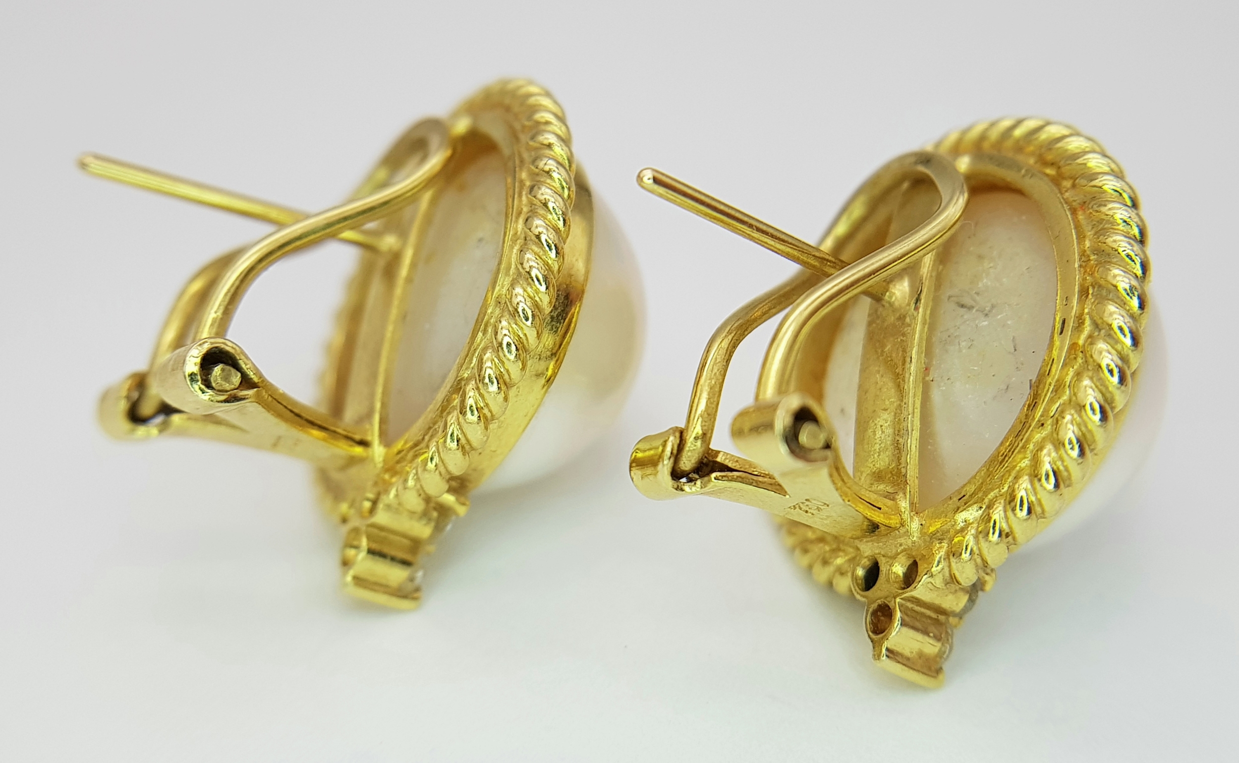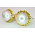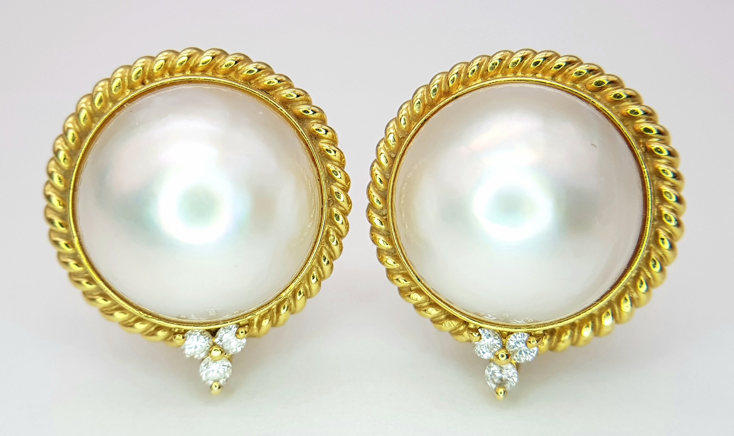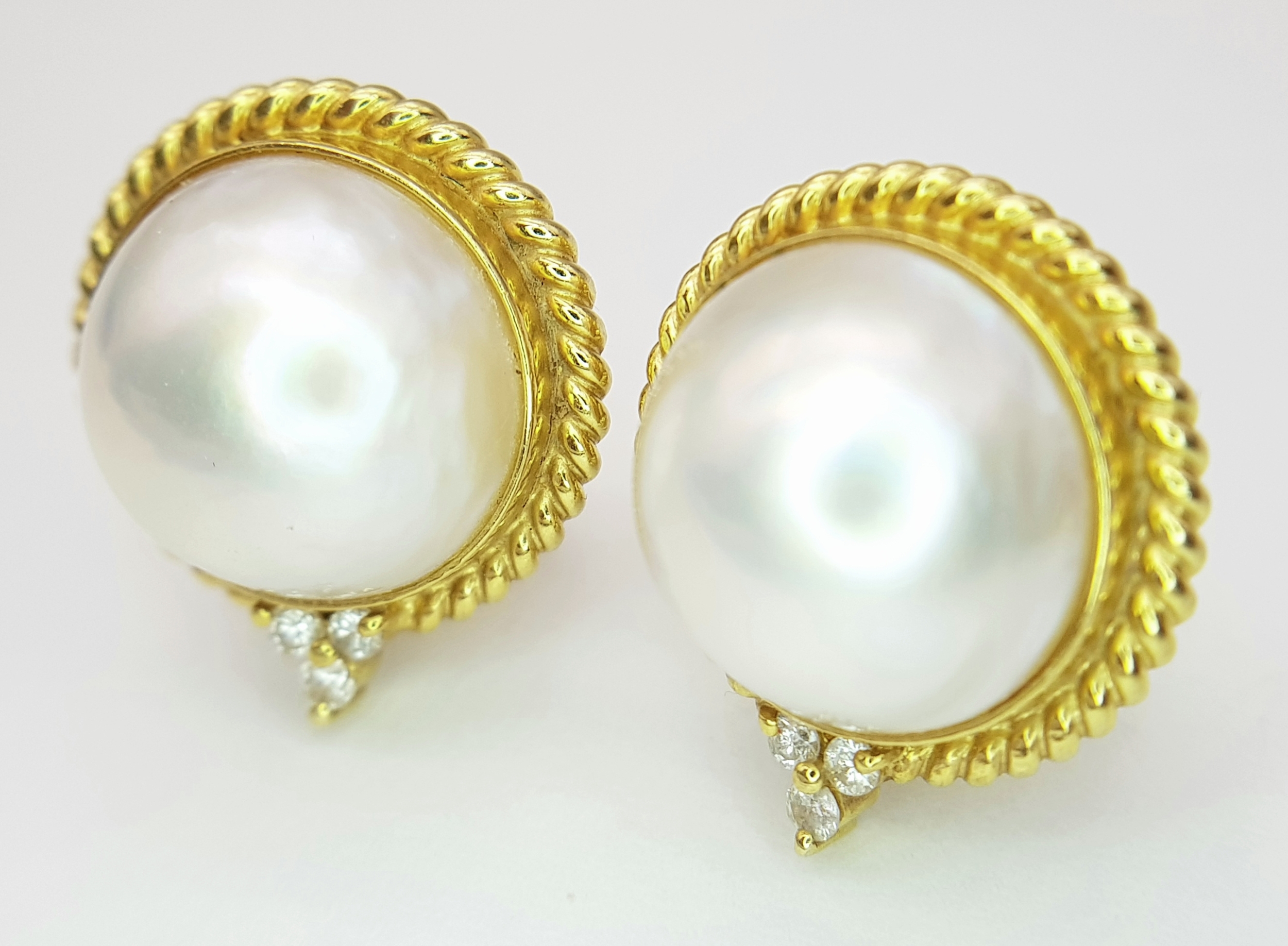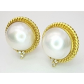 A Pair of 18K Yellow Gold, Mabe Pearl and Diamond Earrings. Beautiful pearl cabochons each with three round brilliant cut diamonds crowns. Post and spring clips. 18 x 20mm. 13.85g total weight. Ref: 11/76605.