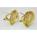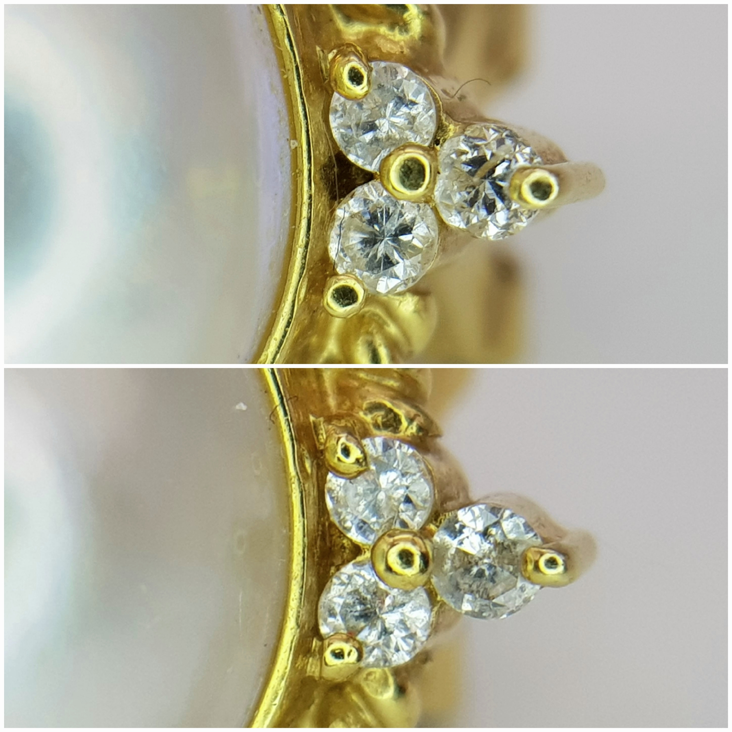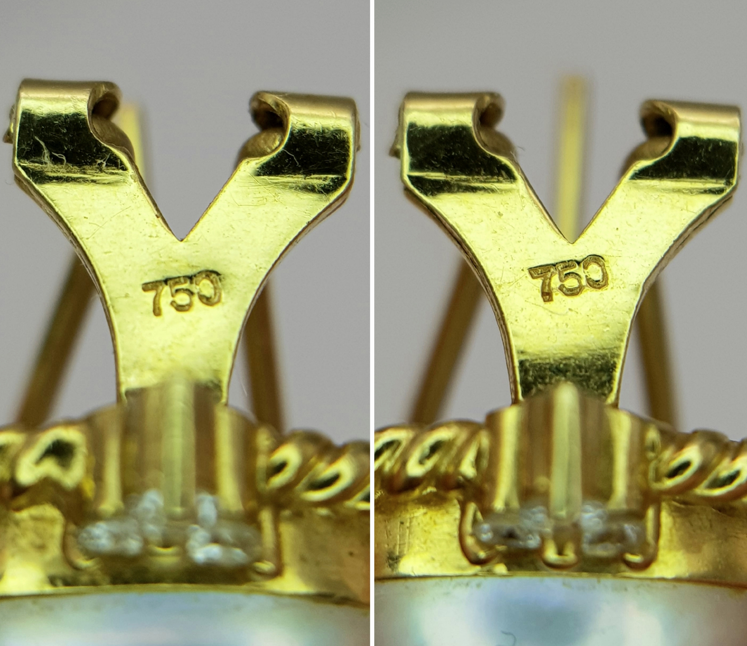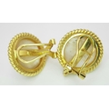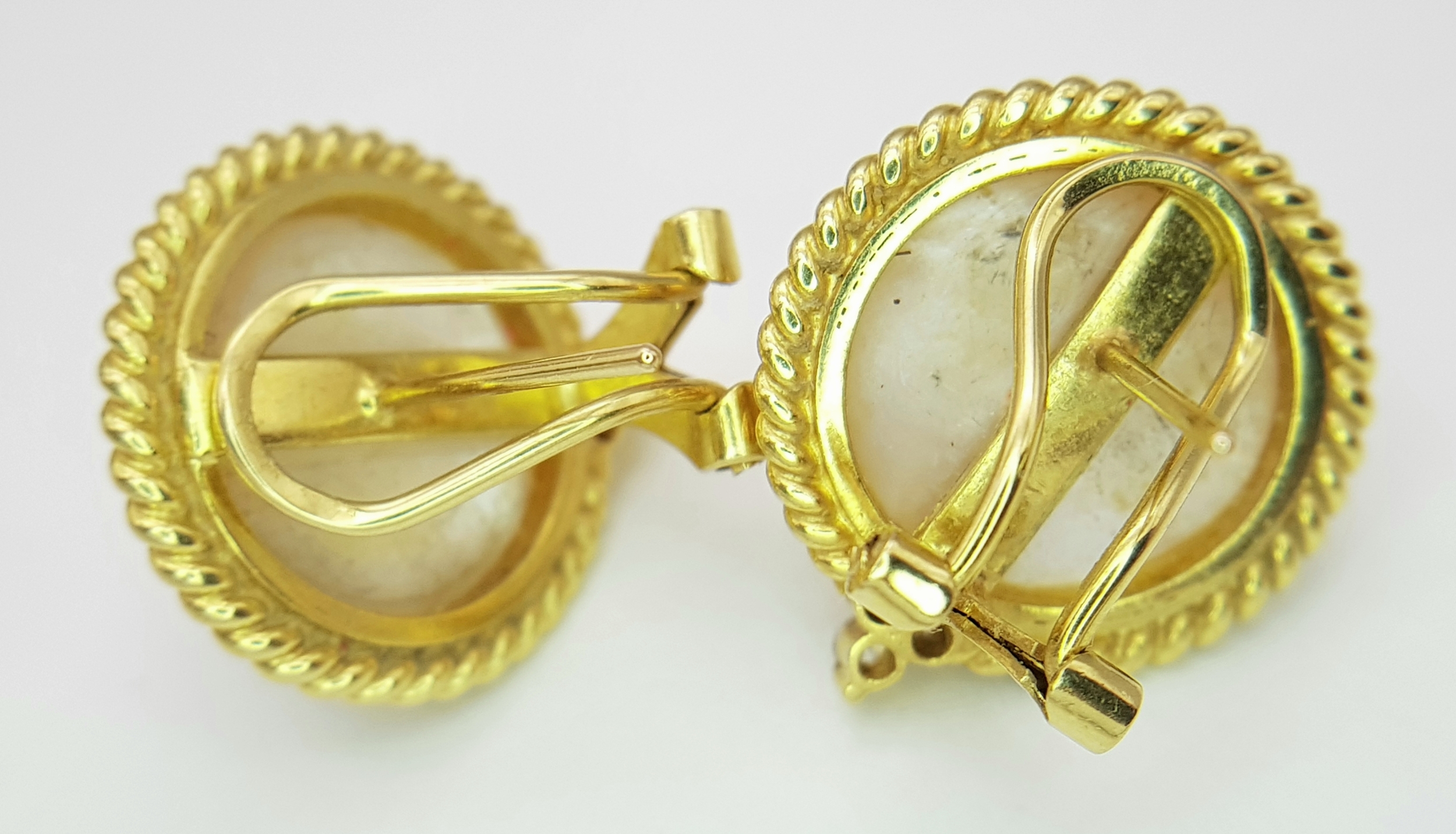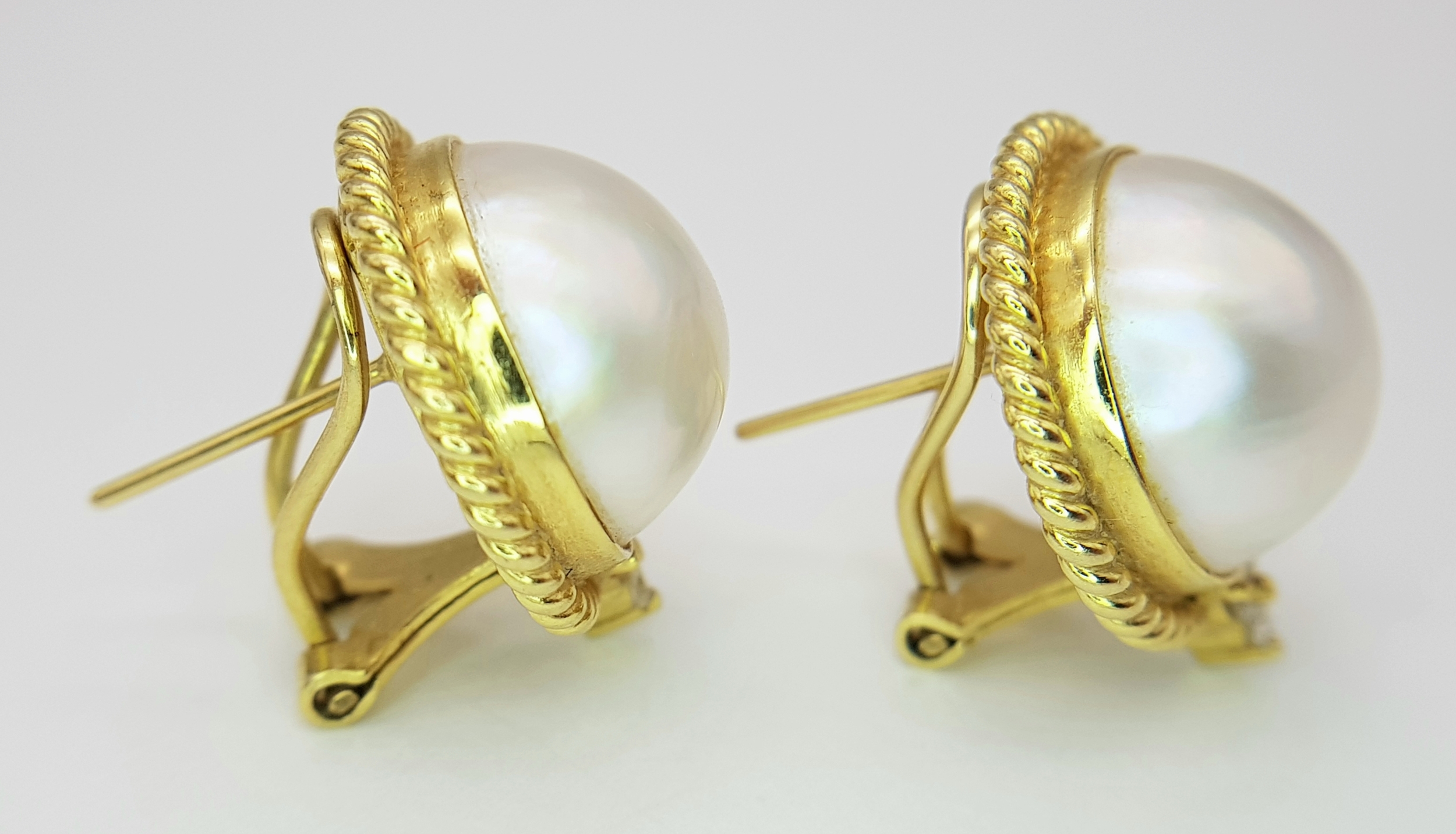 A Pair of 18K Yellow Gold, Mabe Pearl and Diamond Earrings. Beautiful pearl cabochons each with three round brilliant cut diamonds crowns. Post and spring clips. 18 x 20mm. 13.85g total weight. Ref: 11/76605.