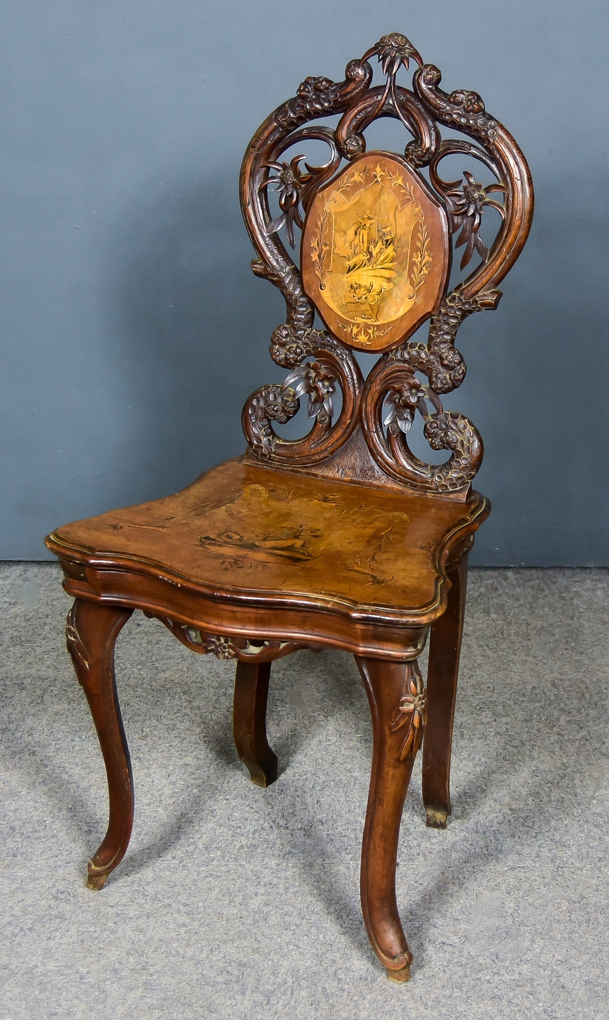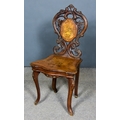 A Swiss Walnut Musical Chair, 19th Century, with bold leaf and fretted carved back of shaped outline, carved with Edelweiss, the back and seat with poker work decoration of stag and dog, shaped and moulded folded seat enclosing small musical box, by Geo Baker and Co., Geneve, Switzerland, 38ins overall