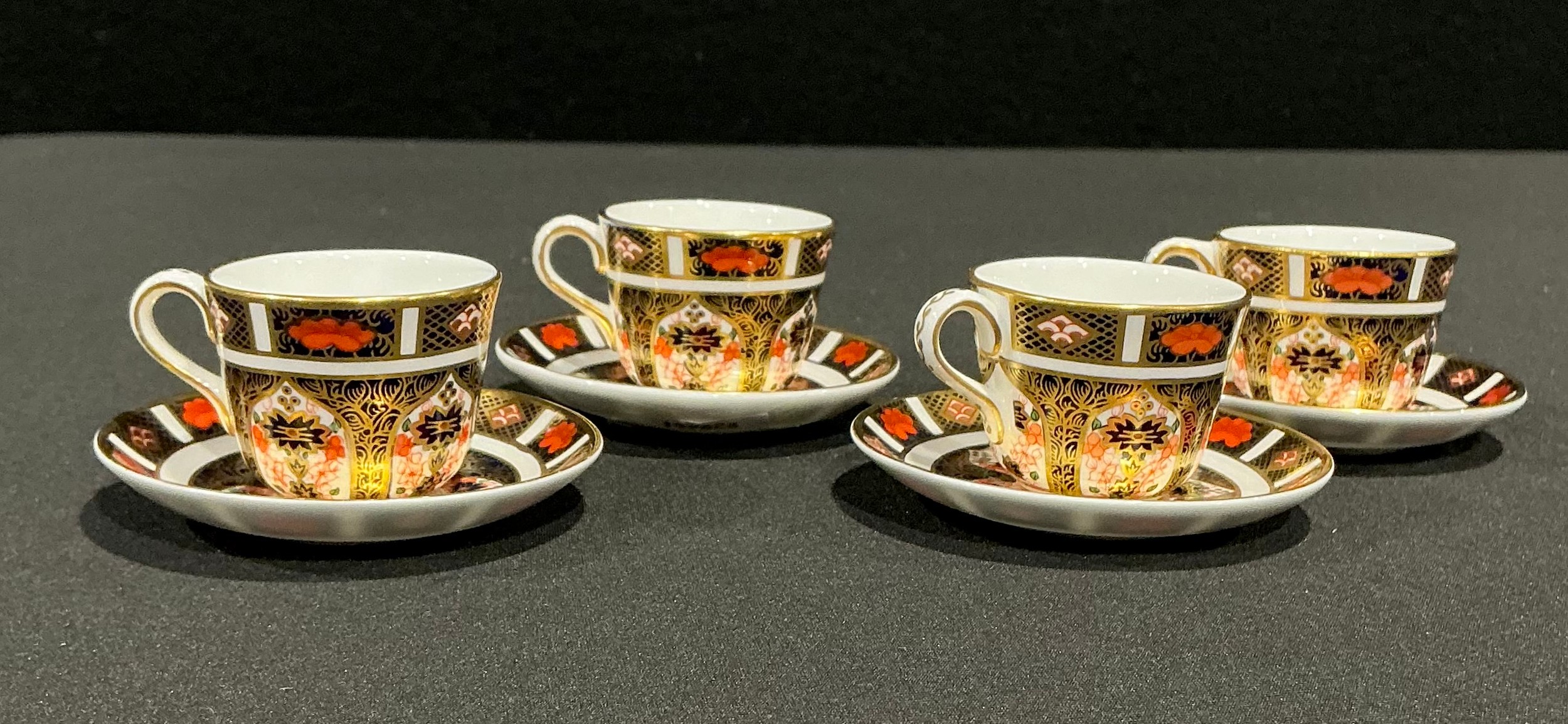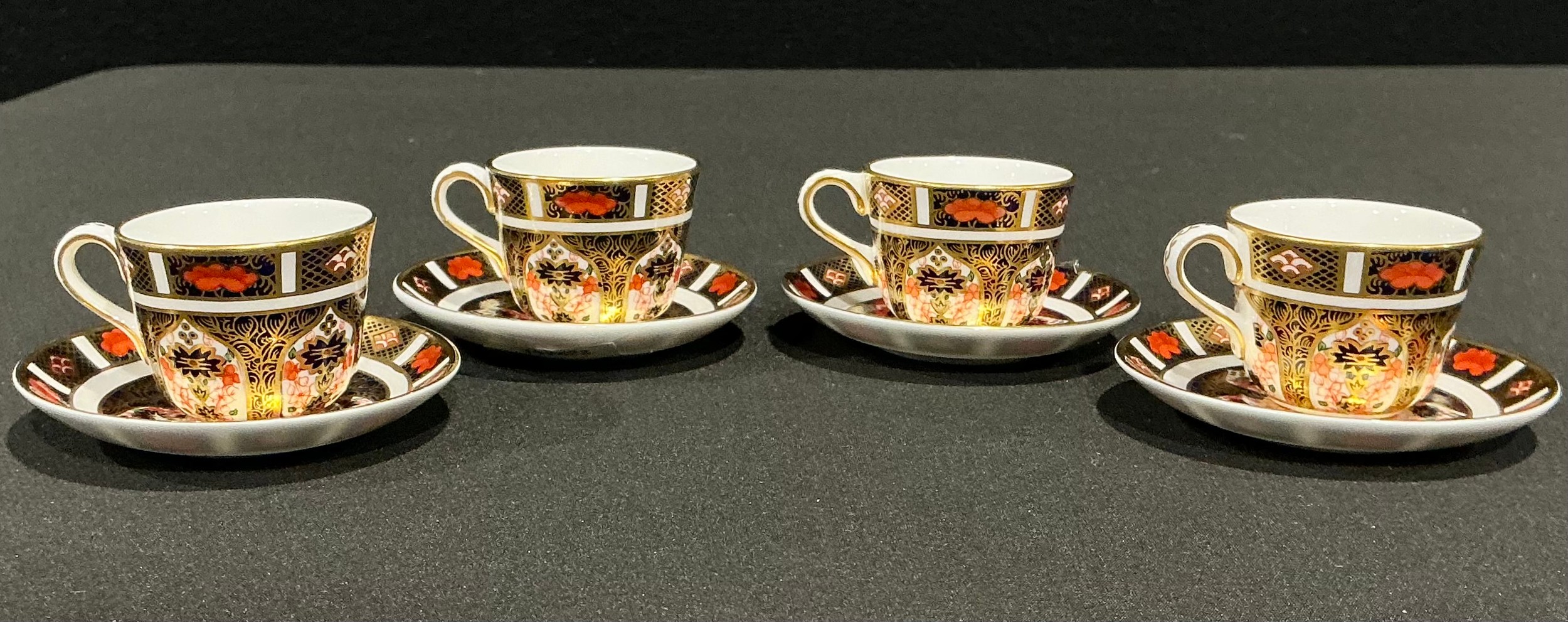 A set of four Royal Crown Derby Imari 1128 pattern miniature teacups and saucers, the cups 3.25cm, the saucers 7cm diameter, printed marks, all second quality