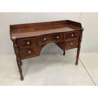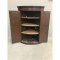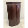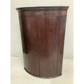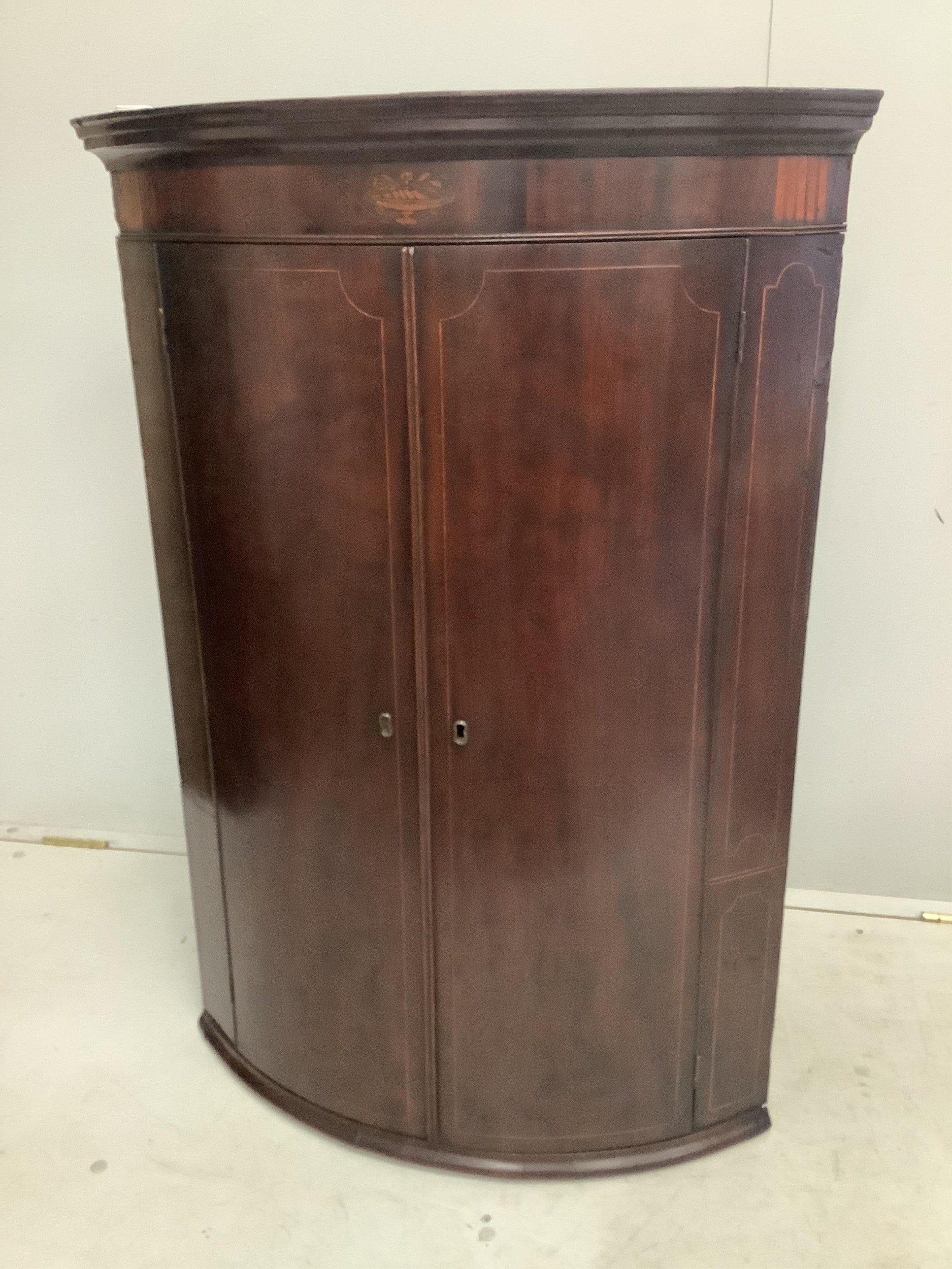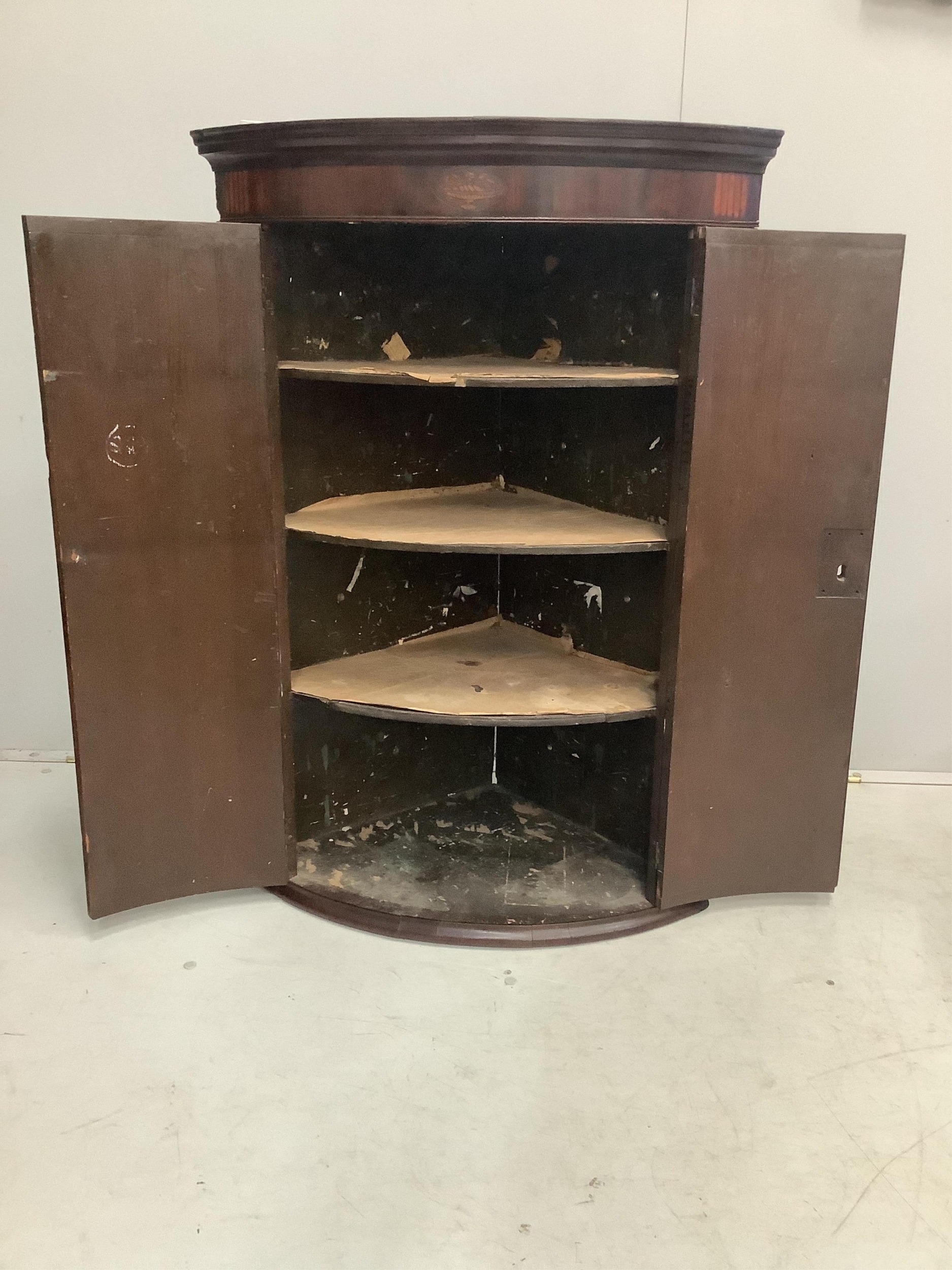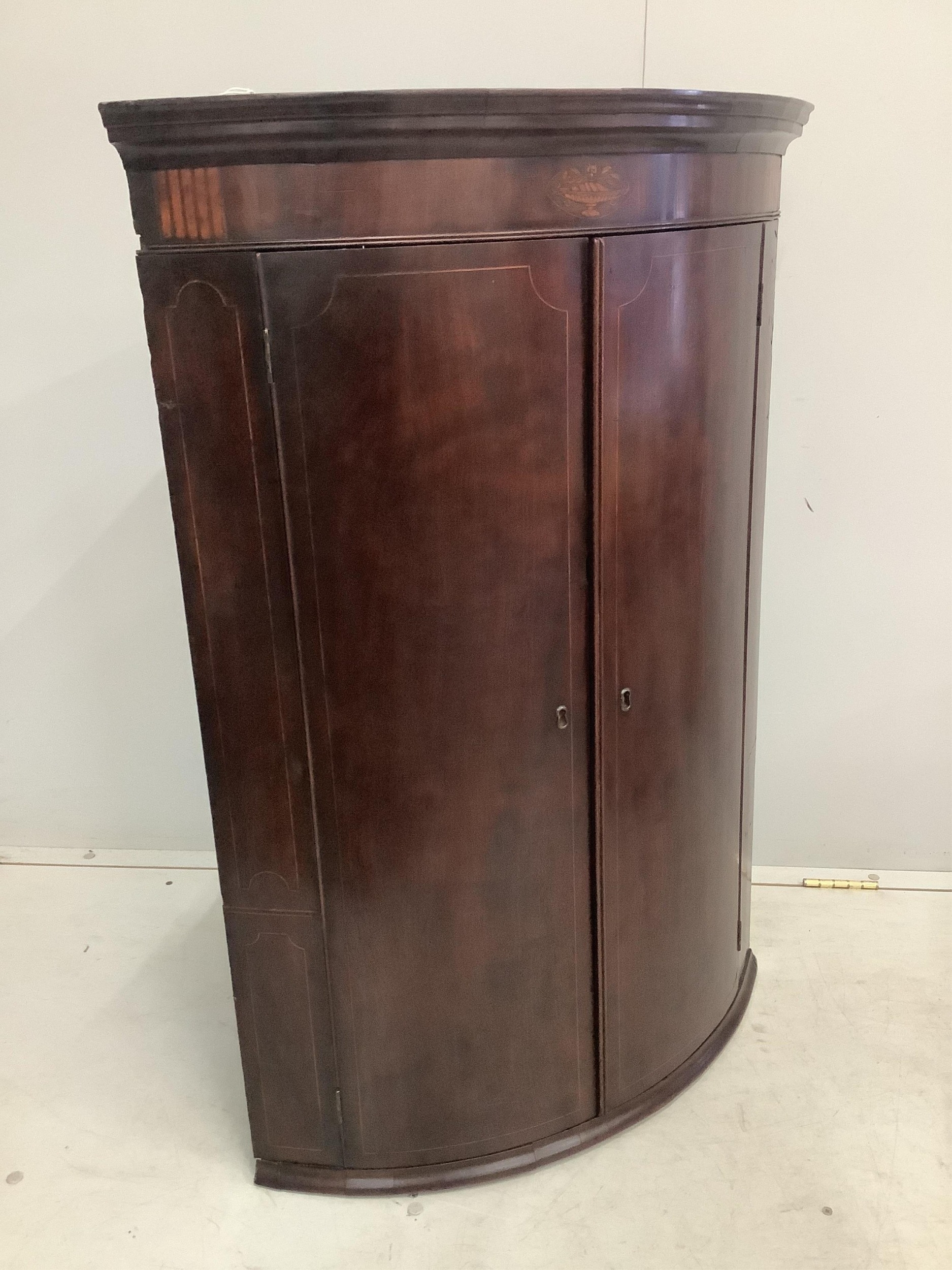 A George III inlaid mahogany bow front hanging corner cupboard, width 74cm, depth 50cm, height 107cm. Condition - fair to good