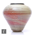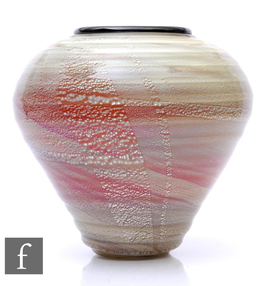 Flavio Poli - Seguso Vetri D'Art - A large later 20th Century Italian Murano glass vase of shouldered ovoid form with tapered ribbed conical body, cased in clear crystal over opal with an applied deep magenta rim, the body internally decorated with silver aventurine over a pale caramel ground, full engraved signature, height 30cm.