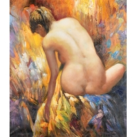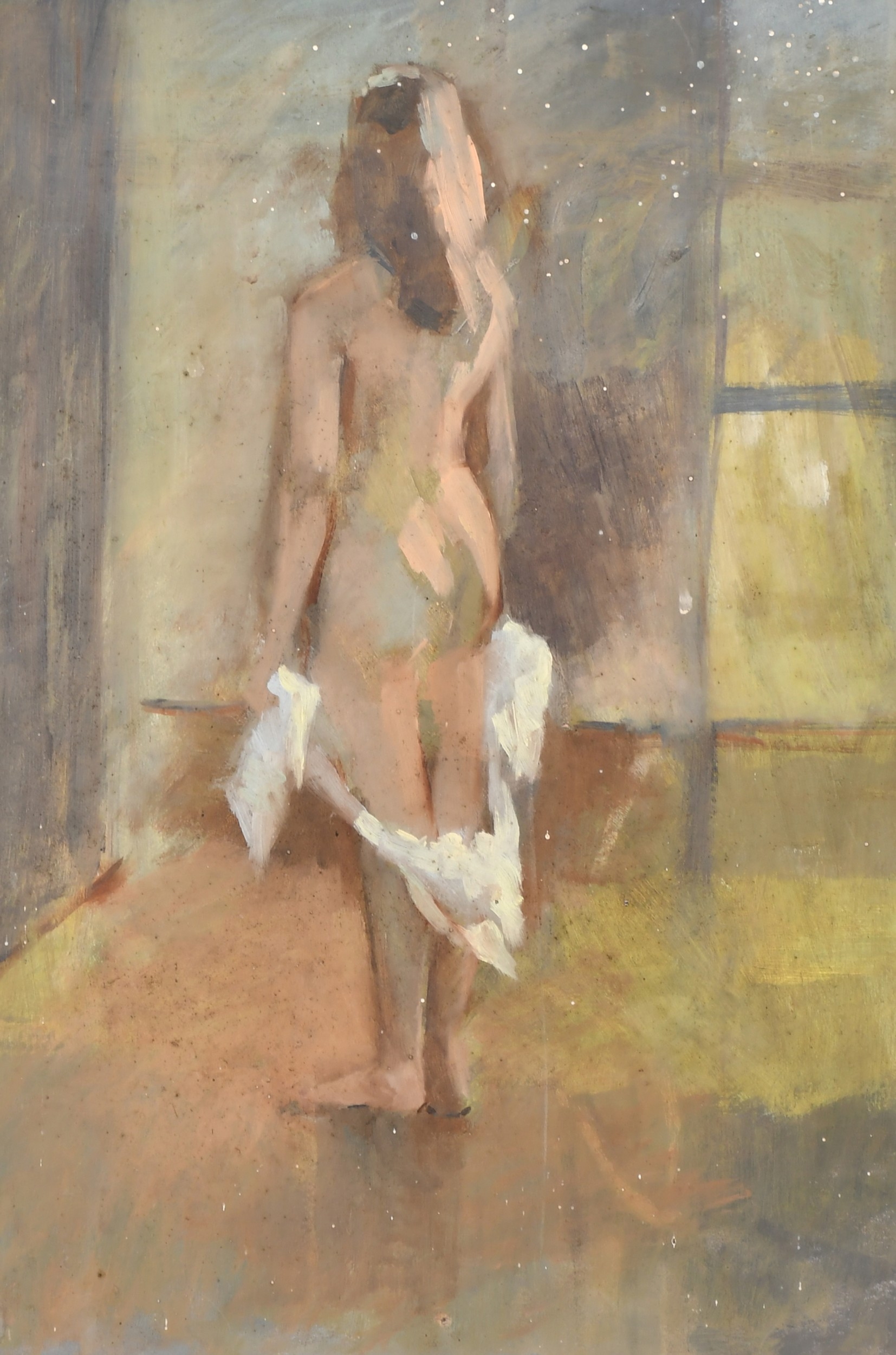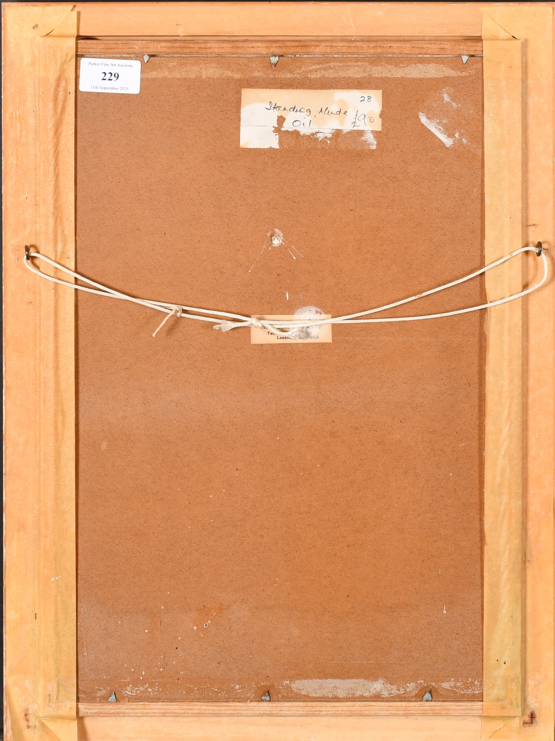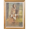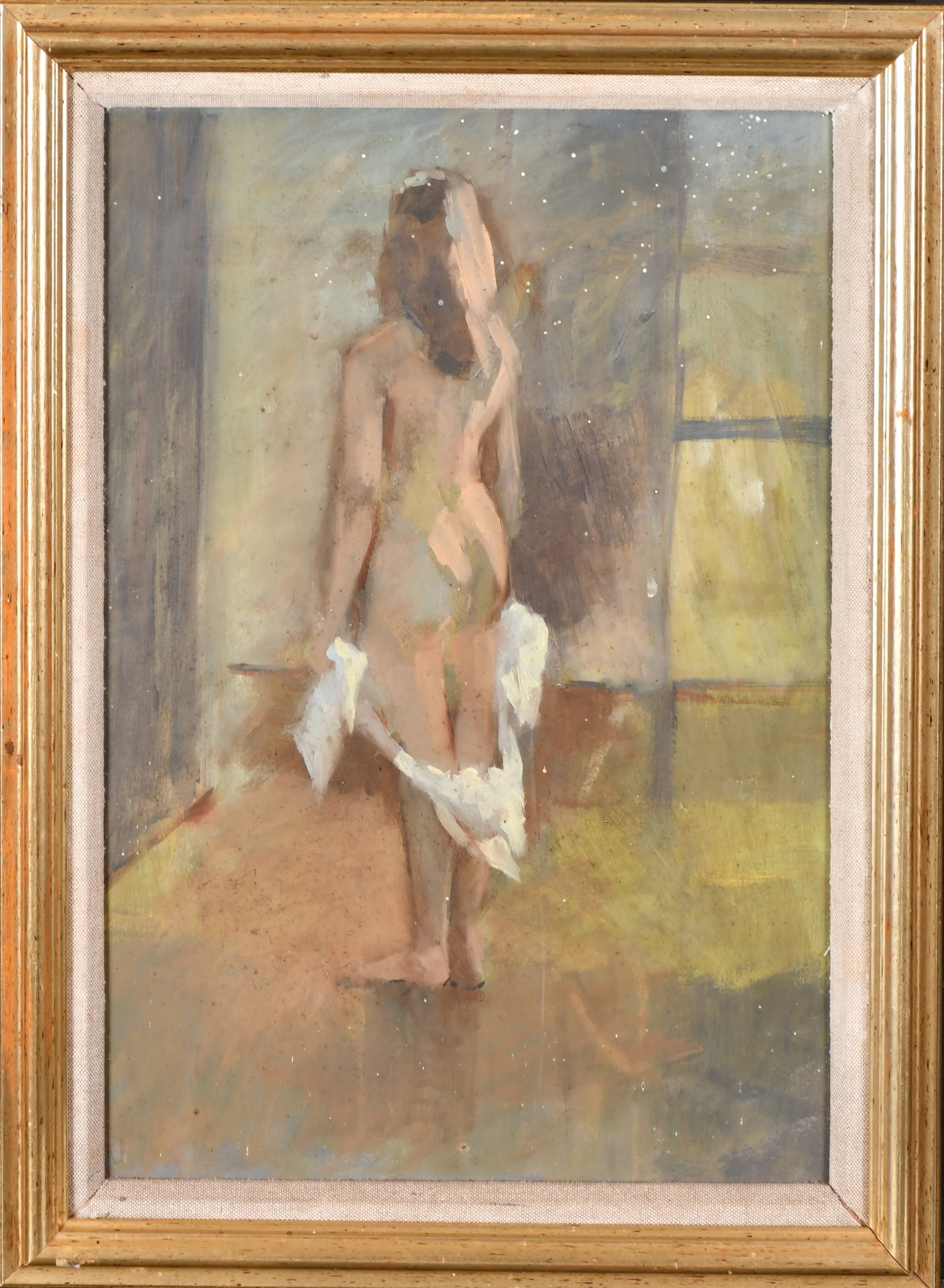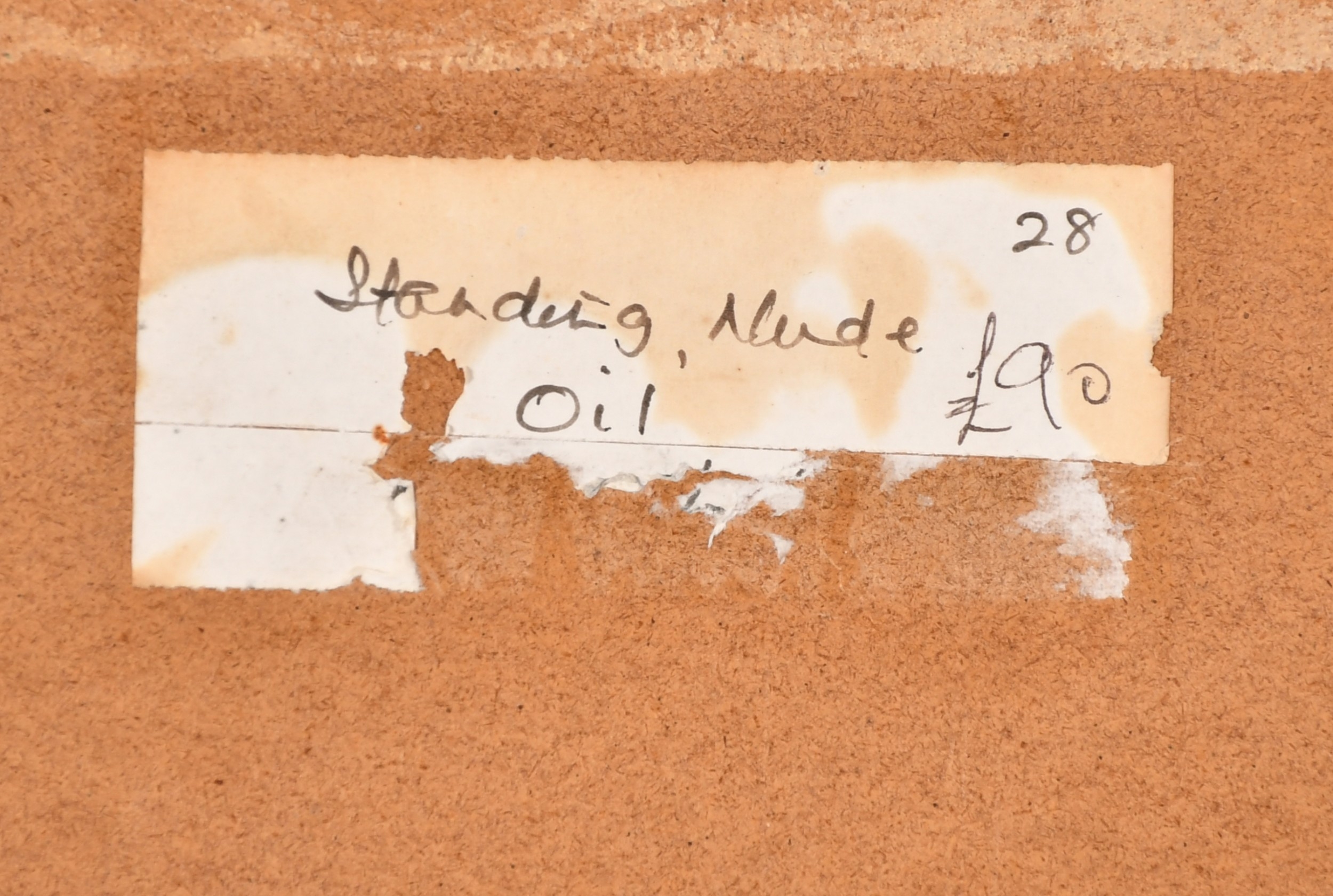 Attributed to Bernard Dunstan (1920-2017) British. Standing Nude, Oil on board, Inscribed on a label verso, 16" x 11" (40.6 x 27.9cm)