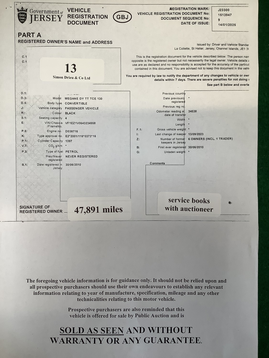 A 2010 Renault Megane Dynamique TCE 1.4 convertible J23300 (petrol/manual), odometer reading 47,891 miles