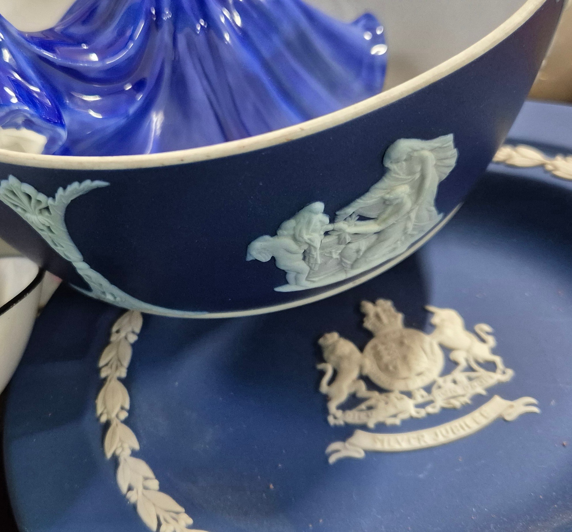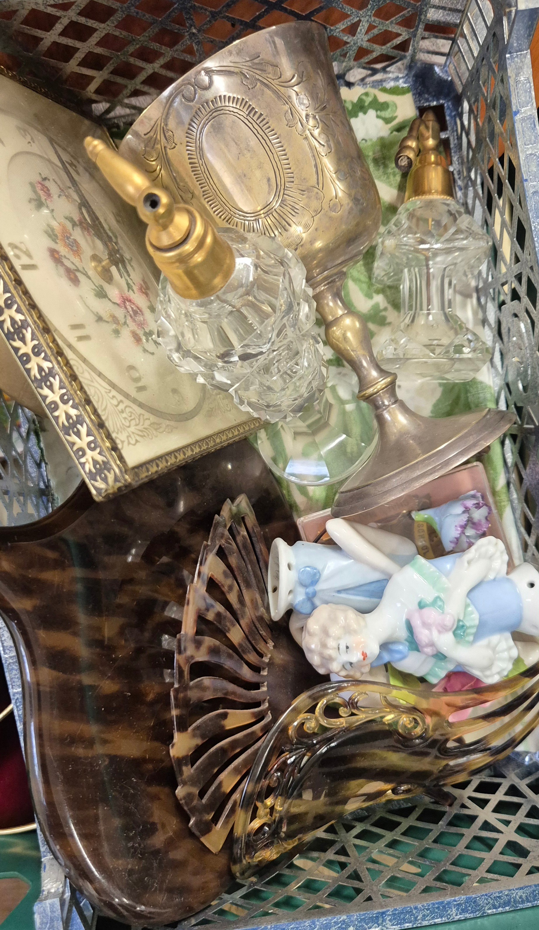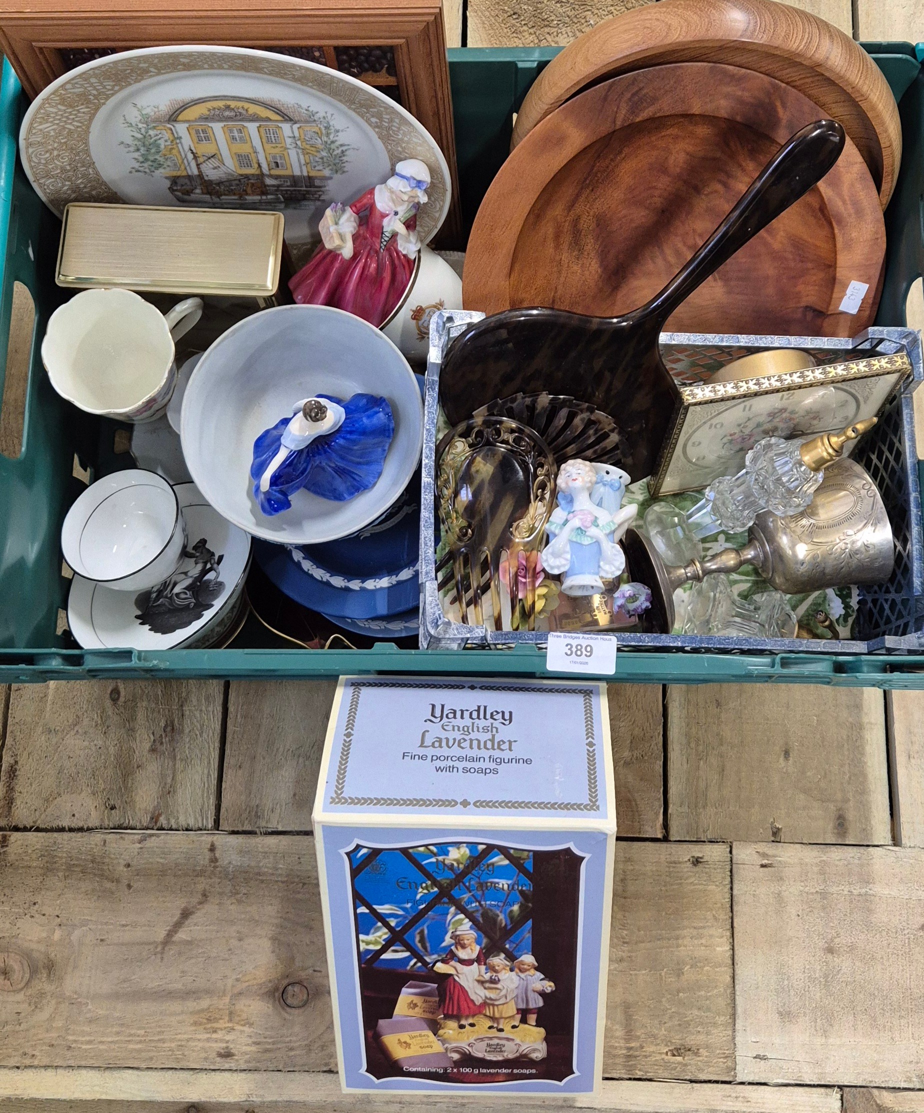 A Crate of collectables; Royal Doulton Figures, Regency cup and saucer depicting mother and child. Cut crystal scent bottles and wooden bowl detailed with Paua shell by Rupert Newbold.