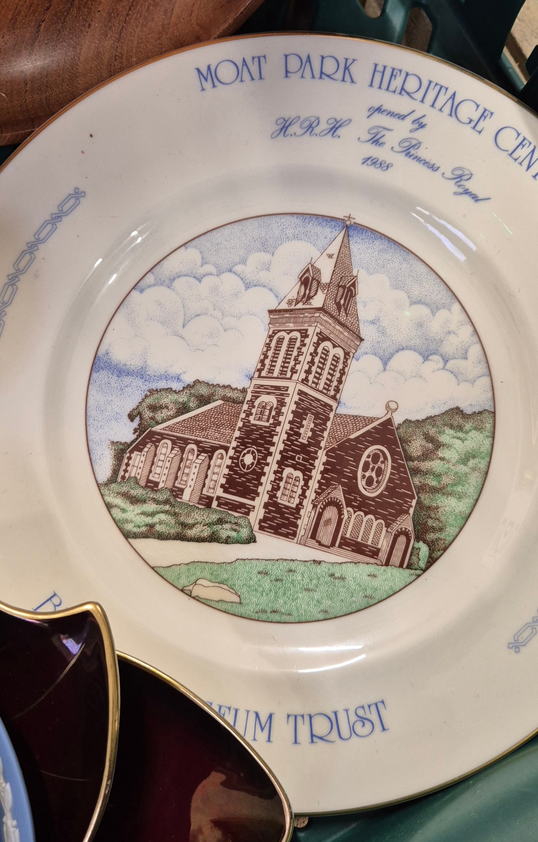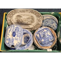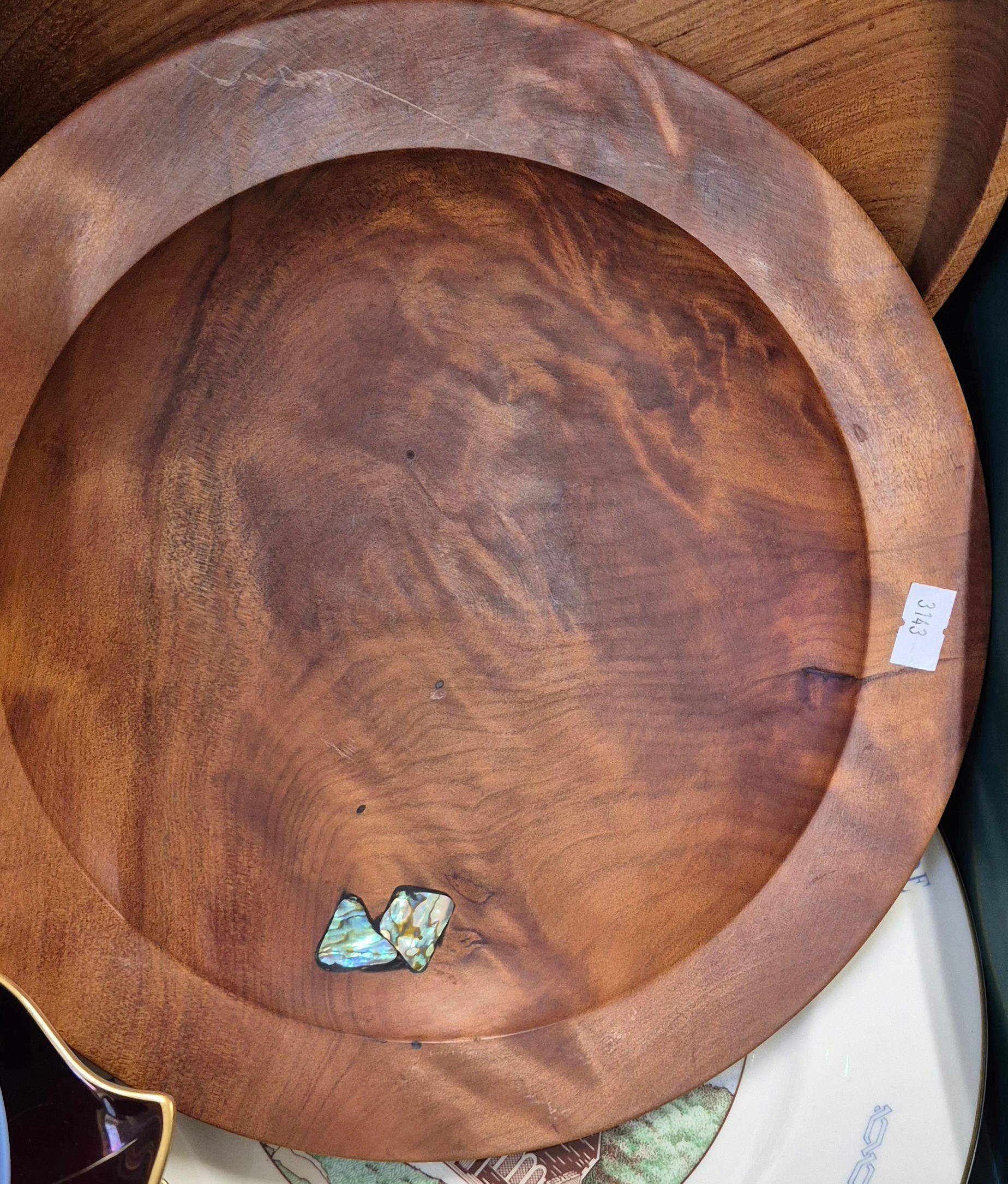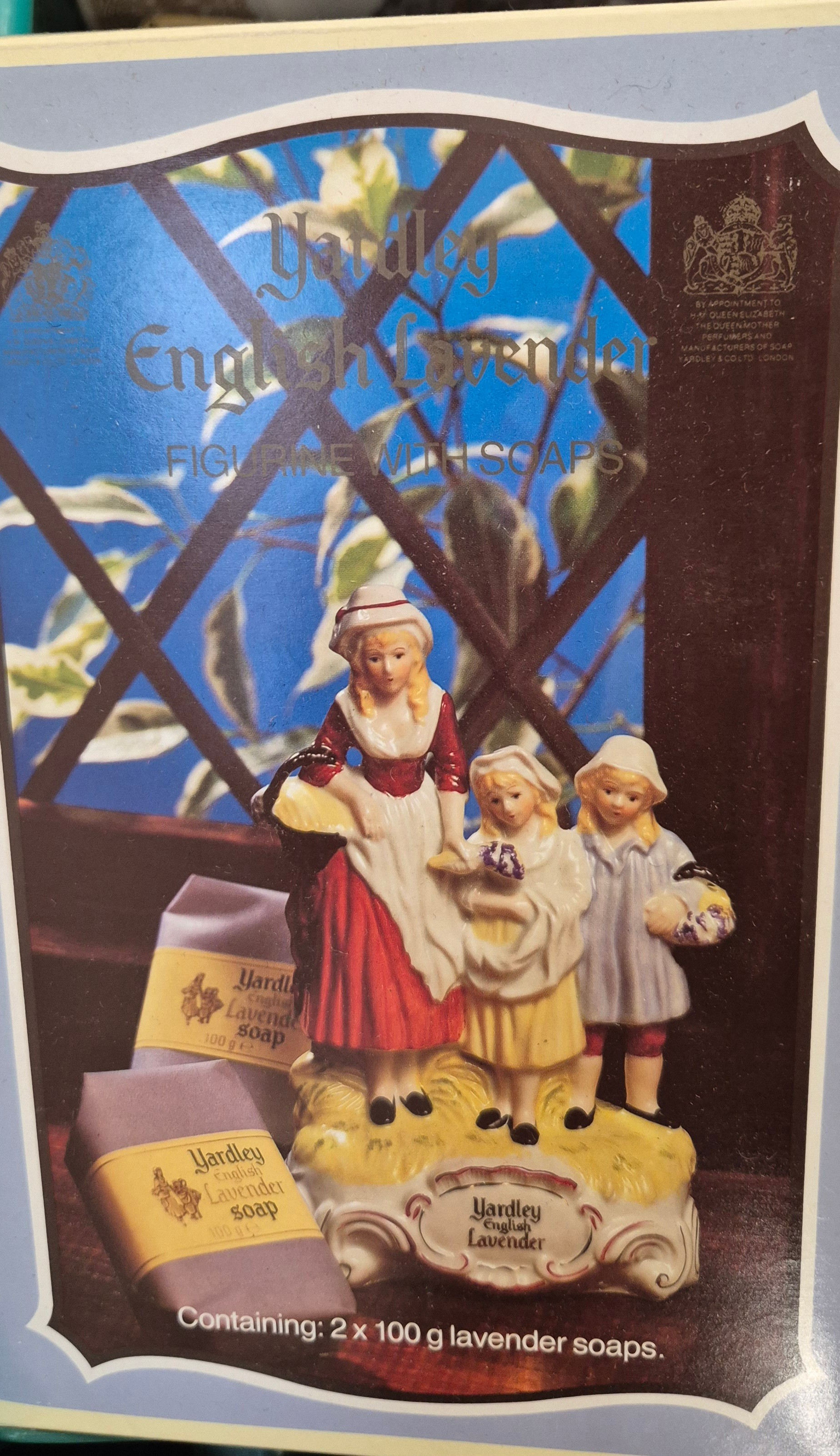 A Crate of collectables; Royal Doulton Figures, Regency cup and saucer depicting mother and child. Cut crystal scent bottles and wooden bowl detailed with Paua shell by Rupert Newbold.