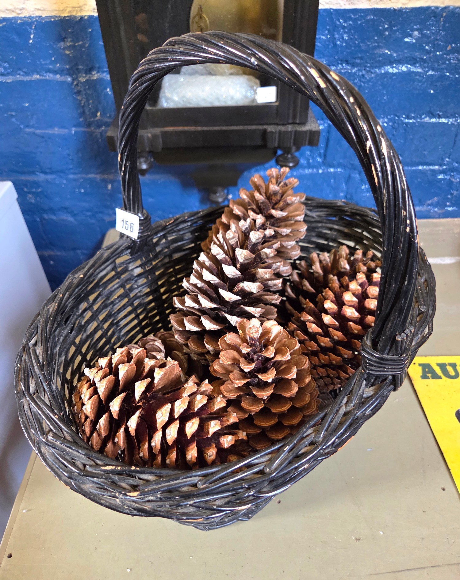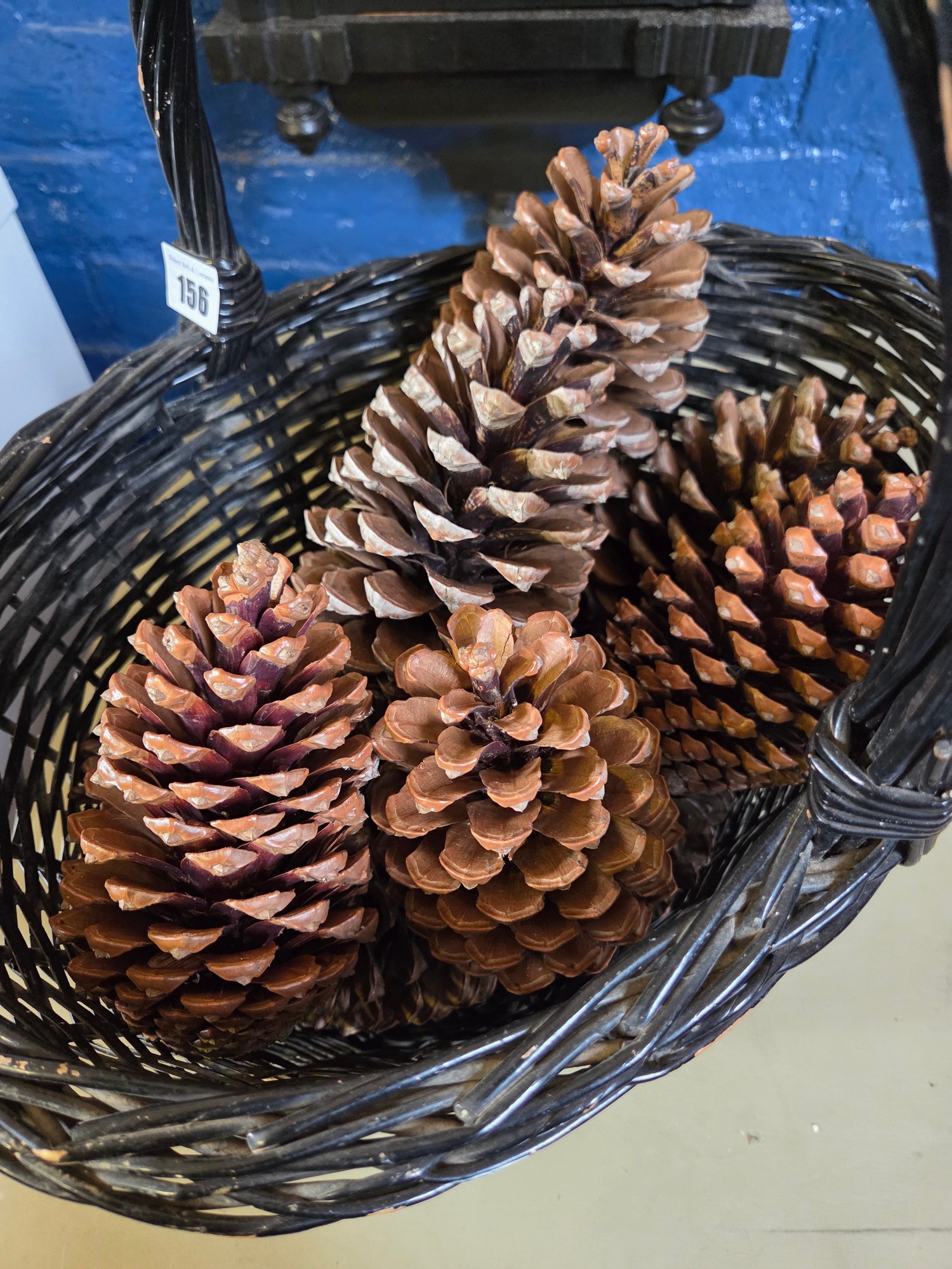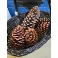 Painted wicker basket containing giant pinecones