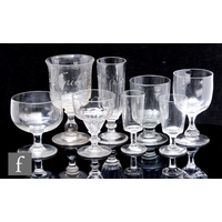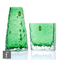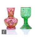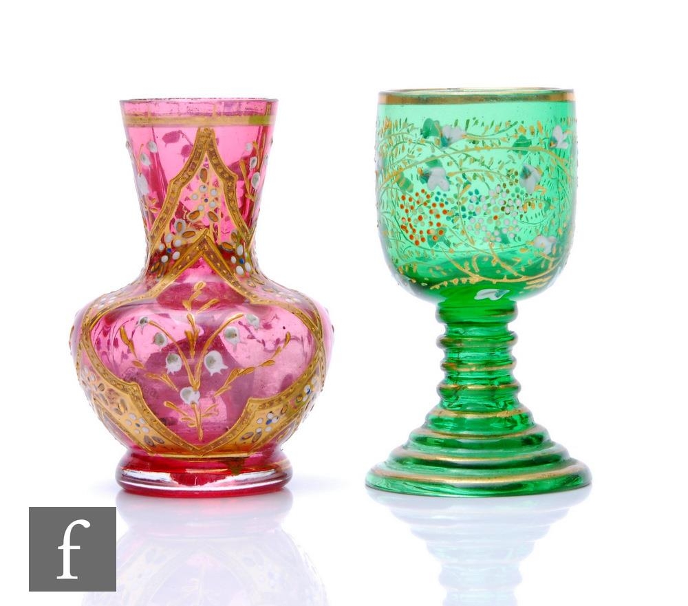 Two small cabinet pieces of glass attributed to Moser comprising a goblet in green with enamel flowers and gilt banding, height 7cm, and a bud vase in ruby glass with white lily of the valley within gilt borders, height 6.8cm. (2)