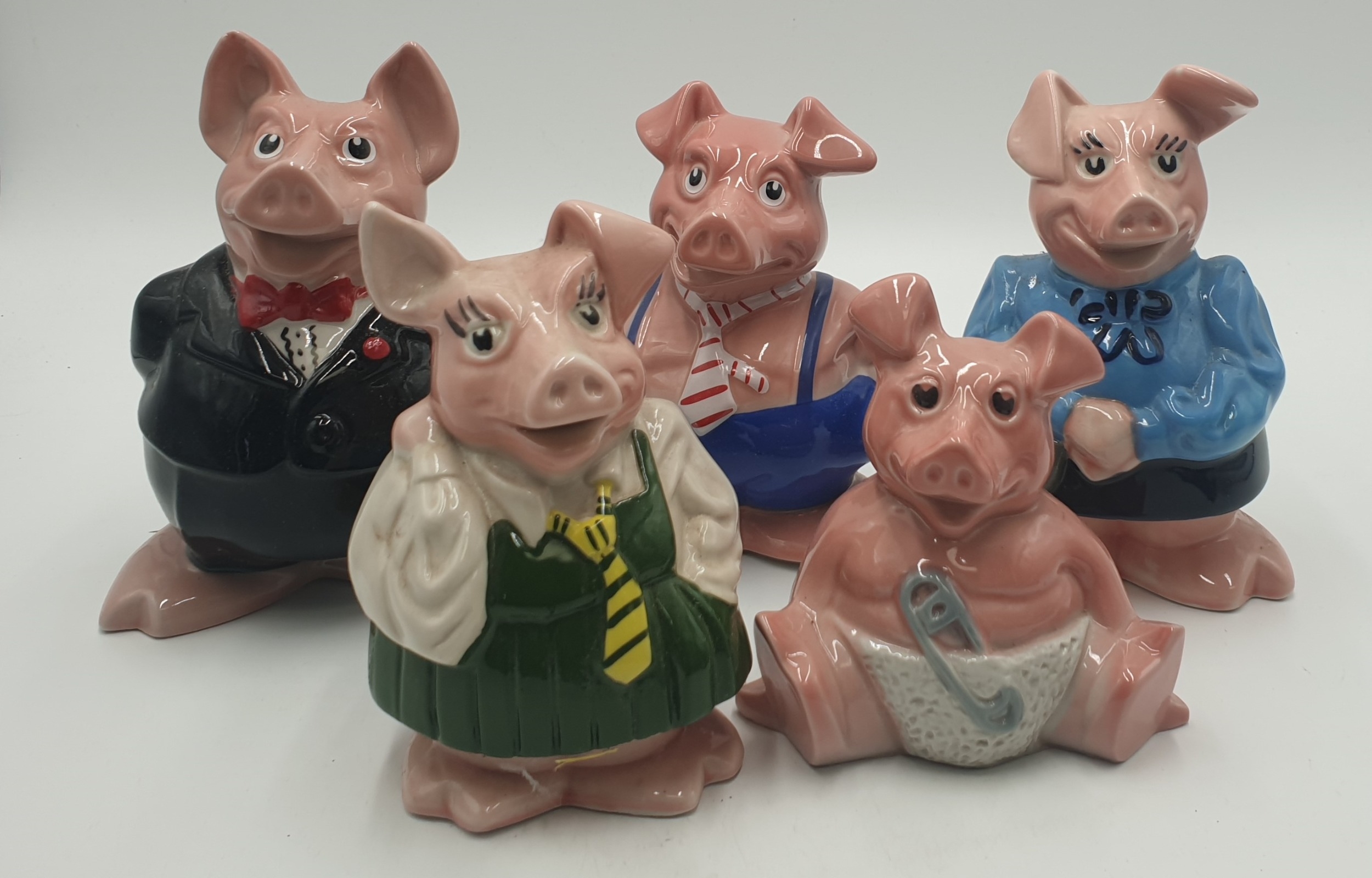 WADE SET OF FIVE NAT WEST PIG MONEY BOXES (BABY-"Woody",GIRL-"Annabel",BOY-"Maxwell",MOTHER "Lady Hilary" & THE FATHER-"Sir Nathaniel") 1984/89 (All Complete With They Original Nat-West Stoppers)