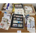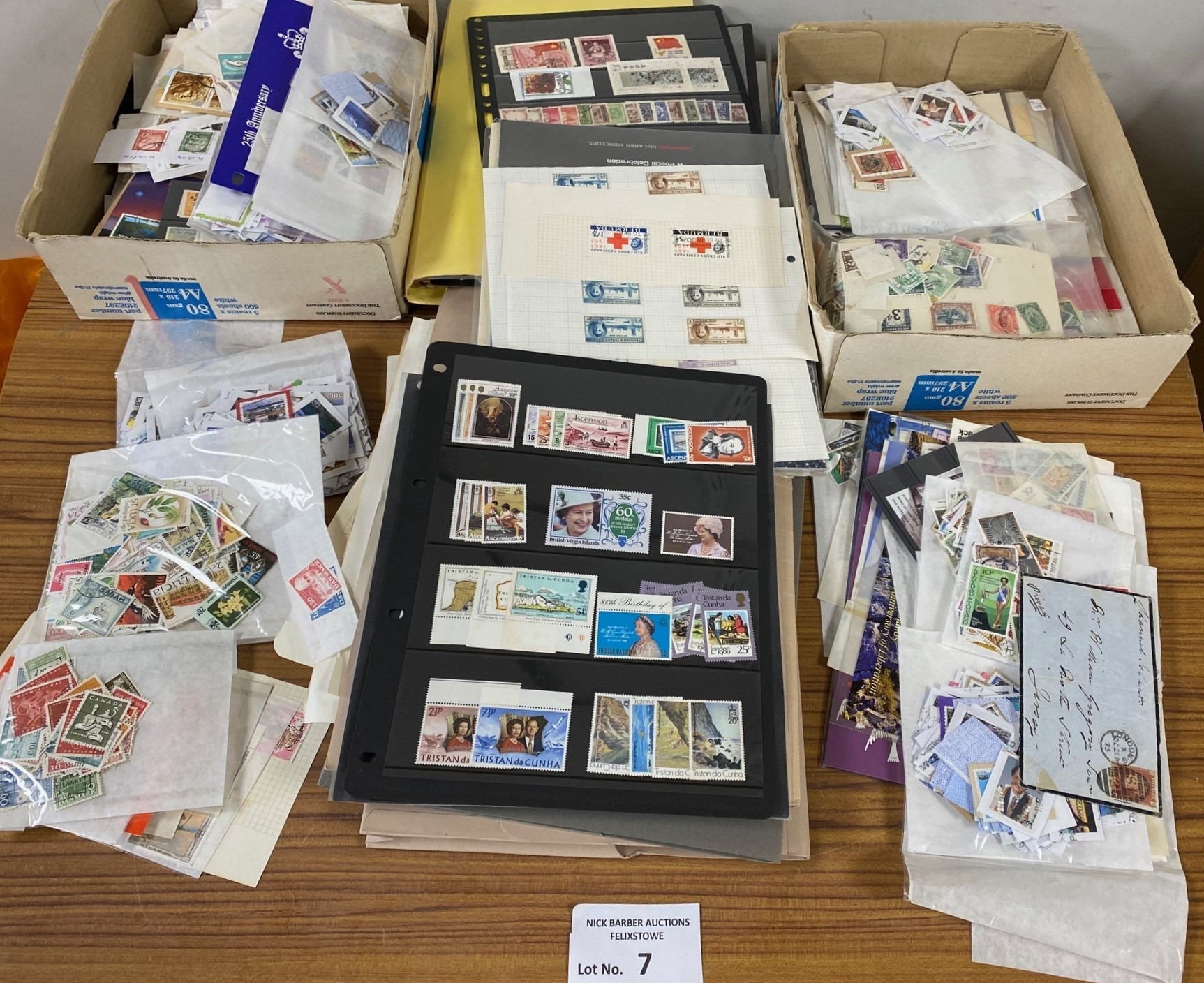 Stamps : Banana box of World and Commonwealth stamps in packets, sheets, hagners, stock cards, many 1000's.