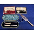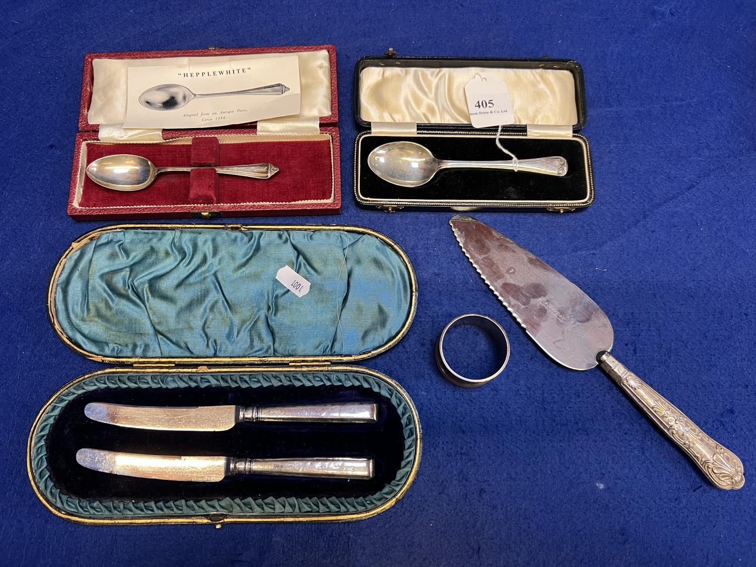 Two sterling silver spoons, two silver handled knife, a silver handled cake slice and a silver napkin ring