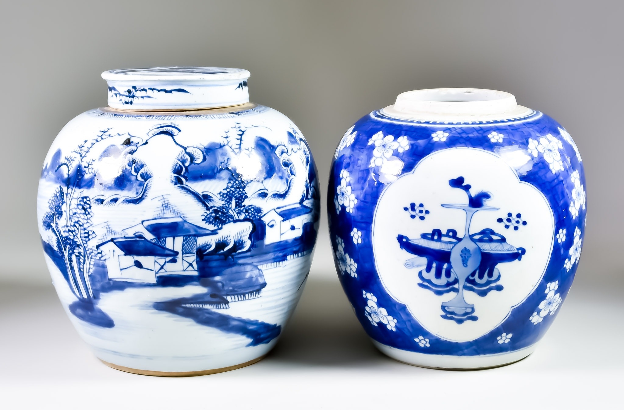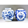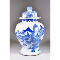 Four Pieces of Chinese Blue and White Porcelain, comprising - a ginger jar and cover, painted with a river landscape, 9.25ins (23.5ins), ginger jar painted with three reserves of vases and book, on a prunus blossom ground, 8.25 (21cm) high, cylindrical jar and cover, with metal boar finial, the whole painted with flower and fruit roundels, 8ins (20.3cm) high, and a baluster jar and cover, with kylin finial, four kylin head lug handles, and painted with stylised leaves, 13ins (33cm) high