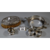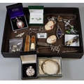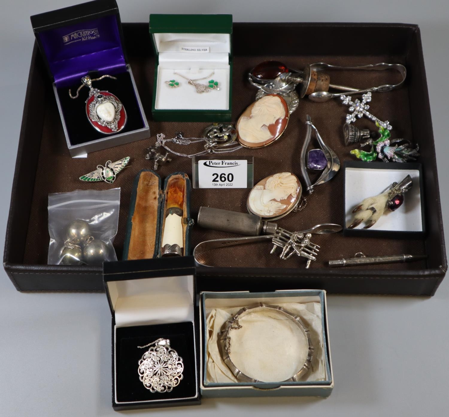 Box of assorted silver items to include a Charles Horner enamelled brooch, Alice Caviness pendant, two silver scent bottles and a pencil, etc.