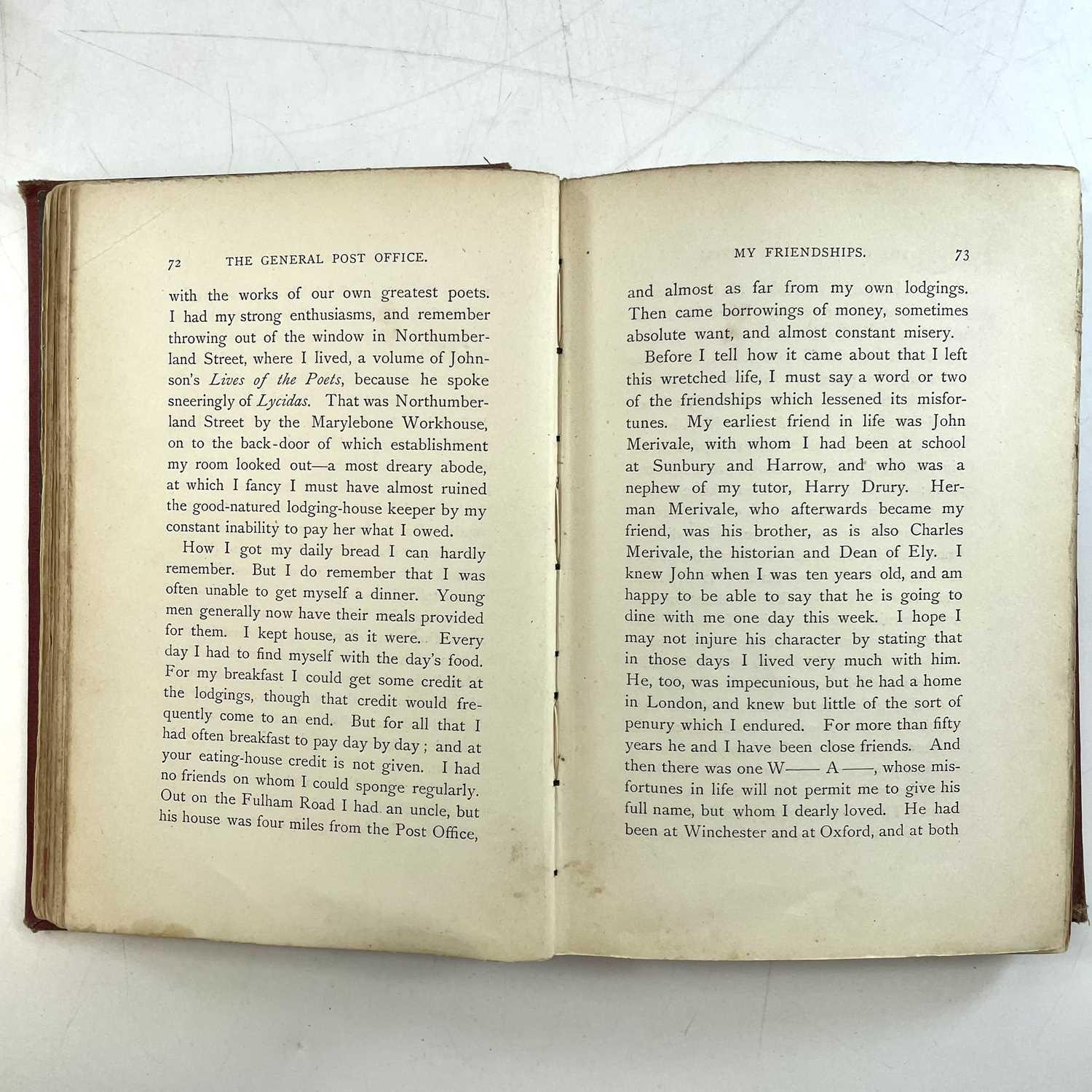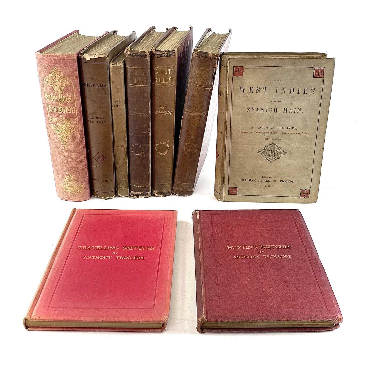 ANTHONY TROLLOPE. 'An Autobiography,' three vols, original cloth, rubbed and bumped, cracked joints, author engraving frontis, William Blackwood and Sons, Edinburgh, 1883; 'Travelling Sketches,' first book edition, original cloth, Chapman and Hall, 1866; 'The Warden.' 1859; 'The Bertrams,' 1860; 'The West Indies and the Spanish Main,' 1862; 'The Small House at Allington,' 1864; 'Hunting Sketches,' 1865; (9)