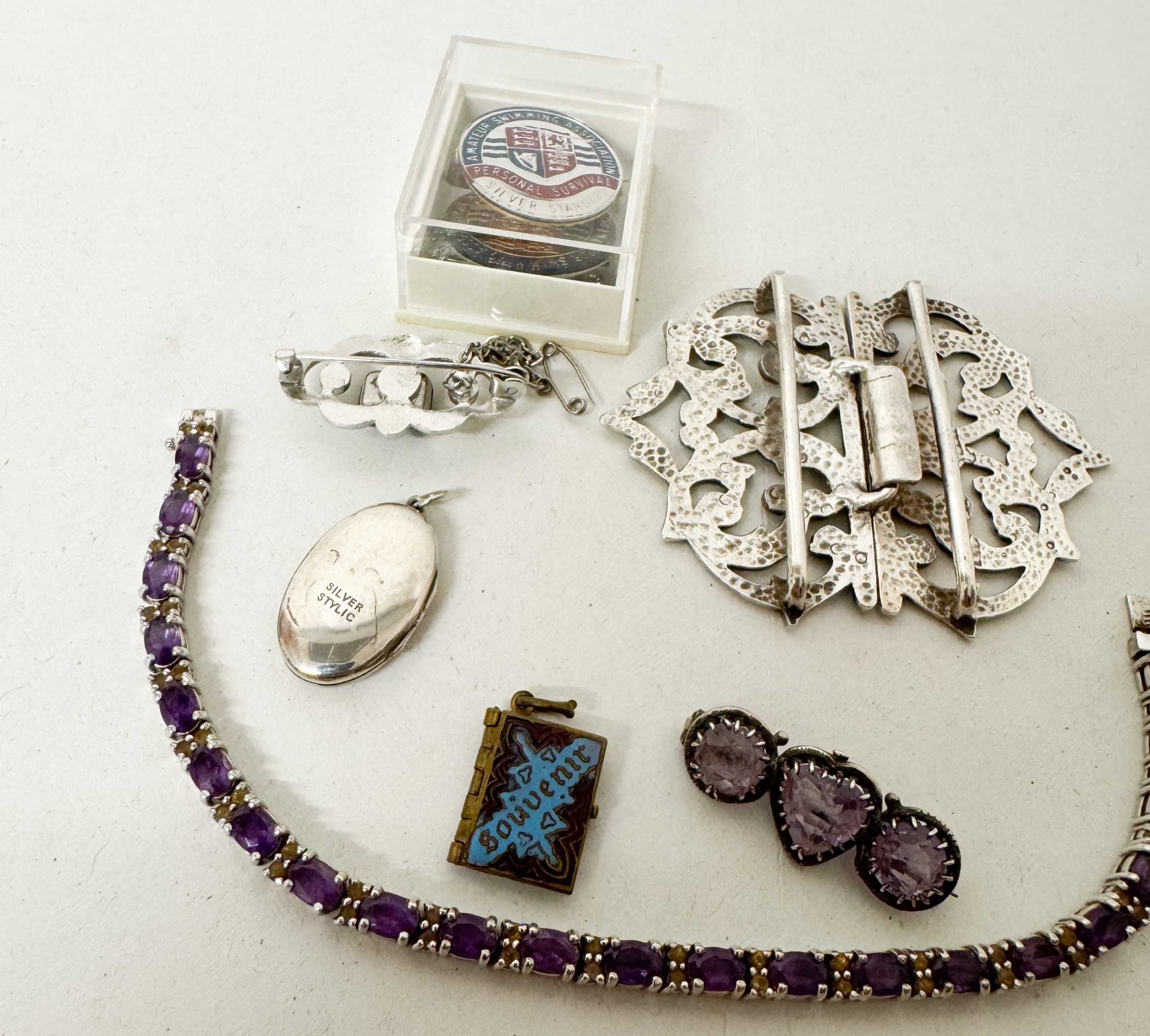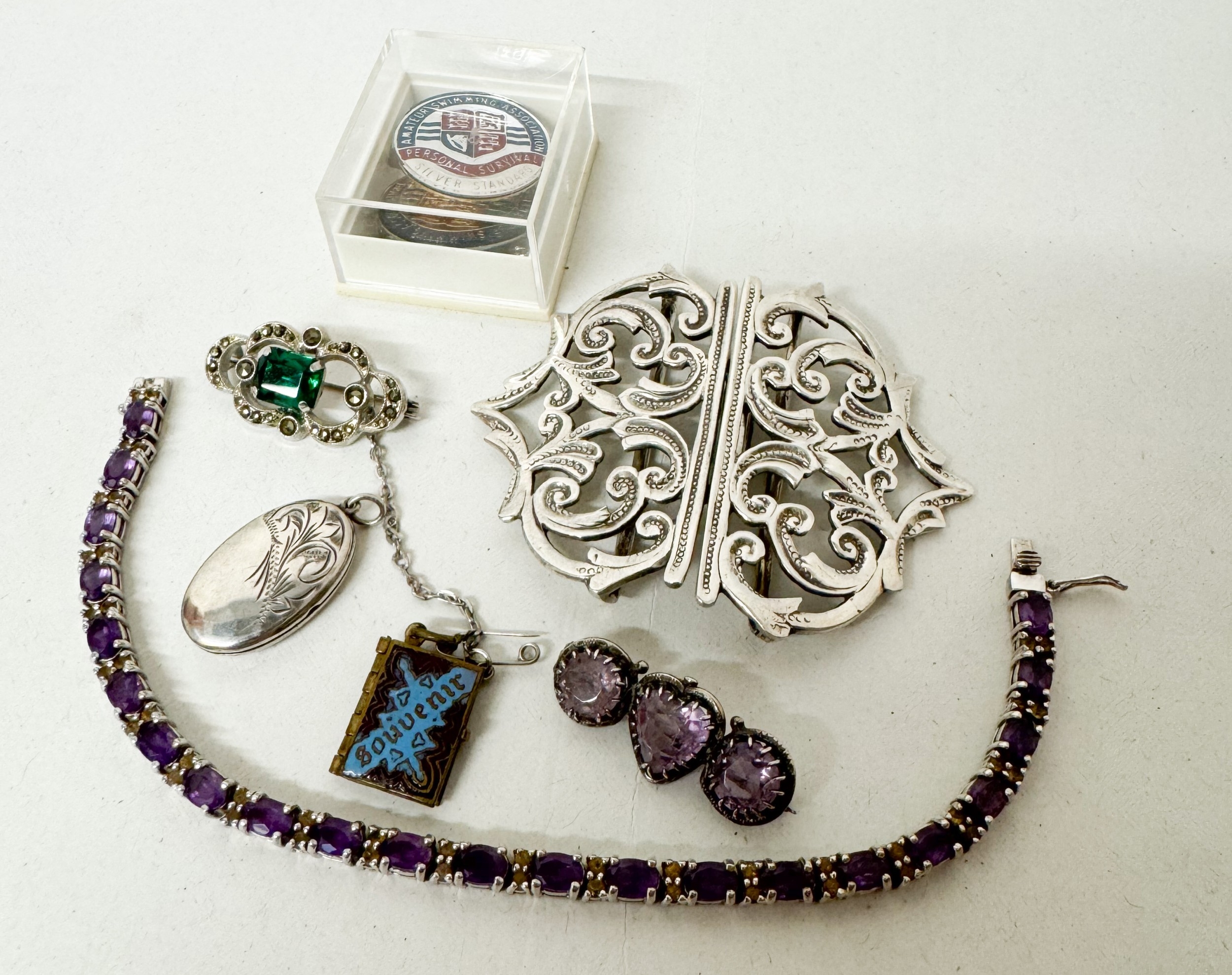 A hallmarked silver nurses buckle - 32g, a silver and amethyst line bracelet, sweetheart brooch, silver locket and other items.