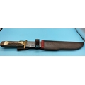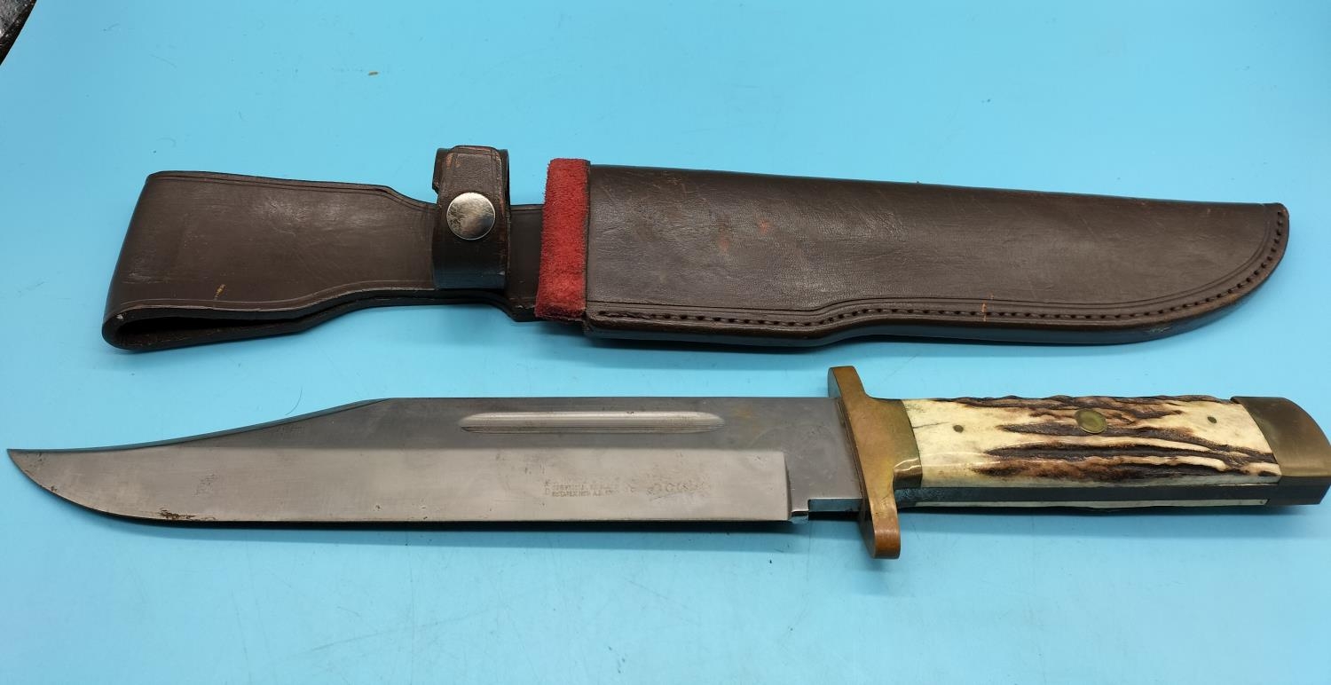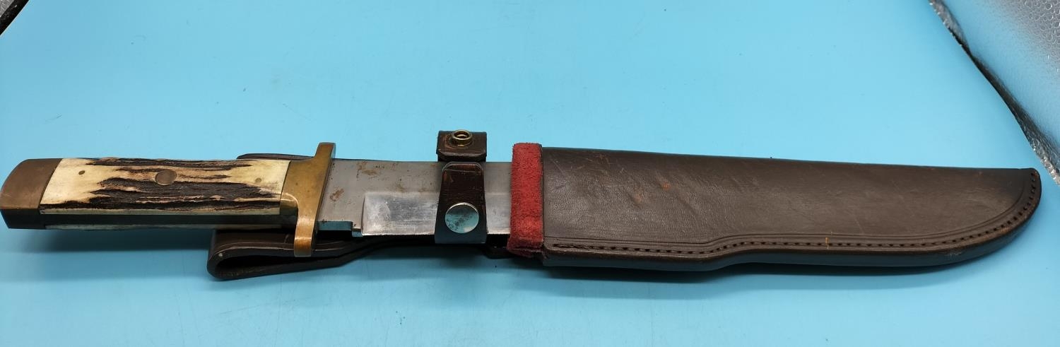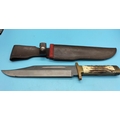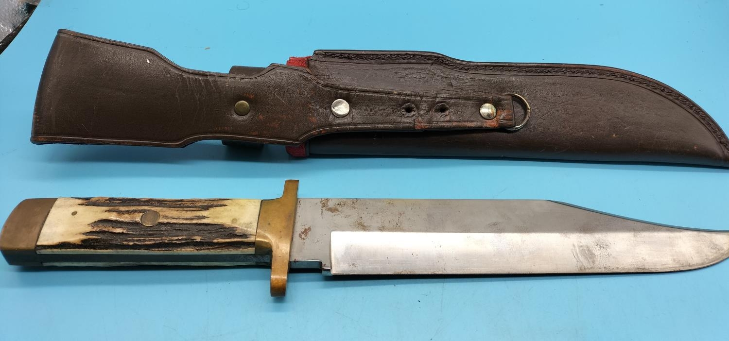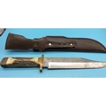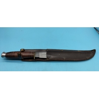 Vintage Bowie Knife with Bone Handle in Leather Sheath. 39cm Long.